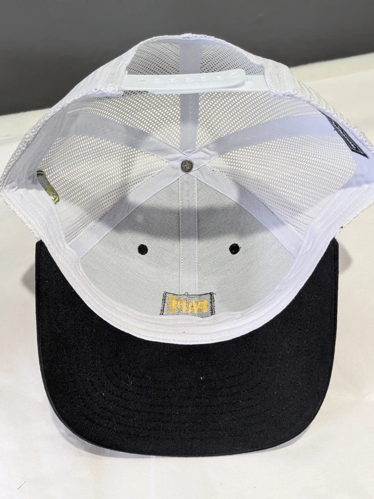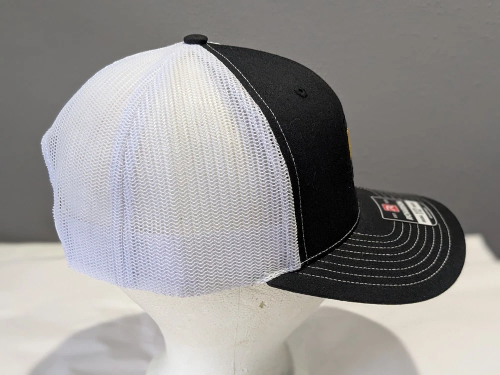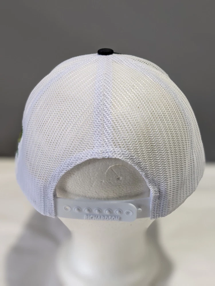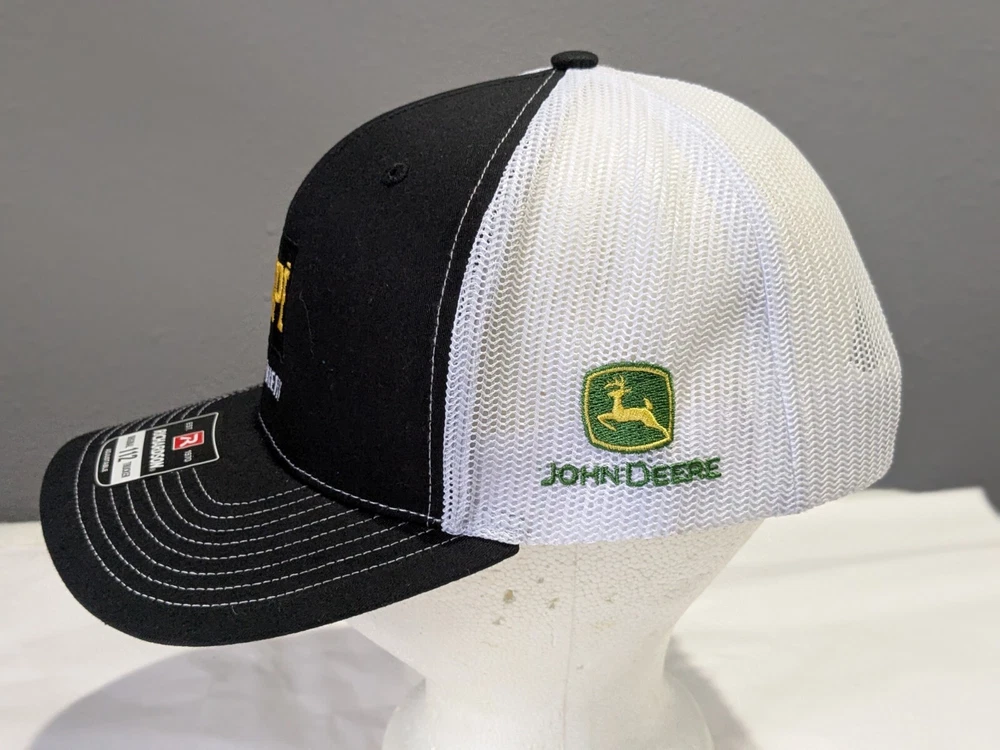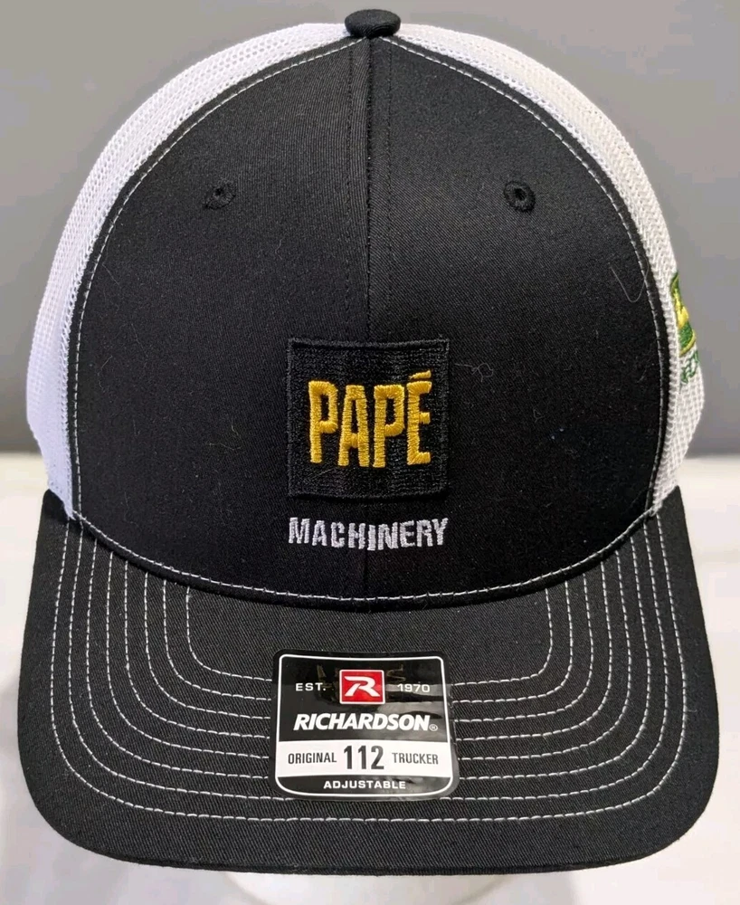 This is a Richardson brand trucker hat featuring a John Deere design from PAPE Machinery. The hat is black with a grey mesh back, adjustable in size for men. Made of polyester and cotton, it is lightweight and suitable for travel, farm & ranch, casual wear, and workwear. The hat has a classic dad and transportation theme, perfect for summer, fall, and spring seasons.