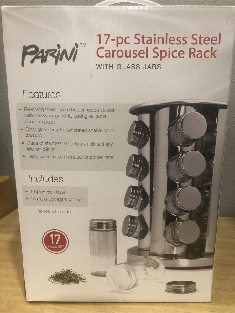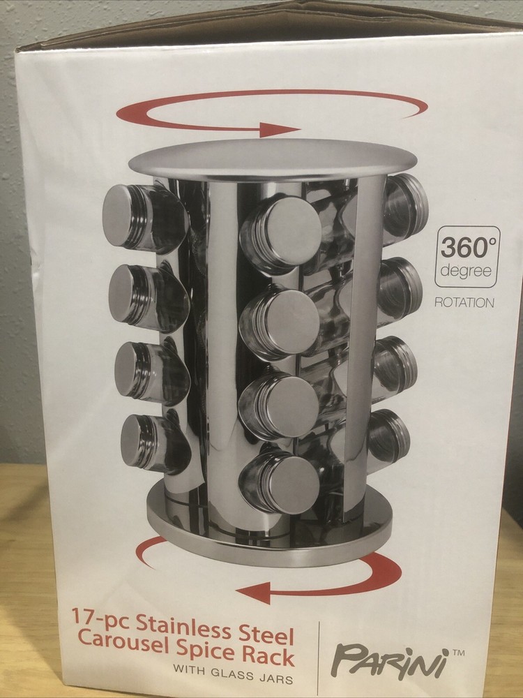 This is a Parini carousel spice rack with 16 glass jars, made of stainless steel. It has a round shape with a rotating base for easy access. The rack is free-standing and features a stainless steel finish. The dimensions are 8 inches in length, 8 inches in width, and 11 inches in height, weighing 7 lbs. It is brand new and perfect for organizing spices in the kitchen.