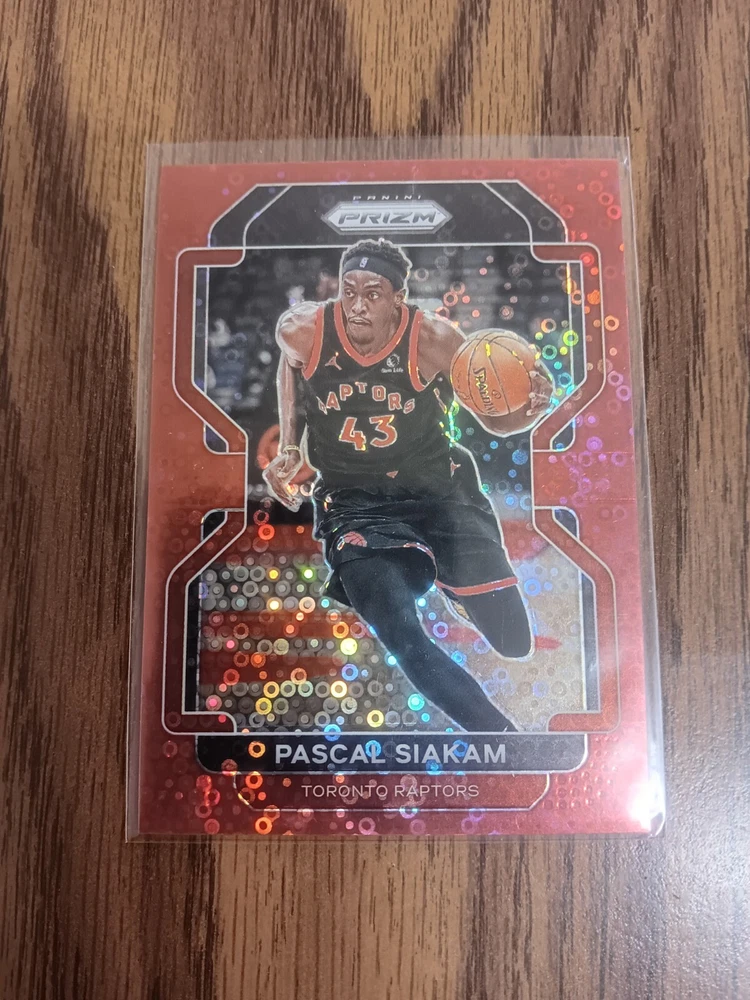 This is a rare and highly sought-after sports trading card featuring Pascal Siakam from the Toronto Raptors. The 2021-22 Panini Prizm Fast Break 174 card is a red disco parallel/variety, making it a unique addition to any collection. This card is serial numbered and part of a limited edition of only 100 copies, making it an extremely valuable item for any fan or collector. It is from the National Basketball Association (NBA) league and manufactured by Panini. The card showcases Siakam's talent and is a must-have for any fan of the sport.