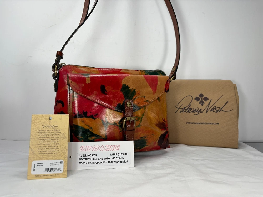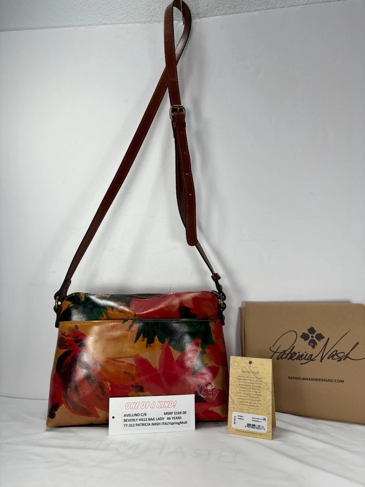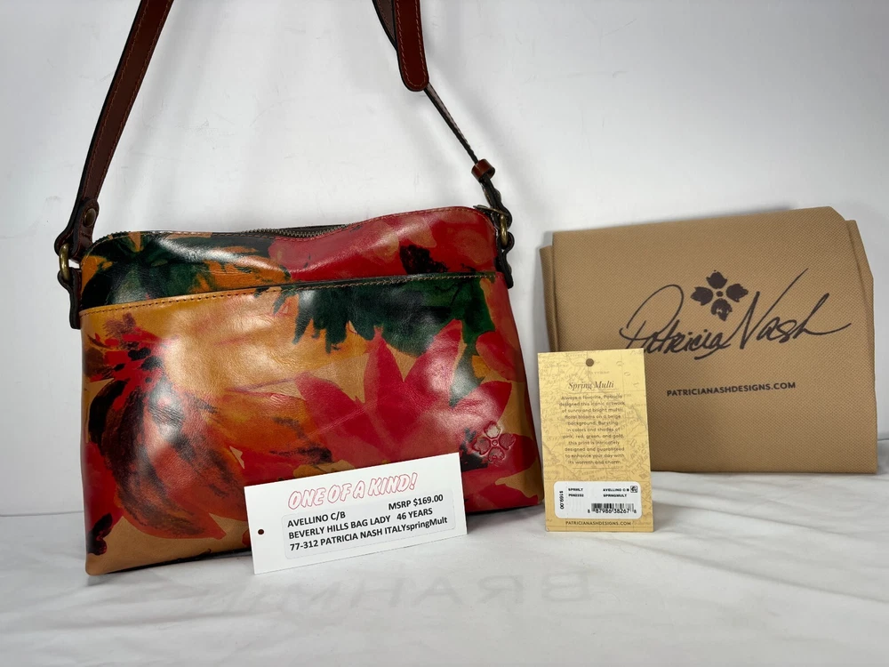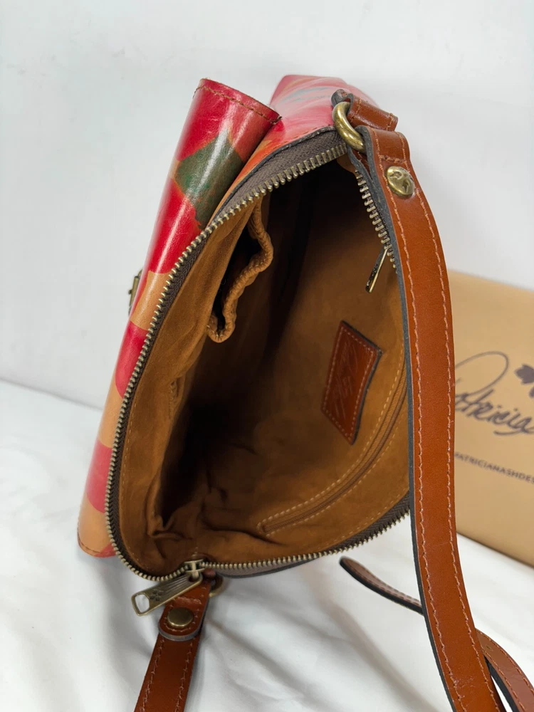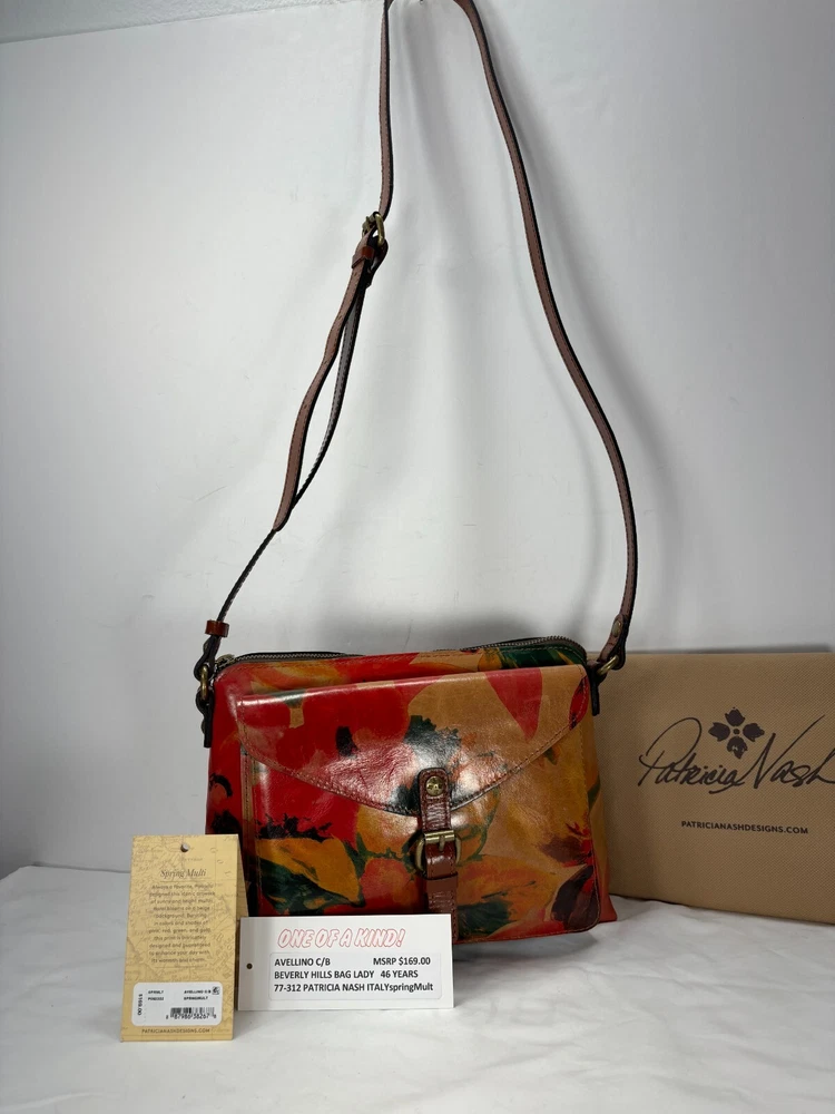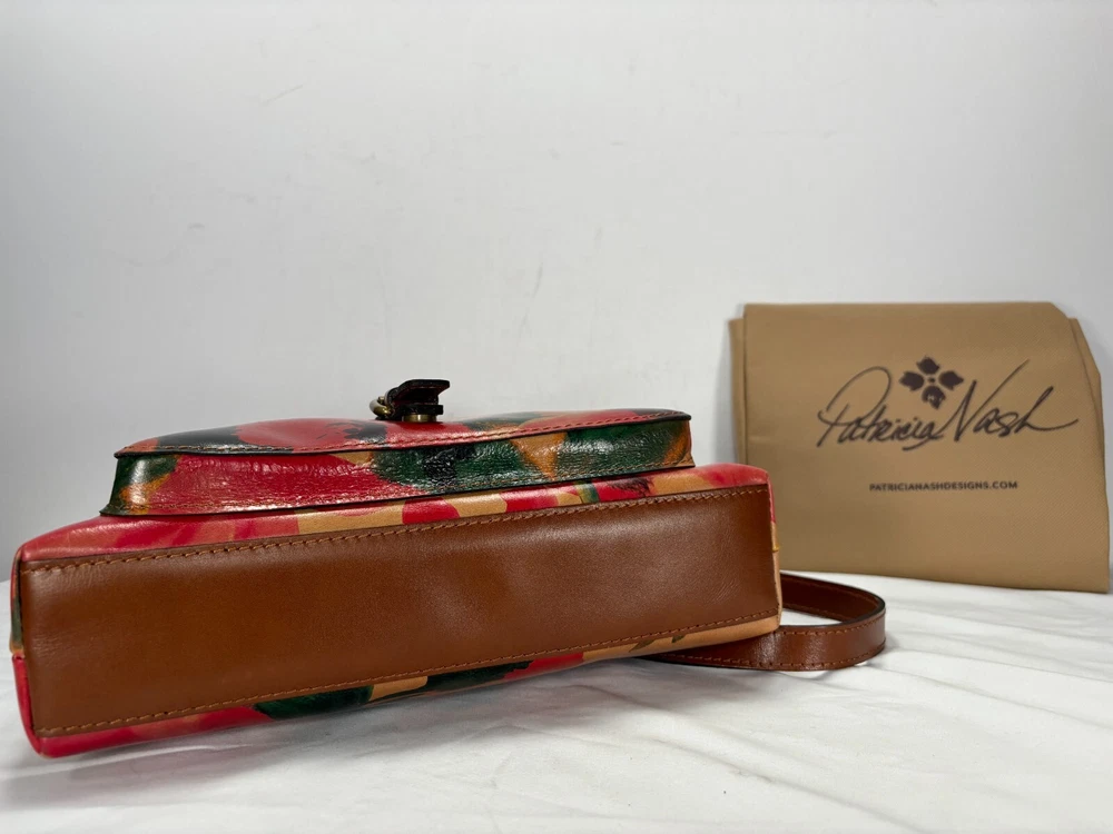 This Patricia Nash Italy crossbody bag is perfect for any occasion. With a beautiful multicolor exterior and floral pattern, it features a zip closure and crossbody strap for convenience. The bag is made of high-quality leather and has a stain-resistant finish. It comes with accessories such as a brand card, maintenance card, and original dust bag. The bag has a medium size with inner pockets and dividers, and is lined with fabric. It also has a mobile phone pocket and is water-resistant. This limited edition bag has a certificate of authenticity and is personalized with the option to adjust the strap. The handle and strap are made of leather with a gorgeous Florence Tan color. The bag is handmade with gold-plated hardware and has a glazed finish.