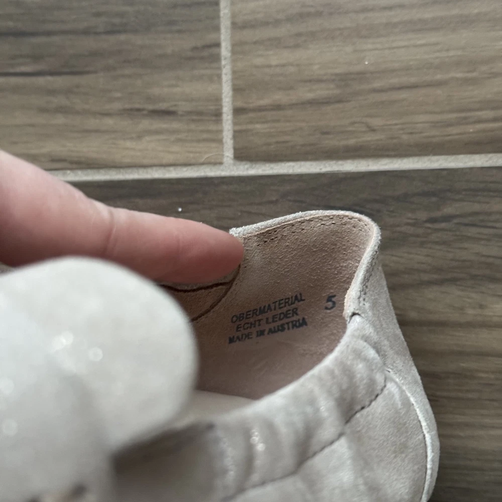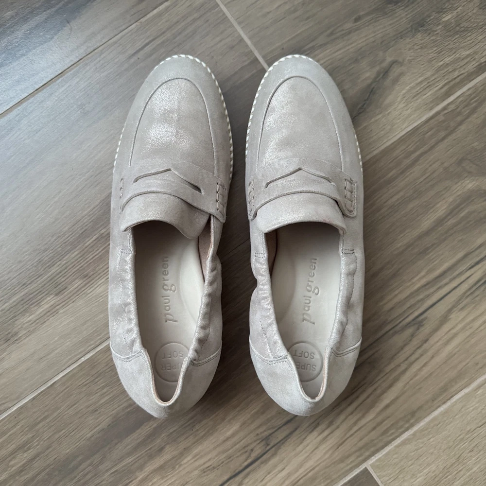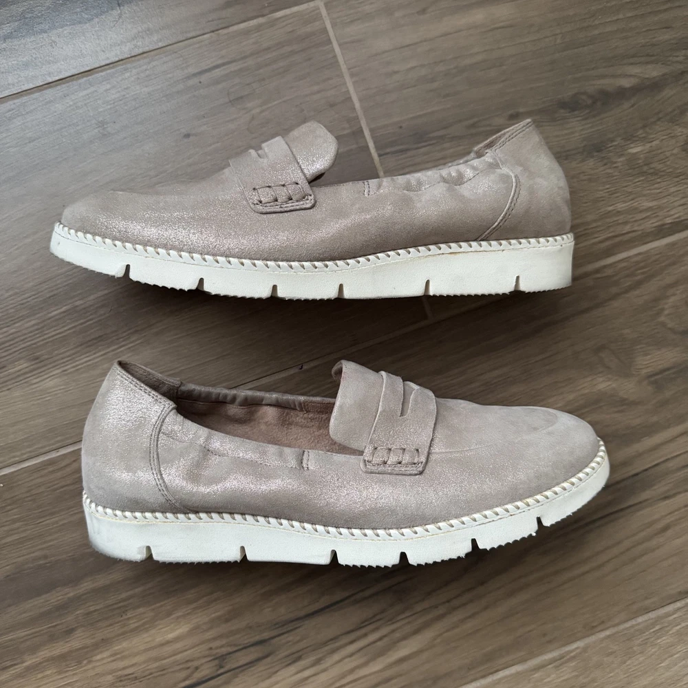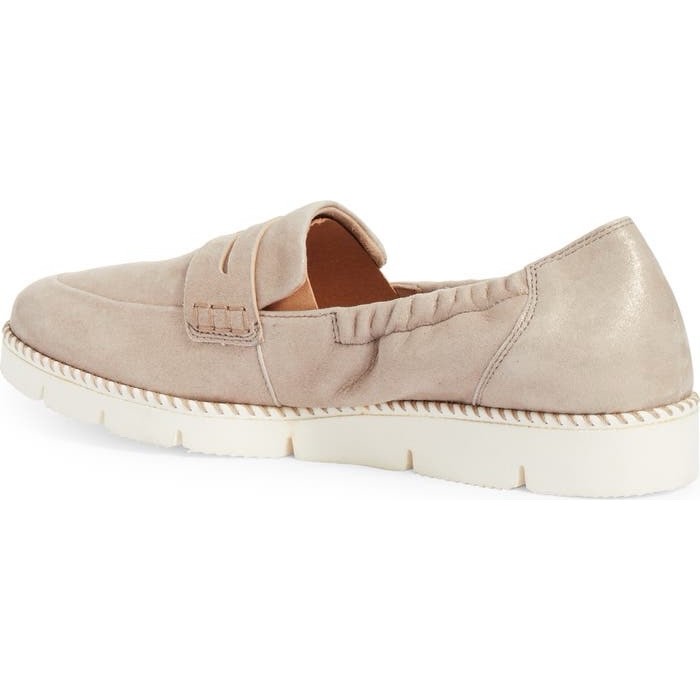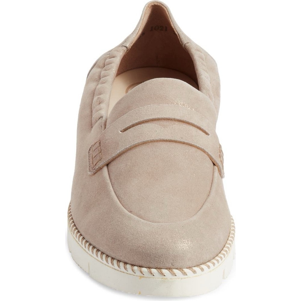 Whipstitched trim refreshes the silhouette of this supple suede penny loafer with an elastic topline and padded footbed for a perfectly cozy fit. Cushioned footbed. Leather upper and lining/synthetic sole. Great preloved condition, some marks on one side shown in last photo. Size 5 UK fits like a 8 US