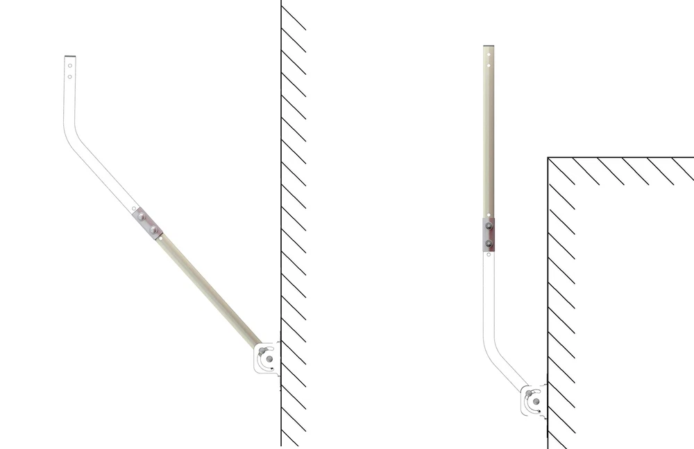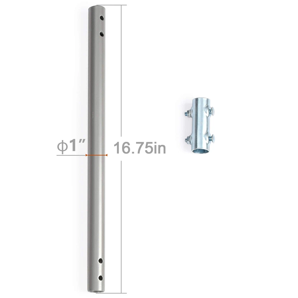 PBD Pole Extend Accessory 1. Outer Diameter is Max. 1 inch . 2. Length 16.75 inch . 3. Thickness 0.07 in . Reversible Design -- Both ends of the J-pole antenna mount can be used. 1" Diameter, 49 1/2" Arm Length Wall Mounts & Brackets -- Best accessory for you to mount the antennas and weather stations. With best size design, it can fit most outdoor antennas and weather stations. Adjustable direction -- The mounting pole can be rotated 60° for best reception angle to get strongest signals. Easy installation -- Comes with all the screws and plastic anchors, super easy to assemble.