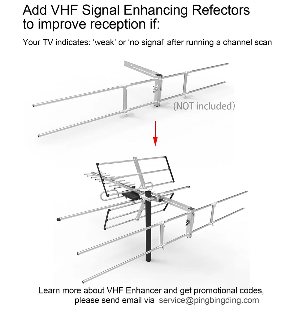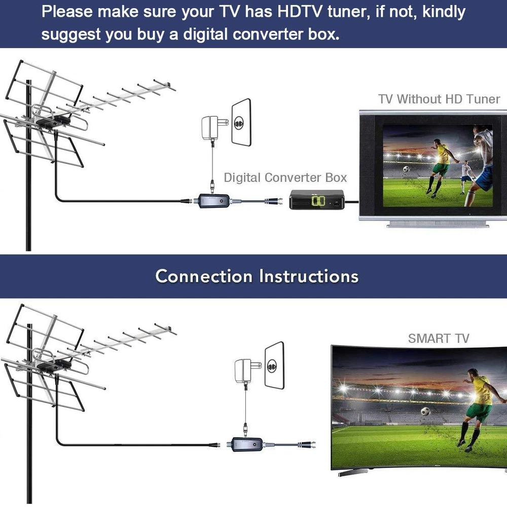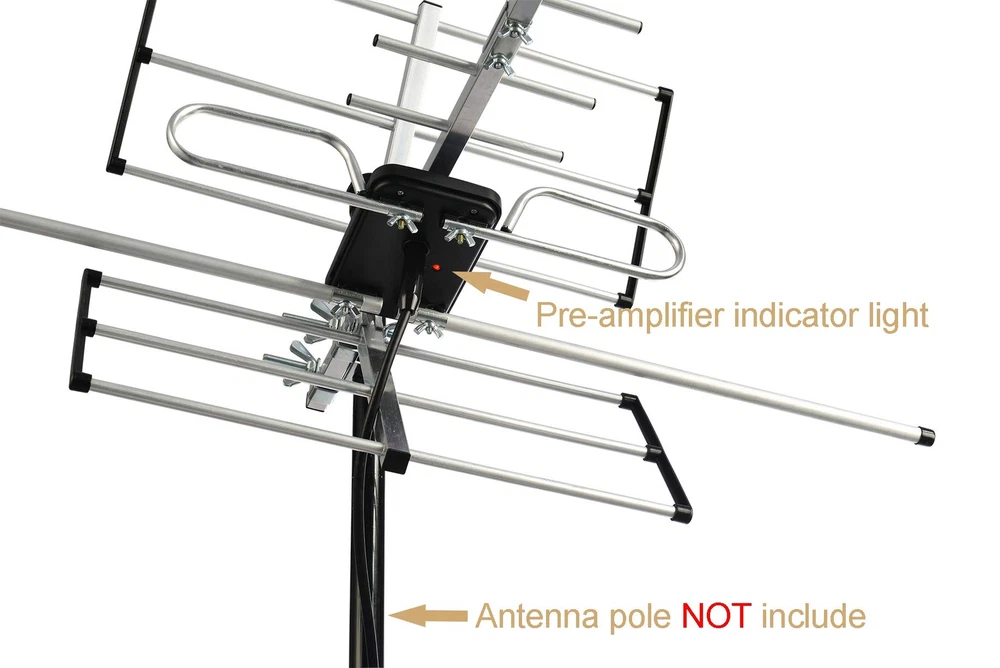 Receive Free Local HDTV and UHF/VHF Signals -- Full HDTV support 720p, 1080i, 1080p, 4K | Working Frequency: VHF 170~230MHz | UHF 470~860MHz | Receive free digital broadcast high definition TV signals. HDTV Reception & Long Range Outdoor TV Antenna -- Built-in high gain and low noise Amplifier ensures stunning pictures and sound reception within 120 miles range, making this the best long range TV antenna. Easy Installation -- Antenna comes mostly pre-assembled. Only minor assembly required. No tools required. Mounting pole not included - Put B07BNSL21G into Amazon search box for pole. Weather Resistant -- PBD outdoor TV Antenna is lightning protected, durable design with grounding done. Superior construction to withstand tough outdoor weather conditions. What you get -- PBD tv antenna with power supply adapter and 40FT RG6 Coaxial Cable.
