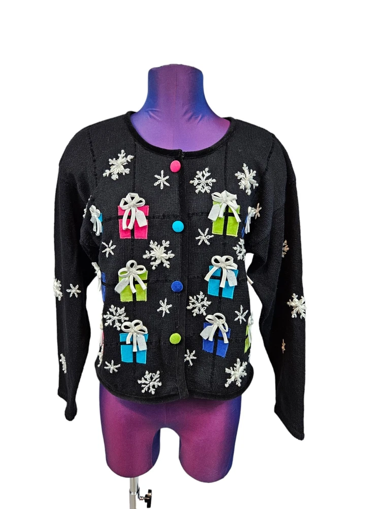 PBJ Sport Black Christmas Present Button Front Cardigan Sweater Size Small J5 In excellent condition PBJ Sport Black Christmas Present Button Front Cardigan Sweater Size Small Women's. Features heavyweight black tight knit button front Christmas cardigan sweater, round neck with velvet piping, vibrant buttons, button front placket, black velvet piping throughout hems, adorned with colorful wrapped Christmas presents, white ribbon snowflakes with faux pearls, front and back embroidery, long casual sleeve, ugly Christmas sweater, vintage Christmas cardigan, falls at hips, festive holiday sweater. Measurements laying flat chest 19" length 20.5" arm inseam 19.5" Fabric ramie and cotton This is a pre-owned item that may show signs of wear. In excellent condition, no flaws.