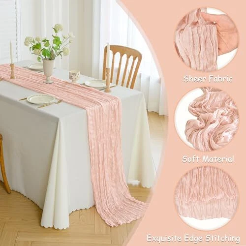 30 Days Return Policy Fast Delivery Trusted seller 12PCS Cheesecloth Table Runner 10FT Gauze Boho Rustic Table Runner 35x120 Inch Long Table Runner for Wedding Baby Shower Bridal Shower Decoration(Dusty Pink) Product Description High Quality Material:The table runner is made of high quality polyester,the material is lightweight, soft to touch, natural drape, long-lasting and not easy to fade. It can be used as table decoration, chair cover sashes,home decor or party decor, etc. , can be easy to clean and fold to storage, washable and reusable Cheesecloth Table Runner Package:you will get 1 piece (beige) width*length(WxL):35 x 120 inch gauze table runner,this length is large enough to cover rectangle and round tables, can also be spliced together for long tables,we also have other color for you to choose to match your different theme decorations Cheesecloth Table Runners Design:This wedding table runner is specially designed with beautiful crinkling,the edges are carefully stitched makes this sheer table runner more graceful,It will gently sway in the wind. so it will adding a romantic atmosp to your occasion. These eye-catching gauze table runners making your party elegant, atmospheric and impressive to guests Wide Occasion: The table runner is a good choice for your table decor, even can be used for chair cover sashes,wall decor,home decor or decorative napkins, backdrop draping or even gift wrapping. Suitable for various types of occasion such as wedding, baby shower, bridal showers, birthday parties, theme party and all kinds of theme photography Gauze Table Runner Care Instructions:The wedding table runners can be hand washed or machine washed on a gentle cycle and air-dried,for long-lasting reuse, we suggest hand washing the runner in cold water with a mild detergent. If you prefer, you can also machine wash it on the gentle cycle using a laundry bag. Please avoid using bleach or soaking the runner for an extended period. Following these instructions will help maintain its quality and durability Shipping Returns Payment Shipping Shipping is FREE to all addresses other than APO/PO boxes in the lower 48 states. All our stock ships from US-based warehouses. Shipped via USPS or UPS (depending on location and package weight) Unless stated otherwise, all orders will ship within 24-72 hours of your payment being processed. Check our feedback to see the great reviews of FAST shipping we offer. Returns As our valued customer, we will do our best to make sure the product you receive arrives to you on time and as expected. If you are not satisfied with your purchase, please contact us within 30 days of receiving your order to process a return. Payment We currently accept payment via eBay managed payments only. Once payment is cleared, we will dispatch your shipment within 1-3 business days. Please refer to the "Shipping" tab for more information regarding shipping speed to your destination.
