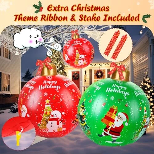 30 Days Return Policy Fast Delivery Trusted seller 4 PCS PVC 24 Inch Giant Inflatable Christmas Balls Inflatable Christmas Decorations Outdoor Inflatables Ornaments Xmas Blow Up Decorated Ball for Holiday Indoor Outside Yard Lawn Porch Decor Product Description Giant Inflatable Christmas Ball: This Christmas decorations set includes 4 colorful PVC inflatable Christmas balls, cute ribbons, ropes and ground nails. You can fix them in place. Whether you hang them alone or combine them, a strong holiday atmosp can be created. The 60 cm/ 24 inch inflatable balls are large enough to attract attention. Use them to decorate your yard, garden, lawn and porch with christmas decorations outside, and fill your home with the lovely Christmas spirit Christmas Theme: Each inflatable Christmas ball has 6 sides. The patterns on these giant inflatable balls for indoor and outdoor Christmas decor are exquisite and detailed, with rich and bright colors. They are inspired by symbols such as Santa Claus, snowman, reindeer, stockings, hats, snowflakes and candy canes. Add more fun and color to your holiday decorations. Christmas inflatables will make your Christmas outdoor decorations more charming Quality Materials: This Christmas decorations indoor inflatable ball is made of excellent quality PVC material. It is waterproof, reusable and not easy to break. The reinforced stitching ensures durability. Giant inflatable christmas ornaments can be used even outside. The stable ground nails and sturdy handles can fix it in place, offering you a long working life. Inflatable Christmas ball is a wonderful choice for outdoor Christmas decorations Easy to Use: SUIMOT Christmas outdoor decorations are easy to use. These inflatable Christmas decorations balls do not require complicated operations. Just use an air pump to inflate these giant inflatable Christmas balls from the top, and you can enjoy a creative inflatable Christmas theme indoor and outdoor decoration. The good air tightness can keep them full for a long time, making your Christmas decorations last longer Wide Use: You can hang the Christmas inflatable outdoor decorations on indoor doors and windows as per your preference, or use them as outdoor decorations in gardens, courtyards, terraces, and so on. Not only can they make your home or yard eye-catching, but they can also be employed in commercial activities, parties and other celebrations, making every corner brim with holiday atmosp. outdoor christmas decorations can be used in various occasions Shipping Returns Payment Shipping Shipping is FREE to all addresses other than APO/PO boxes in the lower 48 states. All our stock ships from US-based warehouses. Shipped via USPS or UPS (depending on location and package weight) Unless stated otherwise, all orders will ship within 24-72 hours of your payment being processed. Check our feedback to see the great reviews of FAST shipping we offer. Returns As our valued customer, we will do our best to make sure the product you receive arrives to you on time and as expected. If you are not satisfied with your purchase, please contact us within 30 days of receiving your order to process a return. Payment We currently accept payment via eBay managed payments only. Once payment is cleared, we will dispatch your shipment within 1-3 business days. Please refer to the "Shipping" tab for more information regarding shipping speed to your destination.