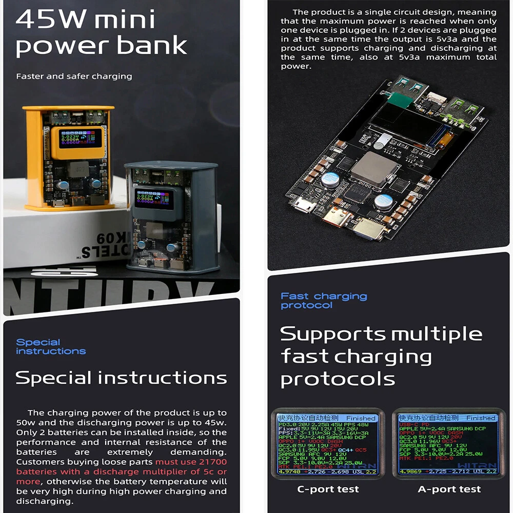 SAFE & SECURE SHOPPING 100% SATISFACTION GUARANTEED FAST SHIPPING PD 45W Fast Charging Power Bank Welding Battery Case Color Screen No Battery HAU Product Description Features: 1. The finished product adopts high-quality two 21700 batteries, with Samsung 50e batteries and a total capacity of 10000mah. 2. The product has a power of up to PD45W and is bidirectional, making it suitable for short-term use when going out. 3.0.96 inch IPS high-definition intelligent color screen, with beautiful screen UI design, including power, voltage, current, interfaces, and more. 4. Small and beautiful, portable, with large power, intelligent screen display, high-quality battery cells, and a variety of colors to choose from. You can carry it with you when you go out, weighing only 205g, which is very convenient. Specification: Product colour: grey yellow bluetooth Product size: 84*54*39mm Product power: 45W(MAX) Battery type: 21700 Battery Quantity: 2PCS Battery discharge rate:≥5C Screen display:Our mobile power supply has a built-in 0.96 memory IPS screen, which can display real-time input and output power, voltage, and current in the lower left corner. Each interface can also display real-time load conditions, and there will also be a display when the device is plugged in. It can display information such as the voltage of each battery, total voltage, current, temperature, percentage of battery charge, etc. For those who like to view monitor data, it is very suitable. The screen display UI design is beautiful, the data is comprehensive, and the logo is also comprehensive. At a low price, it can enhance the visual and experiential experience. Port:The product has a total of 4 interfaces, all data cables can be used. Apple Lightning input. Type-c input output. Use two outputs.Two USB output. NOTE: 1.The product has a maximum charging power of 50w and a maximum discharge power of 45w. Only 2 batteries can be installed internally, so there are extremely high requirements for battery performance and internal resistance. Customers who purchase spare parts must use 21700 batteries with a discharge rate of 5c or above, otherwise the battery temperature will be very high during high-power charging and discharging. 2.The product assembly is simple, with 2 sections of 21700 being welded in series. Finally, connect the wires on the battery pack to the motherboard. Attention should be paid to spot welding between batteries in order to generate excessive current, otherwise the contact points will generate heat and cause high temperatures in the battery. Package Includes: 1*1set PD45W Power Bank Payment Shipping Returns Contact US Payment Payment must be completed within 5 days. If you have any problems about payment, please contact us via ebay message. Shipping We only ship to confirmed ebay Order addresses. Please comfirm that your Order address is in line with your shipping address. Please kindly note that the combined shipping is not provided because the shipping fee is calculated by weight. Also, the each additional item means exactly the the same color and size. It takes about 7-15 working days to US; about 10-30 working days to other countries. Transit time may be a little delayed because of the bad weather and customs inspection. If you do not receive your item within 30 working days since payment finished, please contact us immediately for further assistance. Returns Items can be returned for exchange or refund within 30 days from the date you receive your merchandise. We are not responsible for any purchase after this 30-day period. Return shipping is the responsibility of buyer unless the return is a result of our mistake (i.e., your receive the wrong item). We will pay for shipping replacement back to you if an exchange is requested. Contact US Customer satisfaction is very important to us and our feedback rating reflects this satisfaction. If you have any questions, Our customer service staffs welcome feel free to contact us by EBAY message box. We strive to answer all questions and resolve any problems as quickly as possible. Copyright © 2022 Tongtool On Dec 12, 2024 at 03:04:18 PST, seller added the following information: