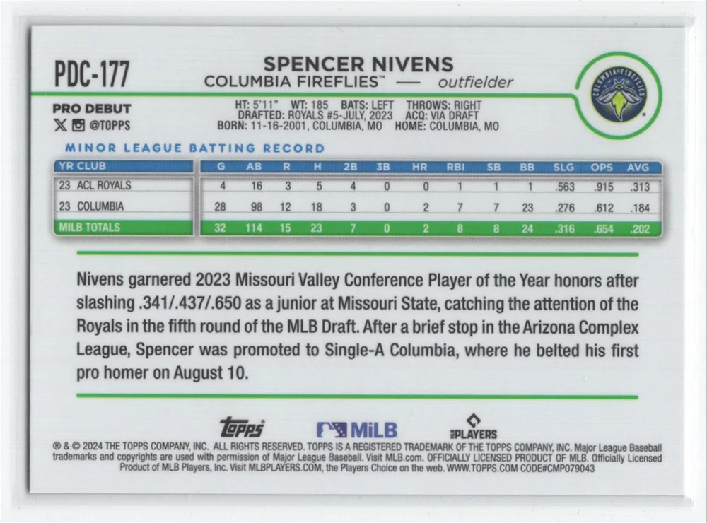 About Me Other Listings Feedback Add to Favorites Contact Me eBay Store Striking Cards 901 #PDC-177 2024 Topps Pro Debut Chrome Spencer Nivens Columbia Fireflies No stock photo / These are real scans or pictures Details Description: Spencer Nivens Category: Baseball Year: 2024 Product: Topps Pro Debut Chrome Team: Columbia Fireflies Card Number: PDC-177 Dimensions: 3½" x 2½" SKU: BL B0001 R01 Y (814) Listing By Kronocard trading cards software v2.8.1.2