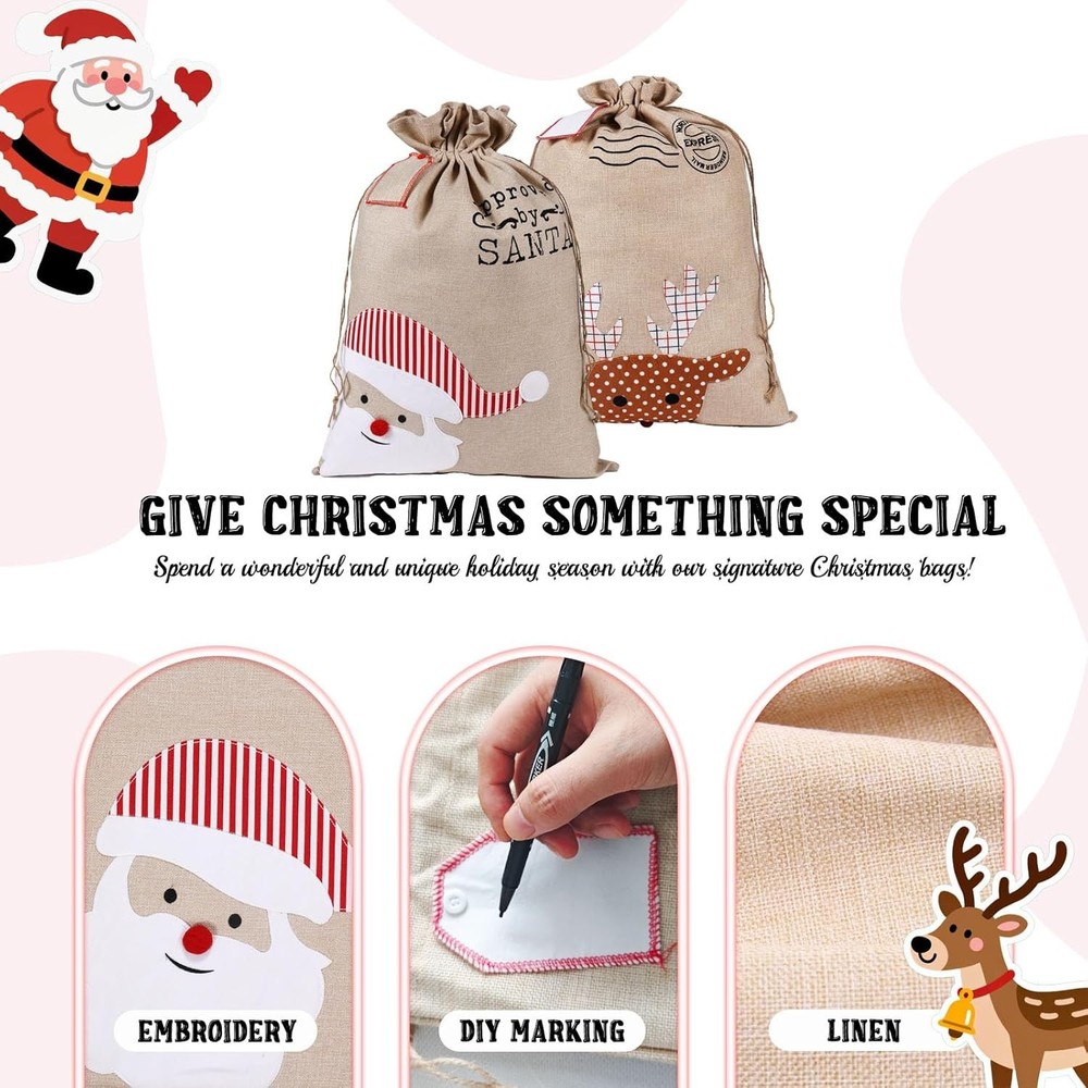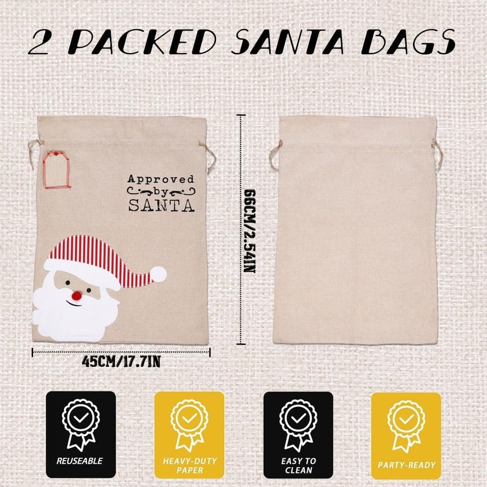 PEACELOVER 2 Pack Large Embroidered Santa Sack, Personilized Linen Christmas LuxeFusion Product Description Features 【DIY Signature or Wishes】You can write your own signature or Christmas message in the blank space of this canvas christmas gift bags and leave your unique mark.Make this santa gift bag more meaningful. 【High Quality Material】This large drawstring schristmas gift sacks made of canvas material is high-quality and thick, easy to clean and care for, washable and durable. You can treat it as a Christmas gift every year. They're so sturdy and strong that you can use them not only on Christmas Day but also on normal days for storing. 【Large Capacity】The cloth santa sacks measure of 26" X 17.7" , which is large enough to hold gifts for a family. Such as candy, clothing, toys, etc. Sturdy drawstring mechanism ensures gifts stay safely contained until the perfect moment 【One Containing 2 Styles】You only need to purchase one order to get two christmas canvas bags with matching combinations, which is very affordable. We have combinations of red and green stripes, Santa Claus, and reindeer.Every combination of santa sack bag is a perfect match. 【Applicable scenarios】You can use this personalized large santa sack as a Christmas gift to give to friends and family, or as a container for storing Christmas gifts. With this high-quality Christmas bag, you can distribute Christmas gifts. It's really cool! Ideal for Christmas gift presentation, holiday storage, seasonal decor, and Santa's special deliveries Product Details Package Dimensions: 9.96 x 6.38 x 1.85 inches Item Weight: 12 ounces Manufacturer: SDD Item model number: sdd-xmas Brand: PEACELOVER Color: Linen Christmas Material: Canvas Occasion: Christmas Included Components: Canvas Bag Theme: Christmas Cartoon Character: Santa Claus And Reindeer Number of Items: 1 Unit Count: 1.0 Count Product Dimensions: 15.4"L x 0.1"W x 21.7"H Free Shipping All orders ship free and fast to your doorstep. Easy Returns Satisfaction guaranteed. 30-day returns, no questions asked. 24/7 Support Contact us anytime; we’re here to help, day or night. Brought to you by LuxeFusion – Quality you can trust.