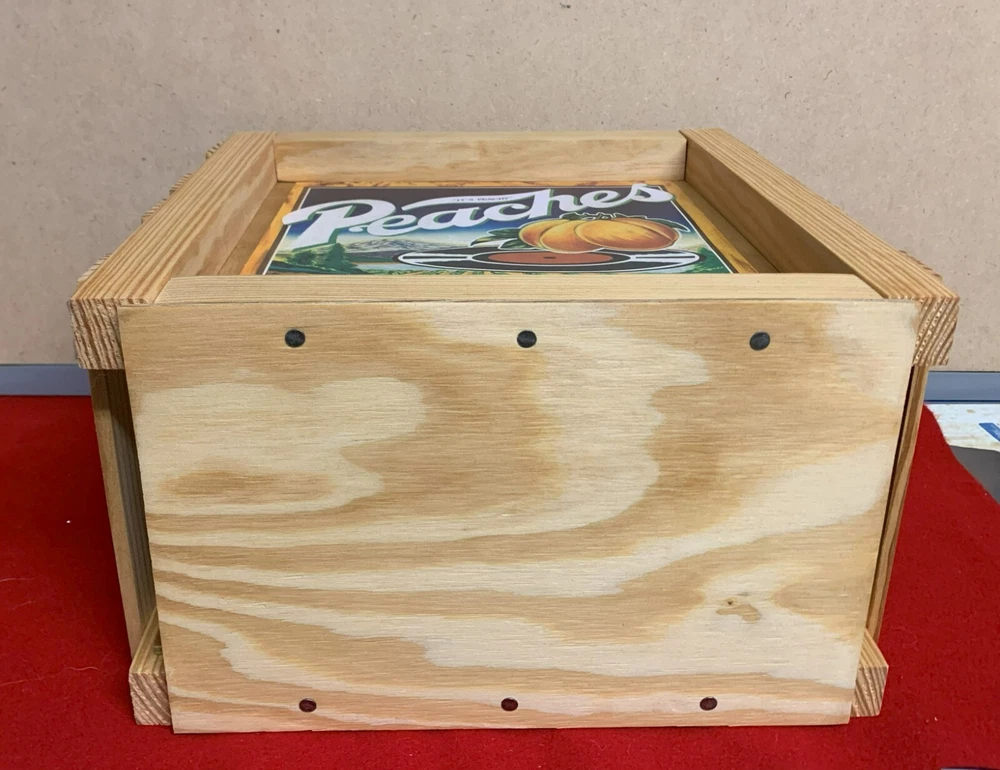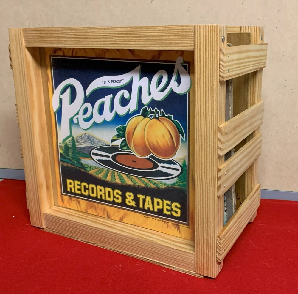 Hand built by me, a wooden storage crate that is perfect for vinyl records , with a nice vintage look! Approximate Size 13"w x 12"d x 13"h (half sized Album crate for 12" lp's) Crate holds around 50-60 vinyl records Natural stain crate. Wooden crates with PEACHES RECORDS & TAPE logo. Each piece is cut to size stained and assembled. These are not cookie cutter crates so each one is a little different in regards to the wood. There may be some small imperfections because of the cuttings but they are still very sturdy. Because a crate full of vinyl records can be very heavy I recommend that you do not tote around a crate full of vinyl. It would be better to remove them first before carrying them around. Note! the crate you receive may not be the same one as shown in the photo but it will be the same size and style.