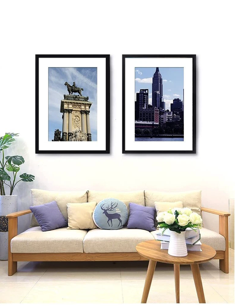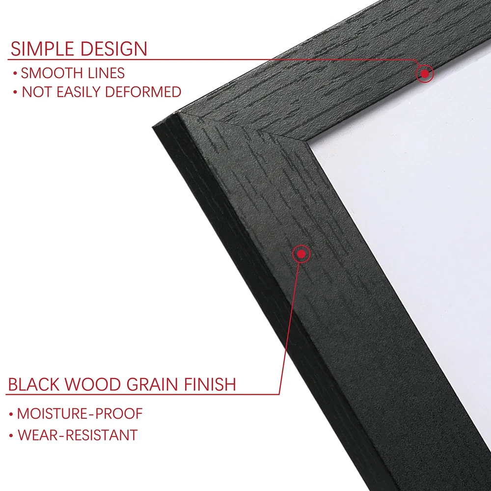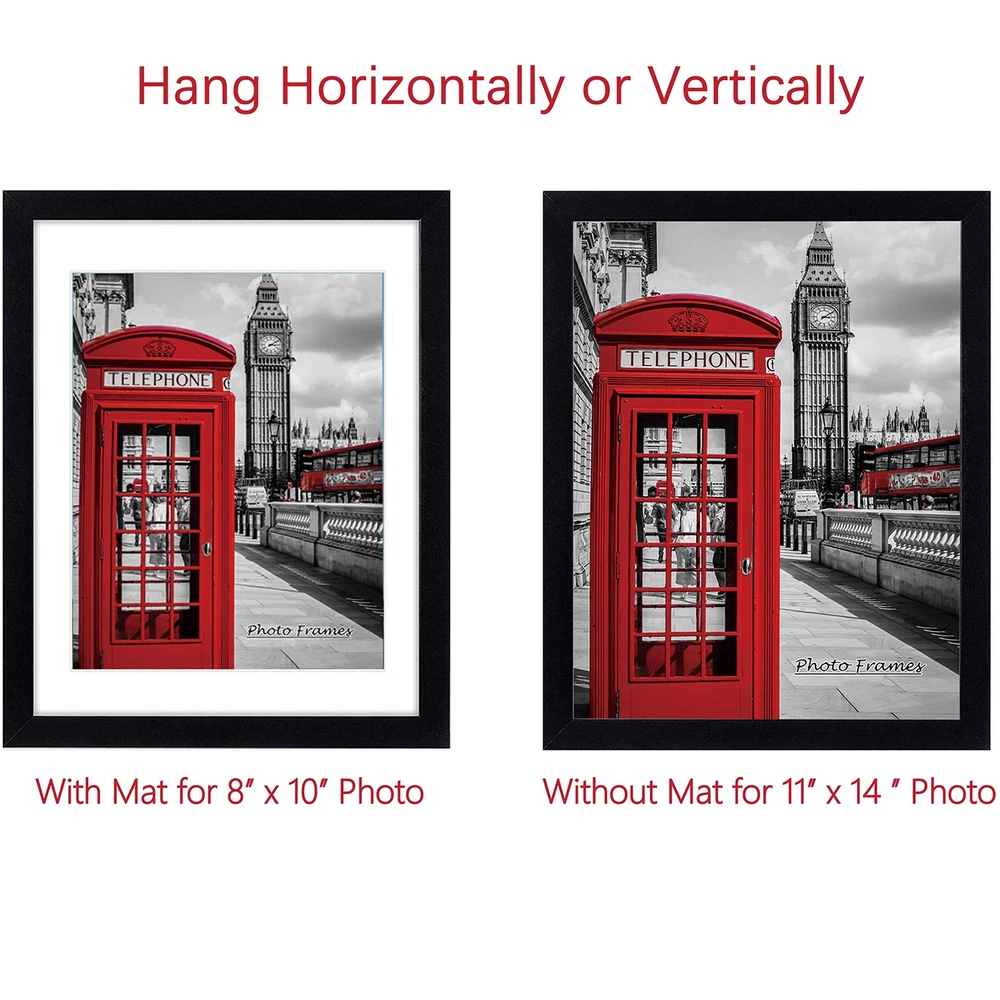 STURDY MATERIAL: The PEALSN 11 x 14 frame set includes 6 well-built black picture frames, these super high-quality frames are made of sturdy wood rather than plastics, great looking. The mounting board is a durable MDF wood. Sturdy, durable, anti-drop it can protect your photo against dust, moisture, or insect damage, keeping it new for years. VERSATILE DISPLAY: The picture frames 11x14 are designed with strong brackets on the back, You can hang them horizontally or vertically for gallery-style wall mount, and can also use a stand to place them on a table for display. Watch your cherished photos come to life and add interest to a wall or tabletop in your home. SIZE: This 11x14 frame is designed to fit an 8x10 photo with a mat or, if you remove the mat, it can fit an 11x14 photo. They are suitable for displaying your family photos, landscape photos, certificates, diplomas, artwork, posters, etc. GREAT GIFT: Each 11x14 picture frame black with a black woodgrain finish. Simple design, smooth lines. These chic and beautiful frames make for a great gift for a wedding, baby shower, graduation, anniversary, holidays, birthday, or vacation. PROTECTIVE PACKING: These frames 11x14 are carefully packaged to ensure product safety. Don't have to worry about receiving damaged products. There is a protective film on both sides of the plexiglass, Please tear off the protective film before use. If the protective film is not removed, the transparency of the plexiglass will decrease.
