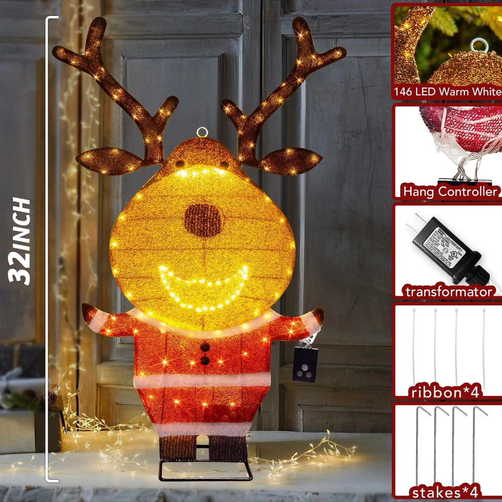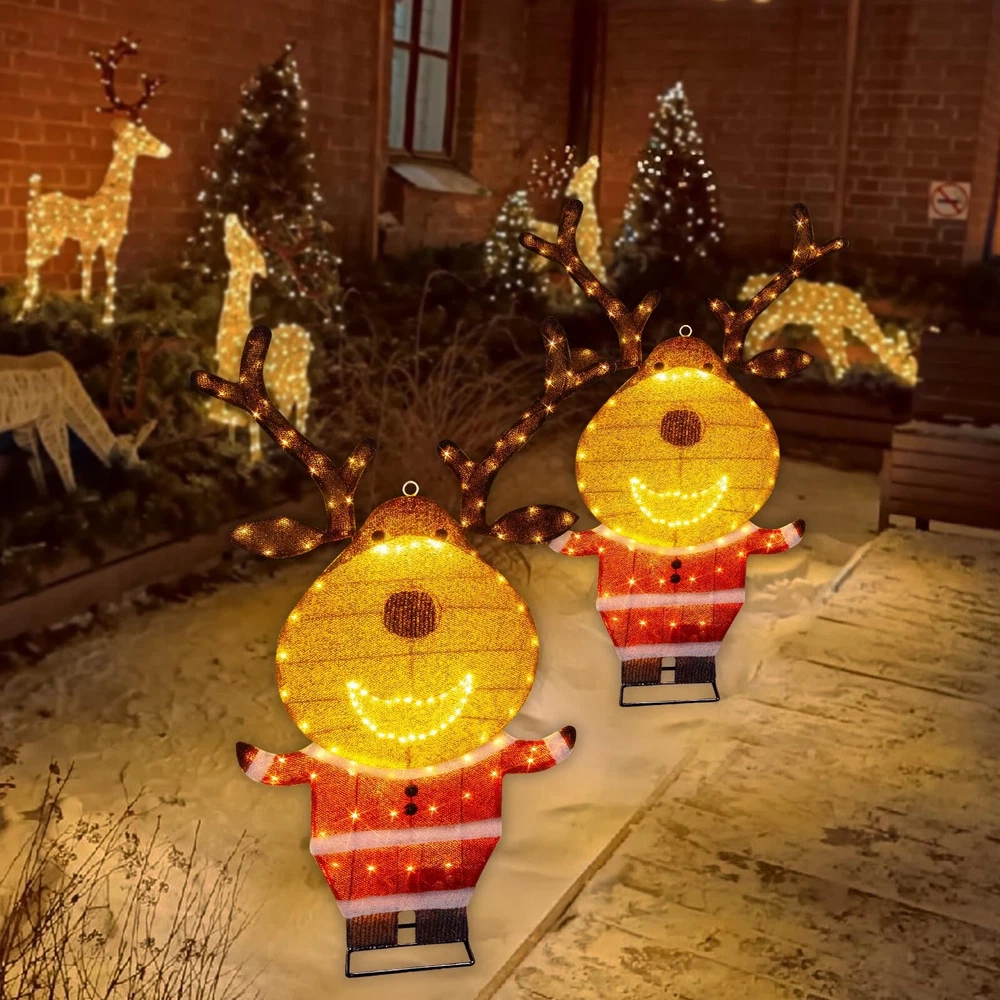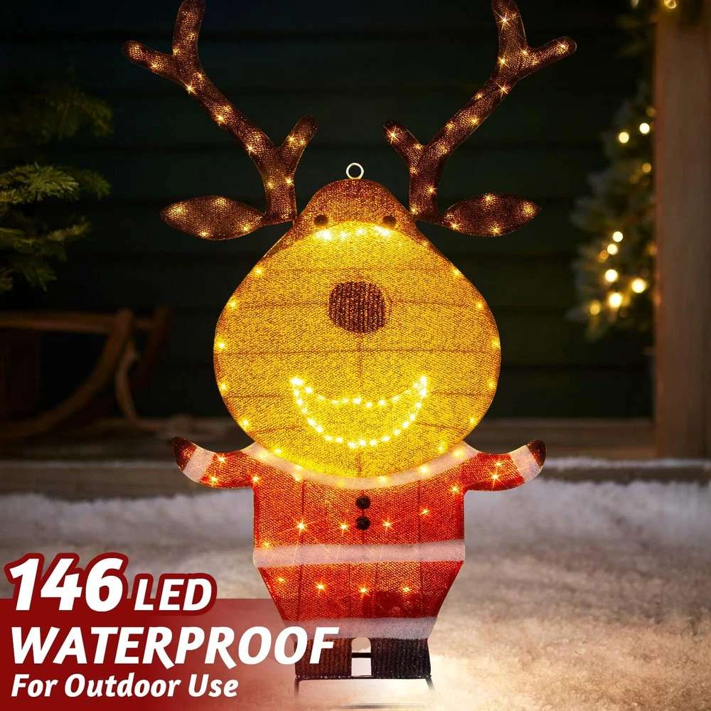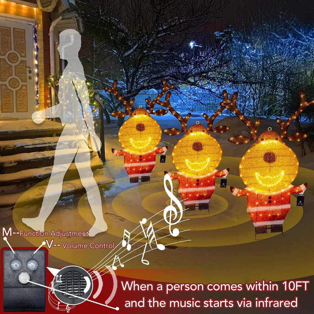 PEIDUO Reindeer Christmas Decor, Lighted Deer Christmas Decorations Outdoor with 146 Lights, Motion Sensor Controller Sync with Music, 2D Xmas Deers for Lawn Porch Garden Indoor Outside, 2.6 FT Product Details Color: Warm White Brand: PEIDUO Item dimensions L x W x H: 5 x 3 x 10 inches Manufacturer: PEIDUO Product Dimensions: 5 x 3 x 10 inches Item Weight: 2.27 pounds Manufacturer: PEIDUO Country of Origin: China Item model number: Reindeer Light up Reindeer: 2.6 FT reindeer is decorated with 146 warm white LED lights, dressed in Santa Claus clothes, cute and charming, decorating your Christmas and holiday, bringing unlimited happiness to you and your family and friends Christmas Music Sensor: When someone enters the sensing range, the infrared motion sensor will play the sound of Christmas music, and the lights will flash synchronously with the music Easy to Assemble and Store: Can be completed in 2 minutes without any tools. Christmas deer can be hung; Can be placed on the ground or desktop; It can also be inserted and fixed on the grass; Simply insert the head into the body and connect the antlers, and disassembly is equally simple Outdoor Christmas Decorations: Built with a durable iron frame and equipped with an IP44 waterproof adapter, it can withstand rain, wind, and snow. The power cord measures 16.4FT, allowing for outdoor use. The packaging includes all assembled and fixed accessories, including 4 stakes and 4 zip ties, and a music controller Christmas Decor: Reindeer christmas decor can be used indoors and outdoors, perfect for Christmas, New Year, and other holiday occasions. Whether placed on the lawn, porch, courtyard, living room, kitchen, bedroom, or any other space