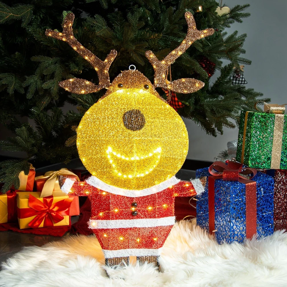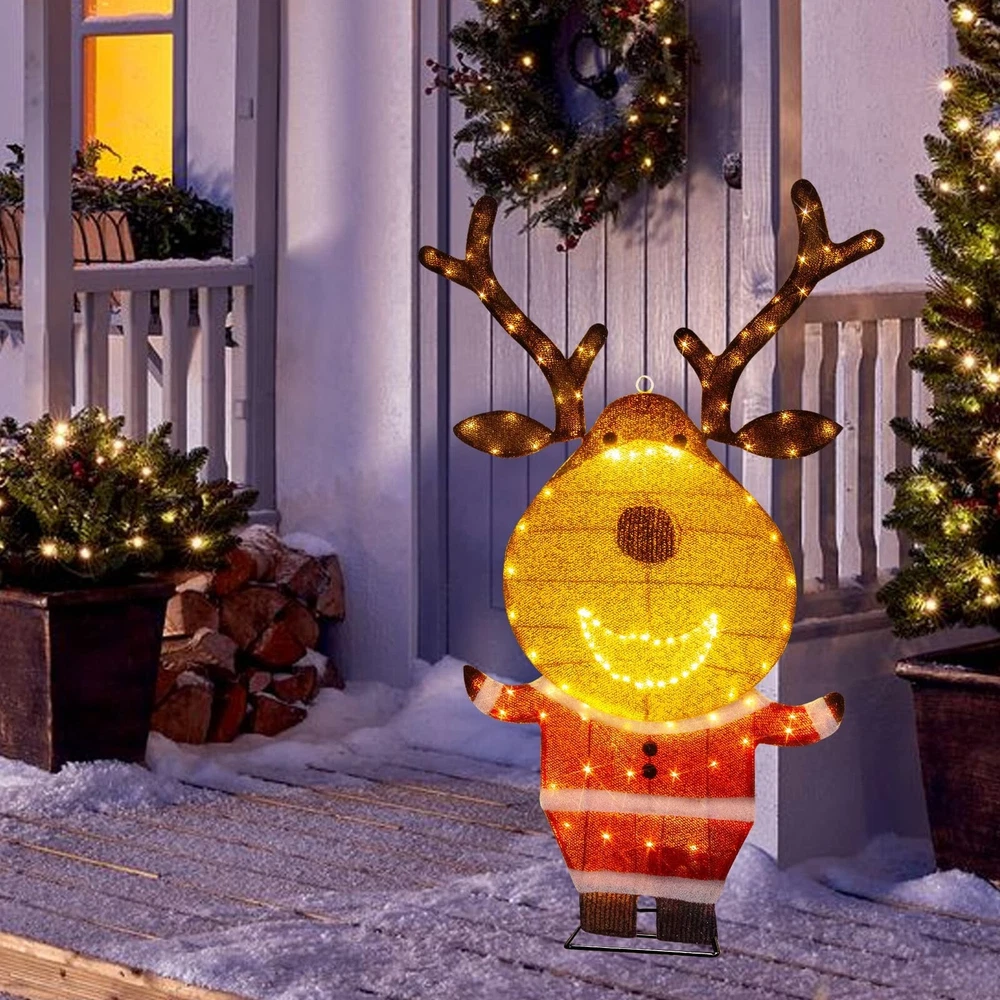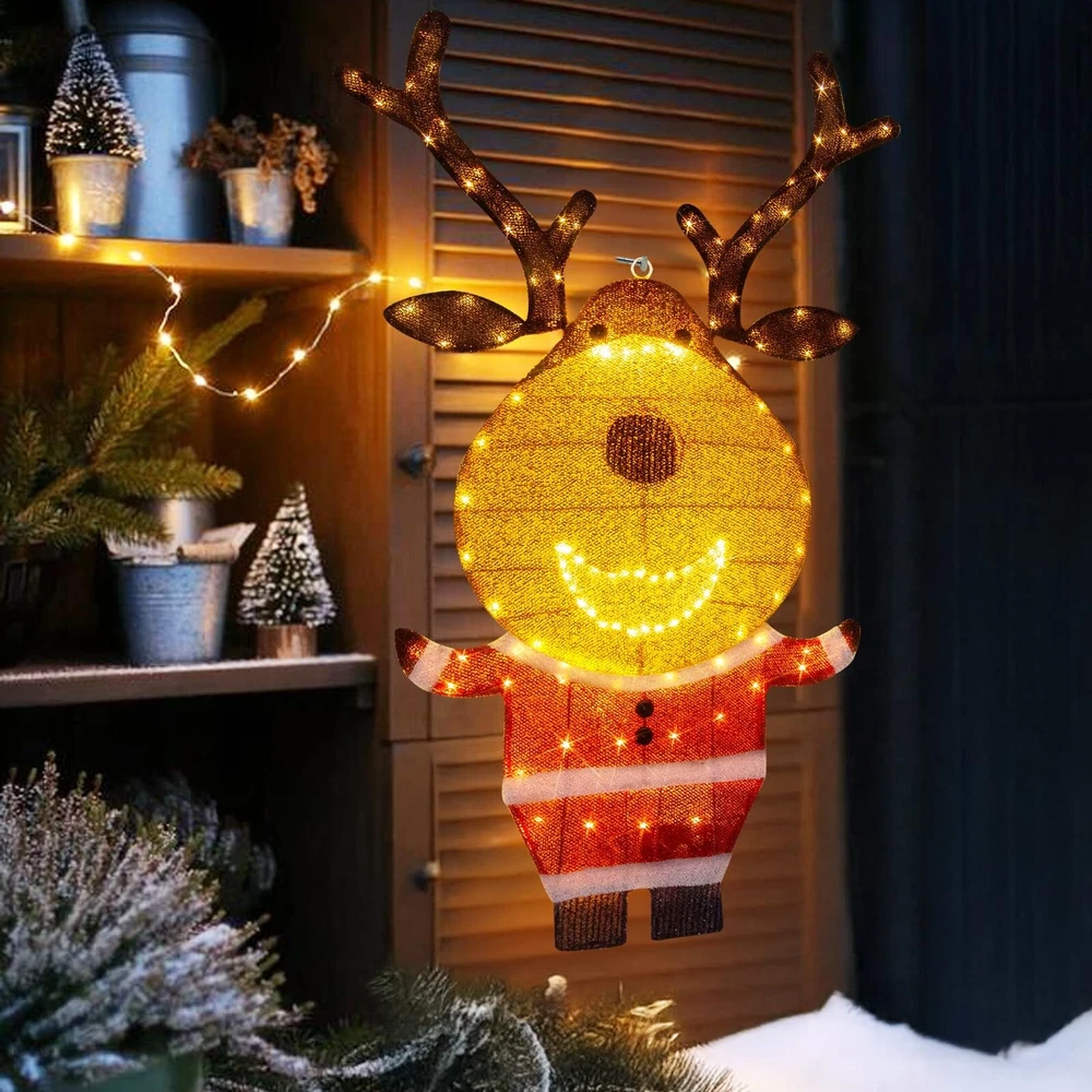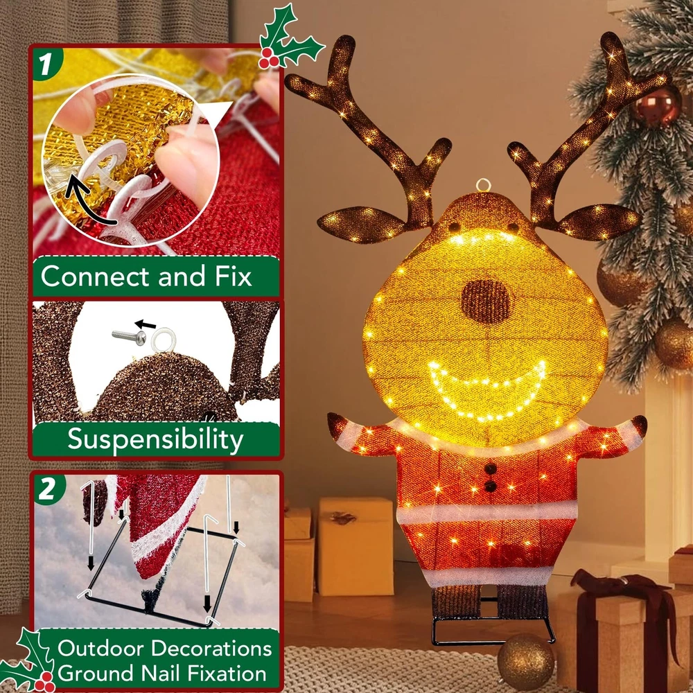 PEIDUO Reindeer Christmas Decor, Lighted Deer Christmas Decorations Outdoor with 146 Lights, Motion Sensor Controller Sync with Music, 2D Xmas Deers for Lawn Porch Garden Indoor Outside, 2.6 FT Product Details Color: Warm White Brand: PEIDUO Item dimensions L x W x H: 5 x 3 x 10 inches Manufacturer: PEIDUO Product Dimensions: 5 x 3 x 10 inches Item Weight: 2.27 pounds Manufacturer: PEIDUO Country of Origin: China Item model number: Reindeer Light up Reindeer: 2.6 FT reindeer is decorated with 146 warm white LED lights, dressed in Santa Claus clothes, cute and charming, decorating your Christmas and holiday, bringing unlimited happiness to you and your family and friends Christmas Music Sensor: When someone enters the sensing range, the infrared motion sensor will play the sound of Christmas music, and the lights will flash synchronously with the music Easy to Assemble and Store: Can be completed in 2 minutes without any tools. Christmas deer can be hung; Can be placed on the ground or desktop; It can also be inserted and fixed on the grass; Simply insert the head into the body and connect the antlers, and disassembly is equally simple Outdoor Christmas Decorations: Built with a durable iron frame and equipped with an IP44 waterproof adapter, it can withstand rain, wind, and snow. The power cord measures 16.4FT, allowing for outdoor use. The packaging includes all assembled and fixed accessories, including 4 stakes and 4 zip ties, and a music controller Christmas Decor: Reindeer christmas decor can be used indoors and outdoors, perfect for Christmas, New Year, and other holiday occasions. Whether placed on the lawn, porch, courtyard, living room, kitchen, bedroom, or any other space