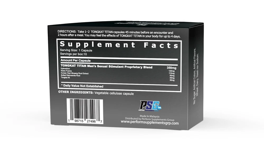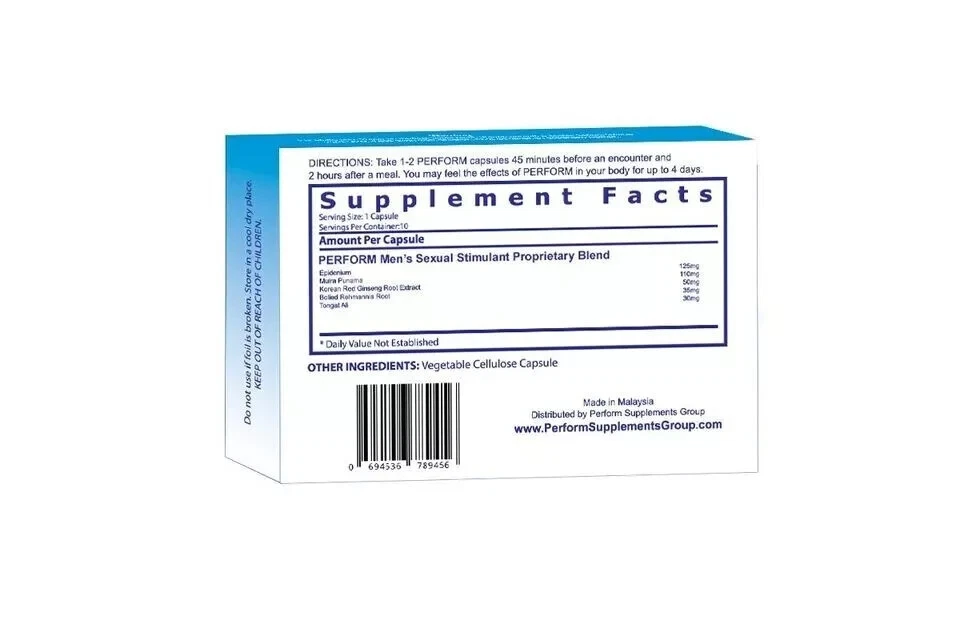 THIS IS A 2 BOX, 20 PILL VALUE PACK CONTAINING BOTH PERFORM AND TONGKAT TITAN Powerful, Dependable and the Endurance you deserve! PERFORM and TONGKAT TITAN will deliver peak performance over 72 hours and is the strongest product on the market today!. Why settle for a product that over promises, under delivers and uses a cartoon to advertise. PERFORM and TONGKAT TITAN was designed for men that are looking for a natural product to deliver the ultimate performance by focusing on size and endurance which is sure to deliver the pleasure your partner deserves. PERFORM and TONGKAT TITAN is an all natural supplement that takes the risk and worry out of what you're putting into your body. Take a look at our seller feedback and the overwhelming positive response customers are having! If you're tired of all the gimmicky promises out there and want a safe alternative that delivers, PERFORM and TONGKAT TITAN is for you! As always, we take the utmost care in providing quick and discreet shipping. WARNING: PERFORM and TONGKAT TITAN is extremely powerful. We recommend taking no more than one at a time. You should also stay well hydrated during use of PERFORM and TONGKAT TITAN as well.