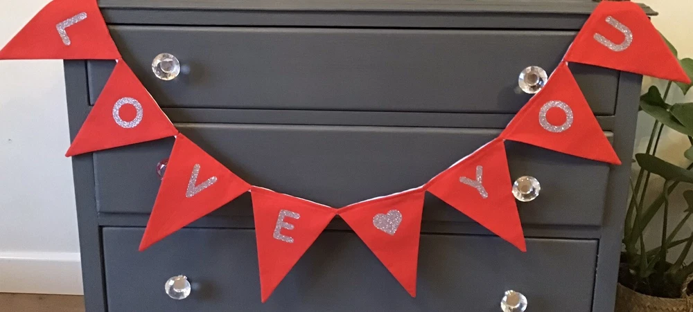 Personalised Valentines Day fabric bunting with silver glitter lettering The price is £1.50 per flag (letter) - not the full length - please read this Please enter the required number of flags you require in the quantity box, e.g. for the wording LOVE YOU you would require 8 flags @ £1.50 per flag, total cost £12.00 When you have purchased the required number of flags please message me or add a note letting me know the wording you would like Any queries with how many flags to purchase, please message me The flags measure 14 x 18 cms, and are spaced at 5cms, they are double sided, made in 100% cotton The silver glitter lettering is available in other colours please ask for details We live in a smoke free home