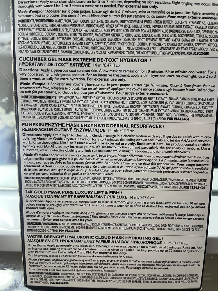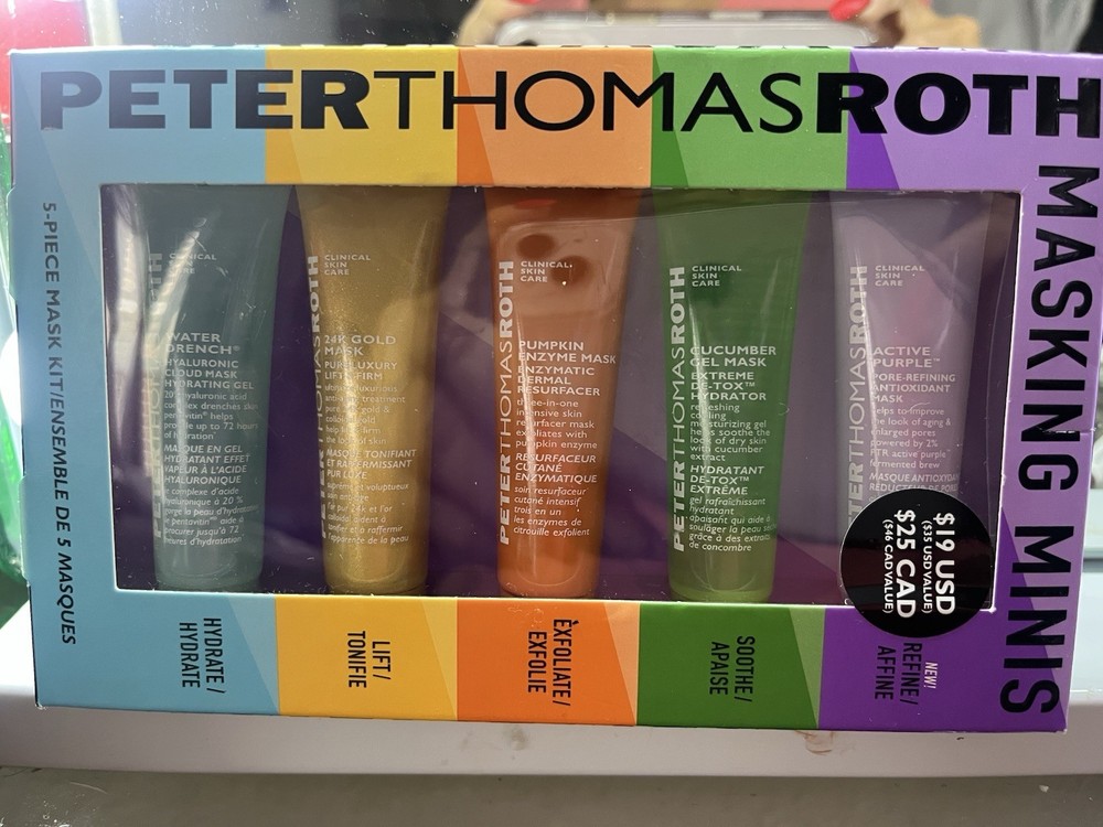 The Peter Thomas Roth Masking Minis 5-Piece Mask Kit is a collection of authentic anti-aging masks featuring cucumber as the main active ingredient. Each mini mask is designed for the face and comes in a 2.35 oz. volume. This kit includes five different formulas to help rejuvenate and nourish the skin, making it a convenient and effective option for achieving a spa-like experience at home. NIB
