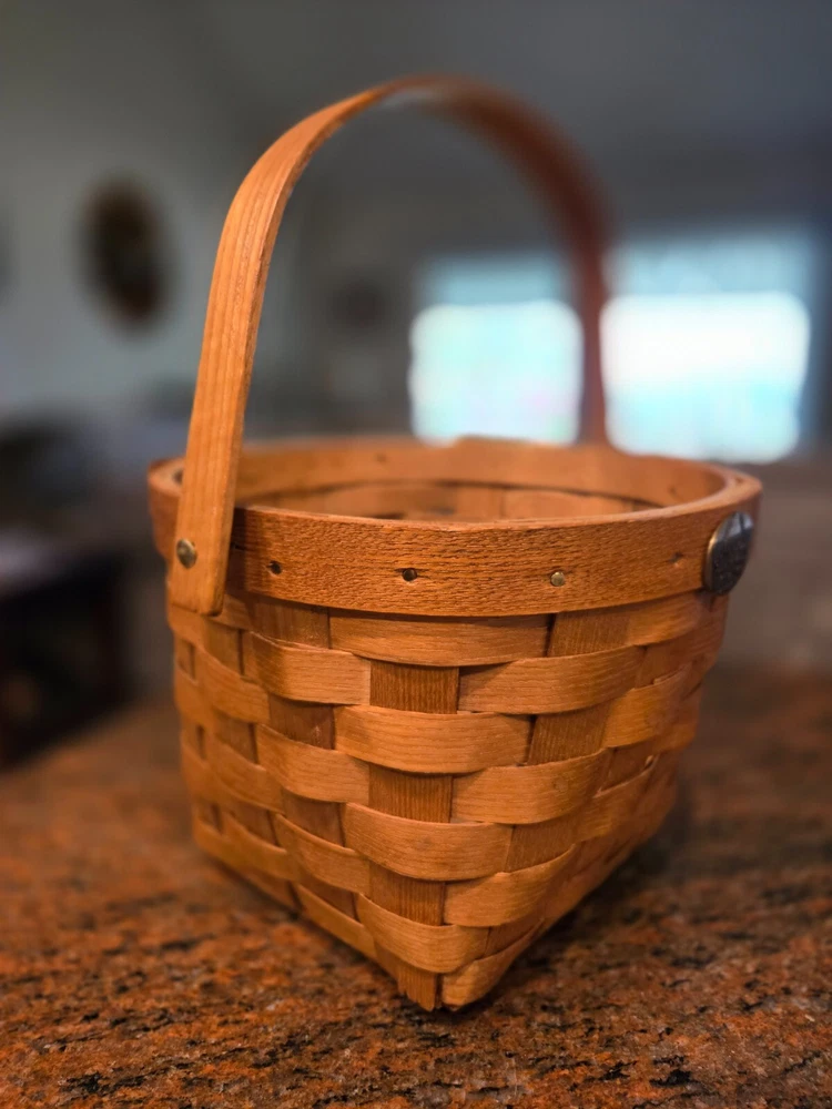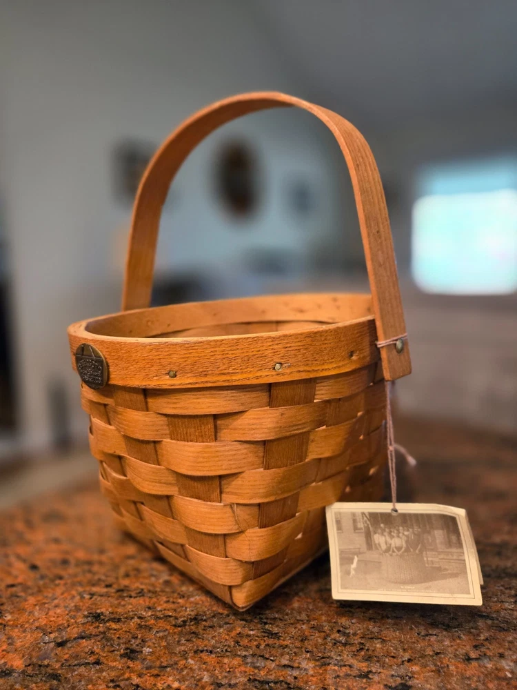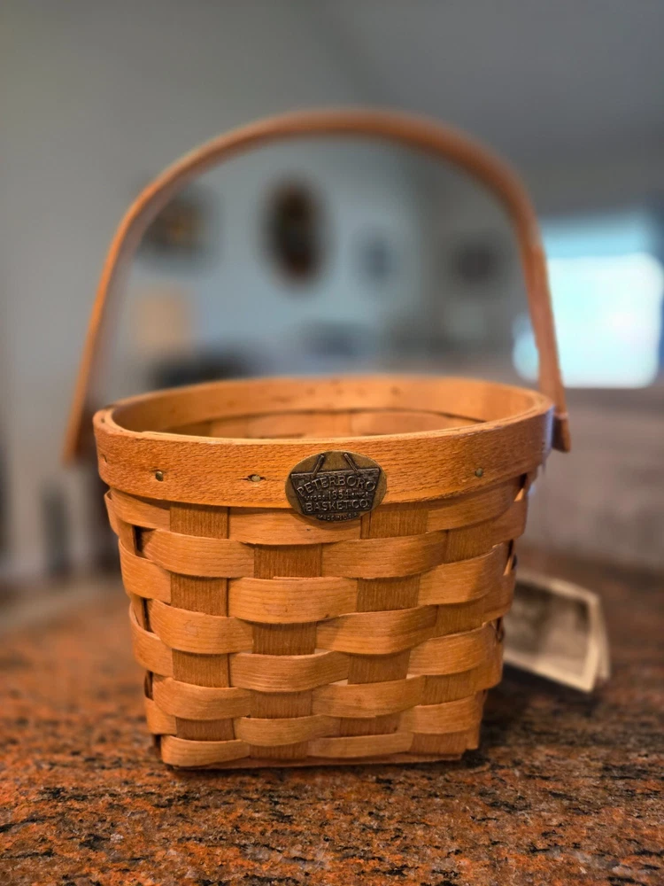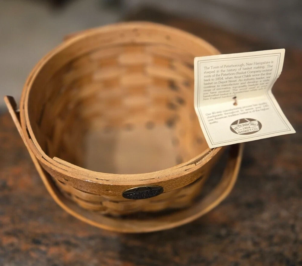 This beautiful Peterboro basket is a must-have for any collector of decorative items. Made of high-quality white ash, this medium-sized round basket features a brass logo, a hand-woven finish and a swinging handle and is perfect for all occasions. The basket's brown color and intricate woven design add to its charm, making it a great addition to any collection. This basket is 8 1/2" round and 6 1/2" tall. Handmade with care in the United States, this basket is part of the Peterboro brand and features the beloved Fruits Basket character family. Its unique features, including a handle and ample size, make it perfect for storing fruits and other decorative items. Add this stunning basket to your collection today!