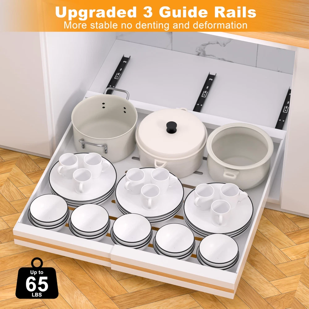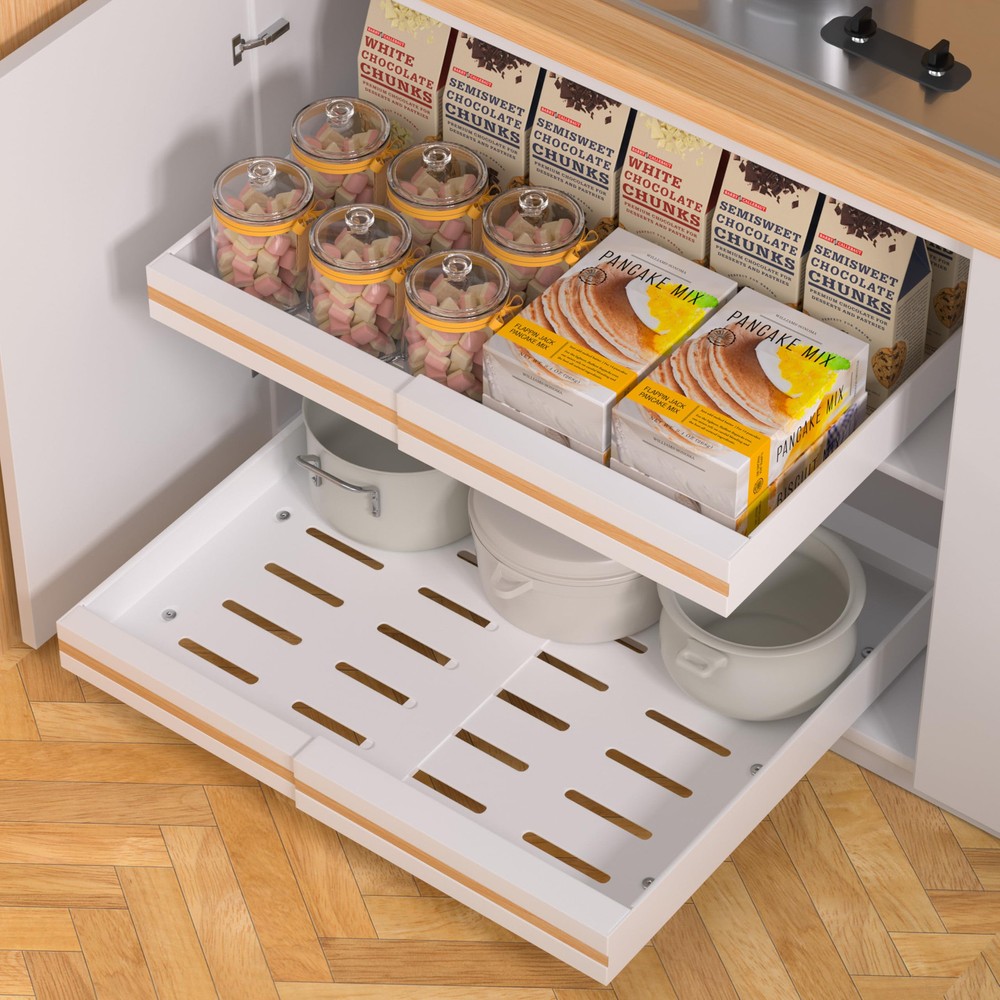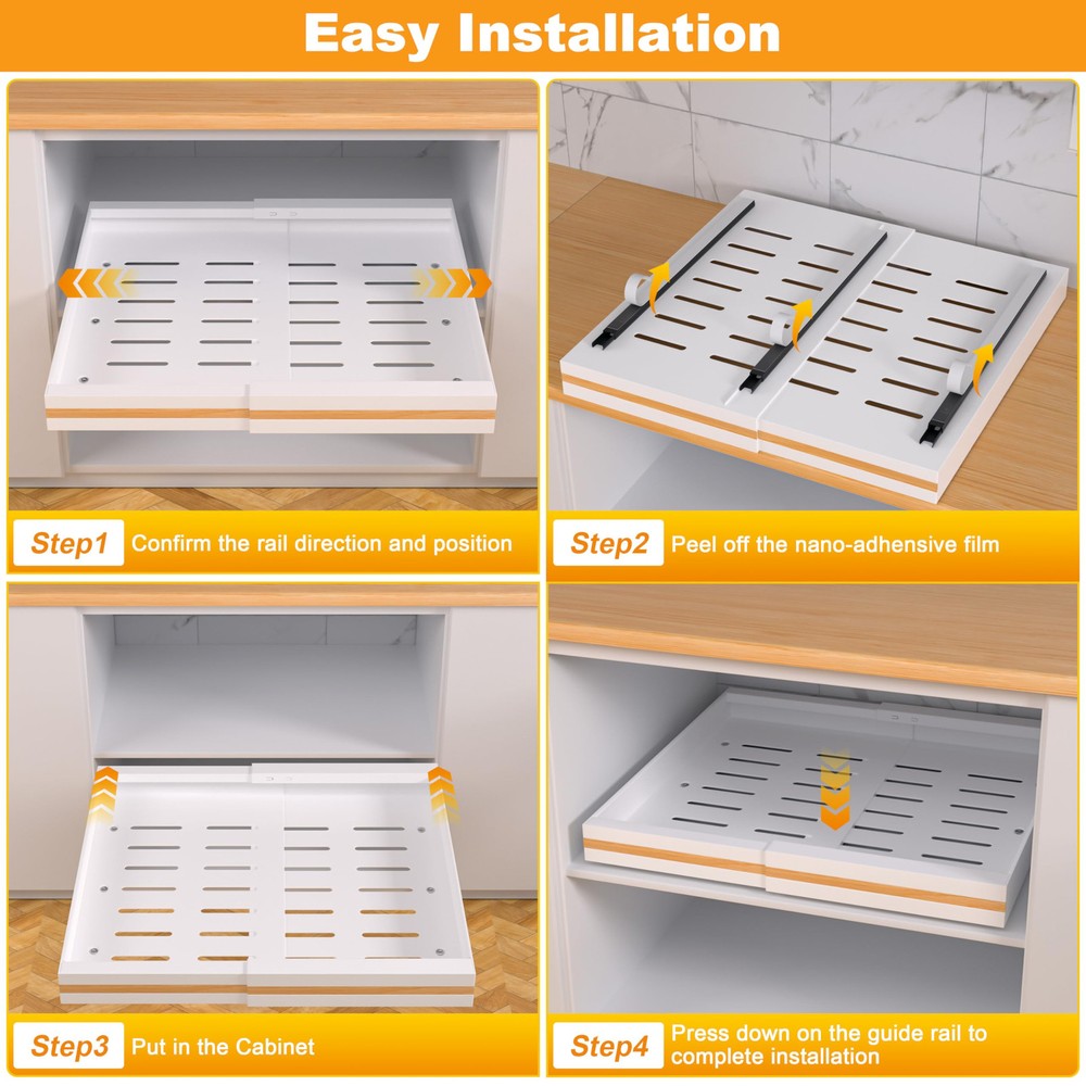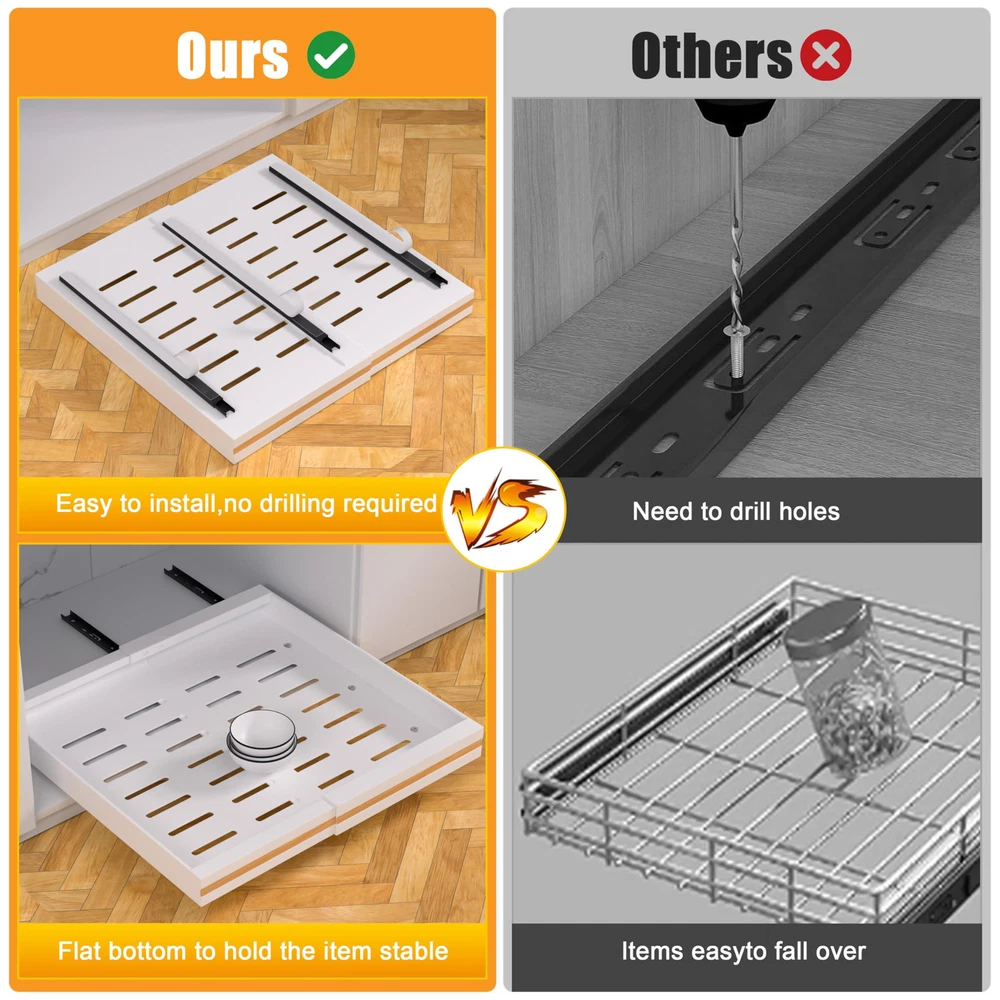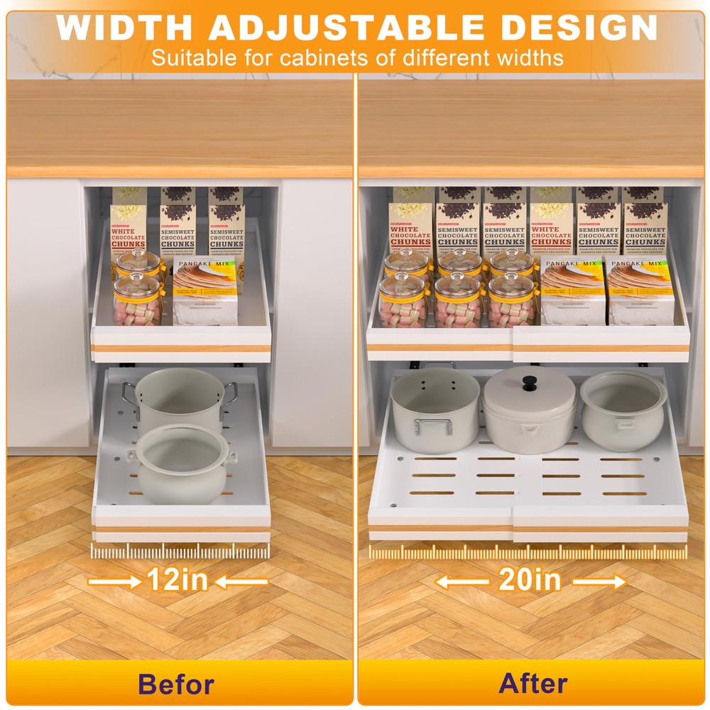 ✤『 Easy to Install』 :Our Sliding Out Drawer Organizers make it easier for you to store and access things,no need to kneel down to get items from the lower shelves and no need to remove items from the outside to get items from the inside,Keep your life neat and simple; ✤『 No Drilling&No Nails』: Our Cabinet Organizers are easy to install, Simply peel off the Double Side adhesive Nano Tape, and install them where you like; ✤『 Sliding Out Cabinet Drawer Organizer』 :The Pull-Out Kitchen Organizers equipped an extendable design can be adjusted to fit different kitchens cabinets,width range from 12" to 20", you can sort the storage and access items; ✤『 Multifunctional Cabinet Organizers』: Cabinet pull-out drawers are not only suitable for cabinets and kitchen Storage but also for food storage spices and some loose items. Widely used in the kitchen, pantry, bathroom, bedroom, living room, office and so on. ✤『 Premium Materials』: Our pantry organizers are made of premium Carbon Steel with a baking finish, Sturdy in construction, this sliding cabinet organizer will provide a strong load bearing to Store and organize loose items easily.
