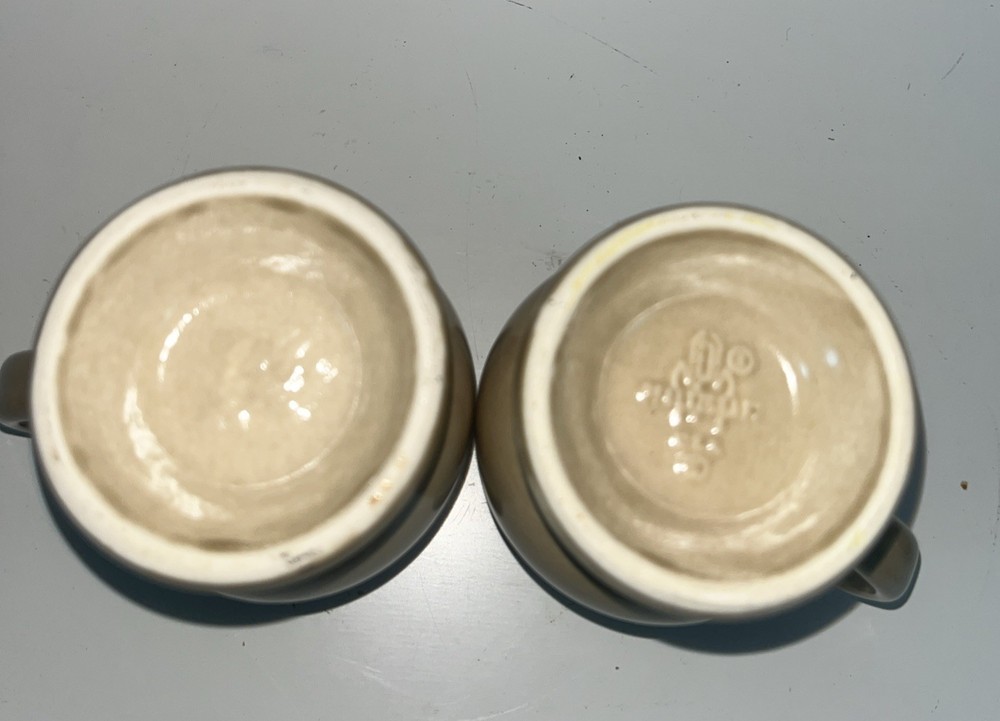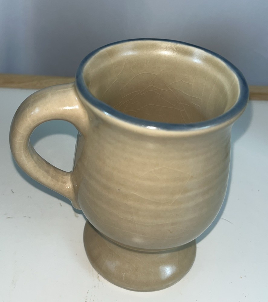 This set of two Pfaltzgraff Folk Art footed pedestal mugs is a vintage find from the 1980s, featuring a unique Folk Art pattern in tan with navy blue accents. Made of stoneware and originating from the United States, these mugs are signed by the brand, Pfaltzgraff, and are suitable for hot beverages. With a matte finish, microwave and dishwasher safe, these mugs are crafted with a pottery production technique, making them a special addition for any collection of decorative cookware and serveware.