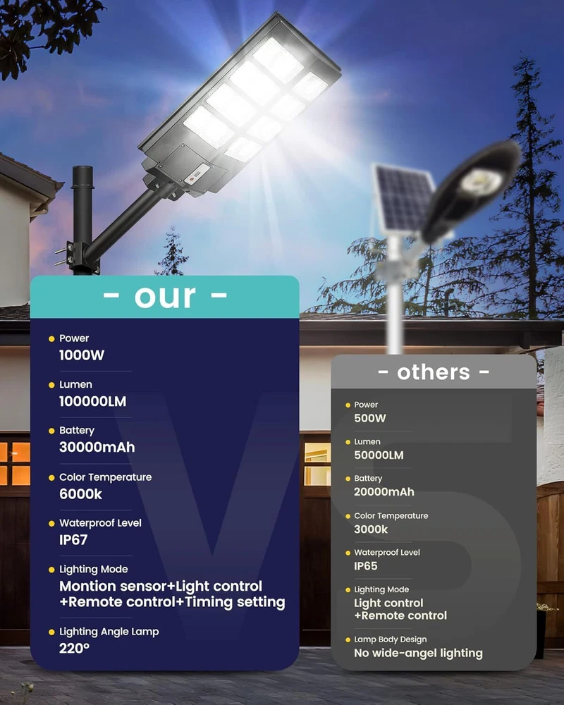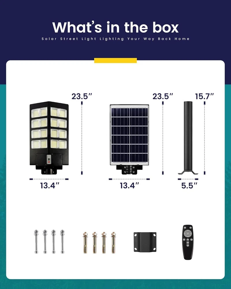 You may also like Commercial Solar Street Lights Outdoor Dusk to Dawn Solar High Bright Aluminum 90.99 USD Free shipping 1 Pair Black+Red Solar Panel Extension Cable Wire Solar Connectors 10 AWG Gauge 6.86 USD Free shipping PFCTART Commercial 2000W Solar Street Light Outdoor IP67 Dusk-to-Dawn Road Lamp 99.99 USD Free shipping NEW 8000W Commercial Solar Street Lights Outdoor Dusk to Dawn Super Bright 99.99 USD Free shipping 4Pcs 1000W Commercial Solar Street Light LED Lights Outdoor Lights Dusk To Dawn 460.88 USD Free shipping Outdoor Commercial 2000W LED Solar Street Light IP67 Dusk-to-Dawn Road Lamp US 79.99 USD Free shipping 【UPDATE DESIGN & RESISTANT USE】This upgraded version of solar street light, we use the thickened material design at the connection between the panel and light arm to prevent the lamp from breaking and falling due to harsh weather such as hurricane and snowstorm. And its mounting plate is specially thickened, the light arm is completely welded, which is more corrosion resistant and not easy to deformation. 【EXTREMELY BRIGHT & WIDE ANGLE LIGHTING】3000W solar street light has 640pcs super bright 5730 type LED SMD light beads to provides max 300000LM super brighter 6000K daylight at full night. This street led solar light are designed with 220 degrees wide-angle lighting, which can provide a wider range of lighting compared with ordinary street lights. Lighting area up to 3000-3500 sq.ft without blind spots. 【HARSH WEATHER-PROOF & IP67 WATERPROOF】This commercial solar parking lot lights has IP67 waterproof, rainproof and lightning-proof performance, -22° F~140°F temperature resistance, can work in all kinds of bad weather, harsh weather resistance. 【HIGH CAPACITY BATTERY & 0 ELECTRICITY BILL】Solar powered street lights uses 3.2V 30AH lithium-ION phosphate batteries with stable voltage and longer service life. 30000mah battery capacity takes 6-10 hours to full charging, continuous lighting for 2-3 entire nights. Solar-powered, no electricity bill produce, automatically turns on at dusk and turns off during the day. 【 INTELLIGENT CONTROL & 3 MODE AVALIABLE】 The solar street lights outdoor comes with a remote control providing convenient use in long-distance(30-39ft). You can choose different lighting modes: 1. Motion Sensor : keep 30% power lighting until detected motion automatically adjust to 100% power lighting, then return to 30% power brightness after the person leaves. 2. Always Lighting: There are 4 levels of brightness that can be adjusted. 3. Timed Lighting: 2H/3H/5H/6H/8H. The using instruction detail for the remote control is displayed in the Product Description. 【TWO MOUNTING WAY & EASY TO INSTALL】The package contains 2 kinds of mounting screws and accessories, as well as solar light arm poles. Easy to install, screw fixing, dependable operation without the need for wiring or trench. You can install solar pole lights outdoor on walls, trees, light poles, etc. where you want to insta18-25 ft). 【NOTE】Before the first use, please turn on the led solar street lights switch and charge it for 20-30 hours under direct sunlight. At store, we carry different wattages such as 1000W-5000W for you to choose from.