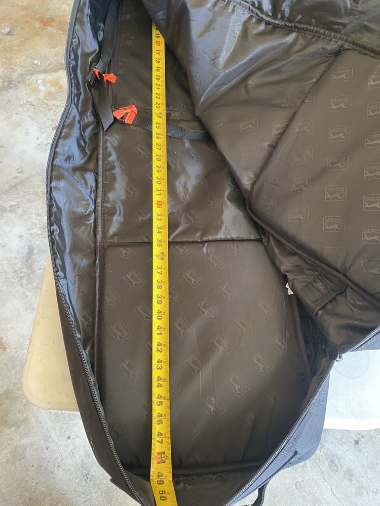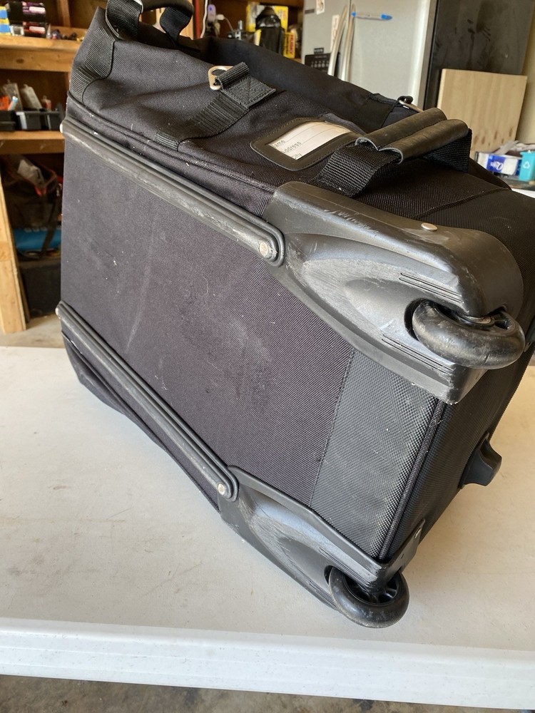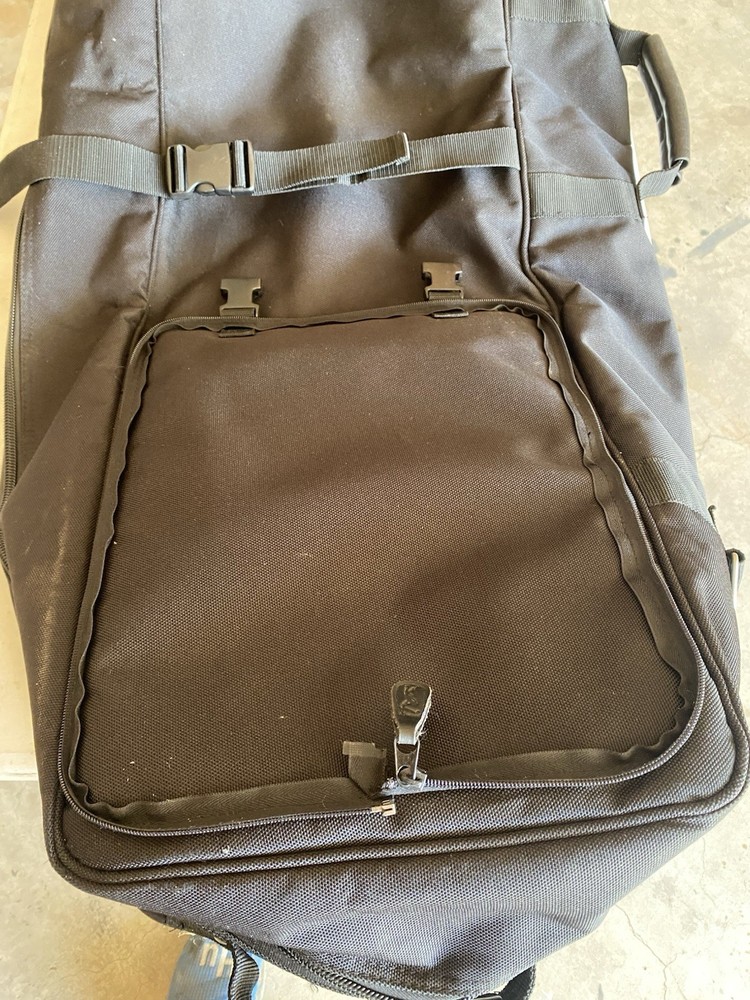Missing the top part of one of the zipper pockets(sse picture 3) , does not effect the club carrying portion of the bag. Wheels on base of bag for east slide around when traveling. Protect your clubs on your next adventure