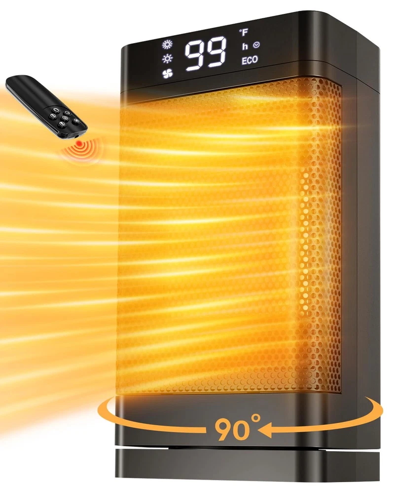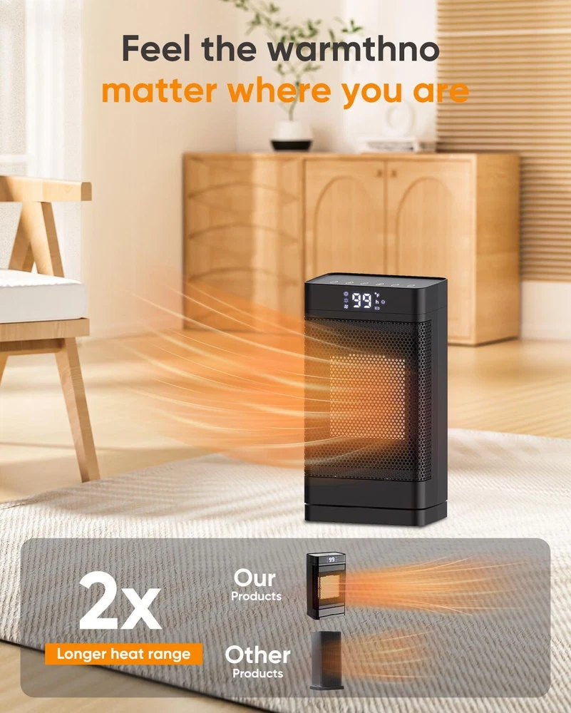 【More convenient and portable】:This DELLFY 1500W indoor heater is lightweight and you can carry a portable heater at any time :90 degrees wide Angle oscillation all-round scan, covering the entire area, providing all-round heating for your home, large room, interior, living room, bedroom, basement, office and more 【Heat the Way You Like】:space heater Strong heating and low energy consumption(High/Medium/Low/ECO/Fan Only),the heat comes in many forms,from powerful heat to 45% energy savings ECO heat. 【Excellent performance】:DELLFY space heater with 12 PTC ceramic heating plates and high-speed fan,UP to 99°F,can quickly heat to the temperature you want immediately,oscillation Angle up to 90° can quickly heat an area of 200 square feet. 【Multiple Safety Protections】:The space heater is constructed from flame-resistant materials, utilizing an upgraded version of ABS material that enhances flame resistance, effectively mitigating any risk of fire hazard. The Overheat Protection feature automatically shuts down the heater when it reaches a critical temperature. The tip-over protection system also deactivates the heater if accidentally 【Comfortable quiet】: No longer having to choose between quiet and warm, DELLFY's space heaters heat up quietly, thanks to the frictionless brushless DC motor and the turbulency-reducing winglet fan design, which reduces noise to 35dB, so you can sleep or work in peace.