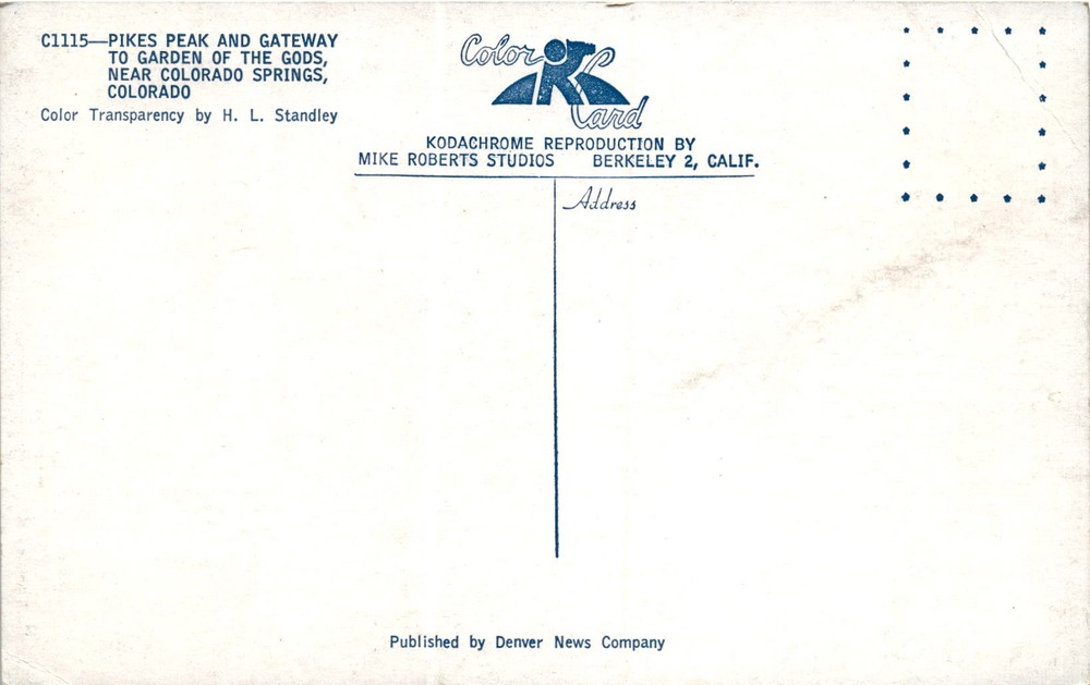 MAKE AN OFFER. THE MORE YOU BUY THE BETTER DEAL I WILL ACCEPT This postcard features a color transparency image of Pikes Peak and the gateway to the Garden of the Gods near Colorado Springs, Colorado. The photo was taken by H. L. Standley and reproduced using Kodachrome by Mike Roberts Studios in Berkeley, California. The postcard was published by the Denver News Company.