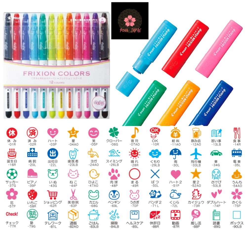 PILOT Frixion Erasable Stamps & Pens Set Description PILOT Frixion Erasable Stamps 60-different-design stamps in a set Erasable Mini Stamps which are useful for schedule notebook, Calendar, Planner and etc. PILOT Frixion COLORS 12 color pens in a set Erasable 12 color pens. 60 stamps and 12 color pens are all included in this set. Make your notebooks, notebooks, and cards cute! NOTE: Colors disappear when rubbed with a special rubber. Do not expose the ink to direct sunlight or place it in high temperatures. 60°C or higher will cause the ink to become colorless. Shipping All items will be shipped from Japan with a tracking number. Economy: Postal Mail (Japan Post) . Expedited: FedEx =Notice= Handling time: within 5 business days after payment. =Notice= We regret to inform our customers that this product cannot be shipped to any countries within the EU (European Union) or EEA (European Economic Area) due to Intellectual Property rights. International Buyers - Please Note: Import duties, taxes, and charges are not included in the item price or shipping cost. These charges are the buyer's responsibility. Please check with your country's customs office to determine what these additional costs will be prior to bidding or buying. Thank you for your understanding.