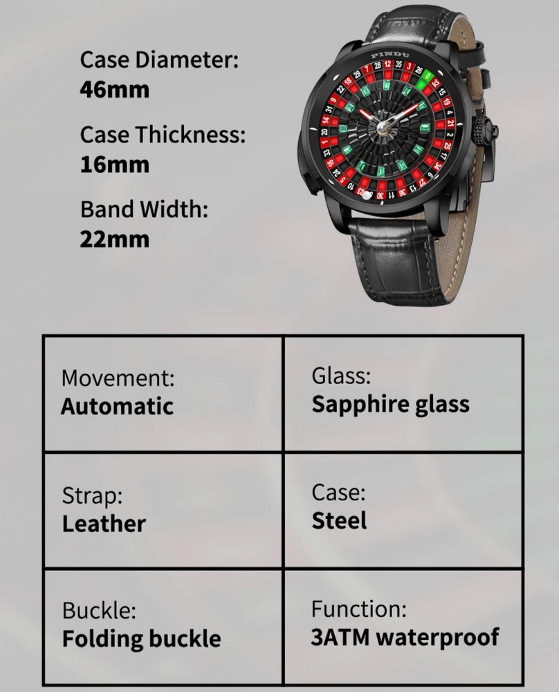 "First time limit, first possession" The new roulette watch is pre-ordered, and the top 10 will give the same strap, so come and lock your exclusive! • ⌚【Roulette Watch for Men】Sapphire Glass, Case legth 46mm/1.8in, case thickness: 20mm/0.7in, Band width 22mm/in. Miyota NH35A has an independently modified movement with a solid structure. • ⌚【Automatic Watches for Men 】Roulette watch is 316L Stainless Steel. Roulette contains 1 white beads of metal.The digital roulette will rotate with a slight shake of the wrist, and will stop rotating when the wrist is still.There is no button control. • ⌚【3ATM Waterproof 】3ATM waterproof watch, can withstand the damage to the watch caused by daily splashing, hand washing, sweat, etc, but it is not suitable for diving and hot water environment,such as sauna. • ⌚【Mechanical Watch】Operate without battery, automatic self-winding. However, proper manual winding is indispensable,which can effectively reduce time deviation. (⚠Note: Mechanical watch is different from quartz watch. Insufficient mechanical kinetic energy will cause the watch to stop, please winding it in time.) • ⌚【Gifts for Men】If you want your loved this roulette wheel watch, let friend or leader to feel the same happiness, you can also generously give this men watch as a gift on Valentine's Day, Father's Day, Christmas, Thanksgiving, parties, anniversaries or other holidays. • ⌚【100% After-sales Service Guarantee】 : Purchase without Worry. We offer a 30-day money-back guarantee for any reason.If you have problems during use of the wristwatch, please don't hesitate to contact us. We will offer you professional service Warm reminder: 1. Please pay attention to confirm whether the delivery address is correct when placing an order. If there is an address error, please contact the seller in advance to correct it. If not, the default address is correct. 2. If you still don't understand the product description before placing an order, you can contact the seller in advance to understand the situation. If you don't communicate in advance, you will know the description attributes of the sold product by default. Thank you very much for your trust and support of our watch products. Your support is the driving force for our continuous progress! Thank you sincerely for your purchase and look forward to serving you again! Our Policy 100% Authentic Guarantee with standard international express shipping. Products are shipped from China or the US (as indicated in the product description). Fast Shipping: Items dispatched within 24 hours (holiday delays may apply). 100% In-House Brand: All products come with original packaging. 30-Day Hassle-Free Returns: Easy returns/exchanges for unsuitable items. 100% Customer Satisfaction: Achieved through excellent communication. If the customer's country collects any import taxes or other taxes, we will not assume any responsibility. Shipping Instructions We do ship these items worldwide, and they typically take 15-25 days to reach the destination. If the product takes significantly longer than 25 days to arrive, please contact us in advance. Remote areas or certain locations may require an additional 3-7 days for delivery. If the customer's country imposes import duties, we are not responsible for paying any import taxes—the buyer is solely responsible for these charges. For standard shipping: Items shipped from China use eBay SpeedPAK Standard. Items shipped from the US use standard carriers such as Yun Express, DHL, UPS, or USPS. Return Policy We strive our best to provide our customers with the highest level of service. If you return the items within 15 days of receiving them for any reason, we will issue a refund. However, the buyer must ensure that the returned items are in their original condition. If the items are damaged or lost during return, the buyer will be responsible for such damage or loss, and we will not provide a full refund. The buyer should attempt to file a claim with the logistics company to recover the costs incurred due to damage or loss. Note: The buyer is responsible for the return shipping costs.