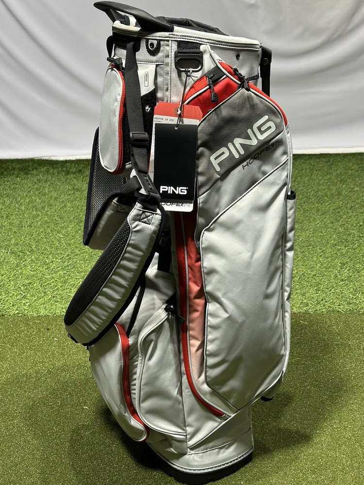 We are a reputable golf company that has been in business in St. Louis, Missouri since 1975. We have been doing this for 40 years because we do things right the first time. WE HAVE THE FASTEST SHIPPING ON EBAY! Don't believe us? Check out our Feedback. If you have questions, please feel free to ask. As always, thank you for looking. PING Hoofer 14 Stand Golf Bag COLOR: Light Grey / Red STYLE: Stand Bag DIVIDERS: 14-Way Divider CONDITION: New w/ Tags - See Pics (10/10) RAIN HOOD: Included The 14-way top is an organized golfer’s ideal arrangement, making club selection easy and orderly. To improve club removal and replacement, an innovative bag bottom guides clubs to the correct segment and keeps them separated while carrying or carting. A slimmer stacked pocket configuration allows for easier access to all 17 pockets. Made from rugged 300D polyester, Hoofer 14 sports a number of new colorways. Base With Club Dividers An innovative new bag bottom improves club removal by guiding clubs to the correct segment and keeping clubs separated while carrying. 14-Way Top The re-engineered top is more ergonomic to improve comfort and ease of handling, and 14 dividers give clubs individual attention and protection. Elevated Pocket Unique to the Hoofer 14 is a new elevated access pocket so no bending is required to access items that you want within easy reach. Big Ball Pocket An expanded ball pocket prevents the hassle of having balls spill out the sides when you have to poke around for a couple of fresh ones. Organized System A new stacked pocket configuration optimizes storage space and allows quick access the pockets you’ll use most often. Cart-Strap Channel This long-popular attribute enables you to keep the bag secured with a strap without blocking access to the pockets. Specifications: 14-Way Top 5.9 lbs. 17 Pockets 24L Pocket Volume Bag Bottom Design Improves Club Removal Leg Guards Help Leg Separation When Carrying Padded, Convertible Shoulder Straps Elevated Access Pocket Ergonomic Top Eases Handling Magnetic Rangefinder Pocket Water-Bottle Pocket Zippered Rain-Hood Pocket Cart-Strap Channel 300D Polyester