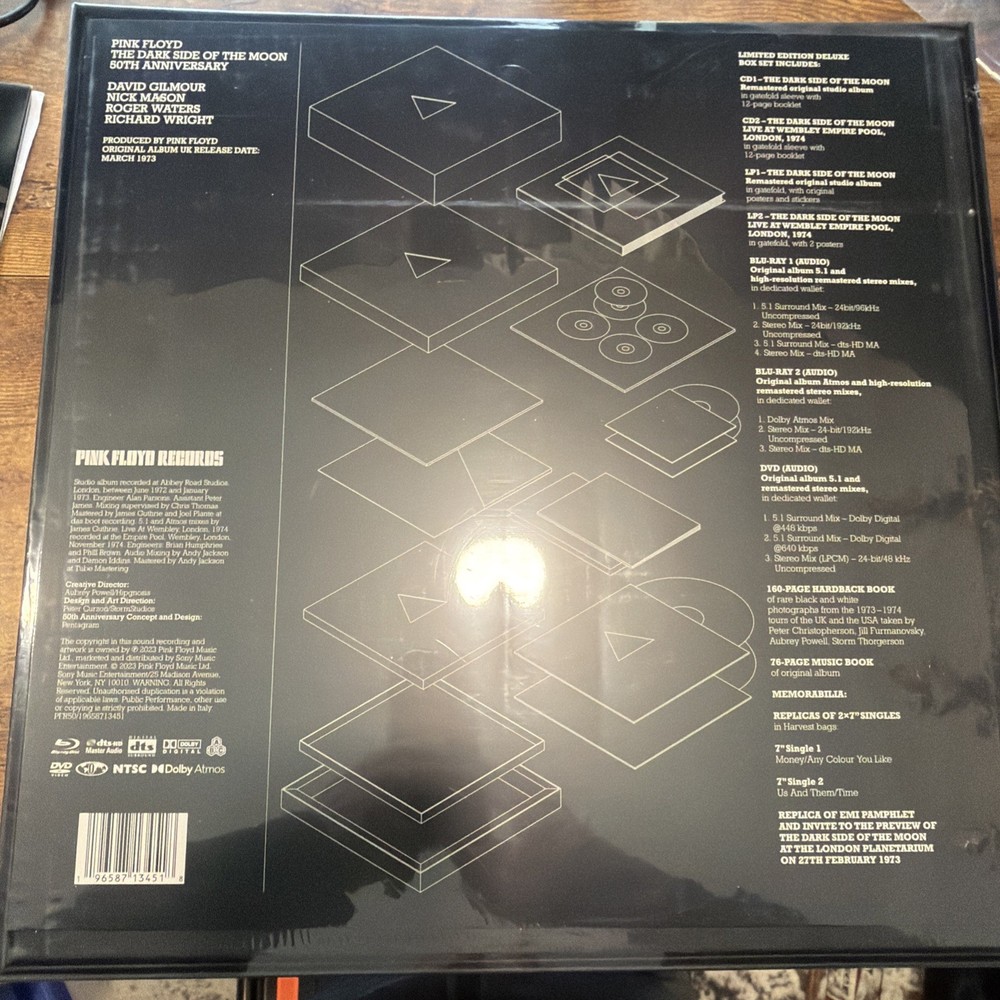 Artist:Pink FloydGenre:Progressive, Rock, PsychedelicType:Box SetUPC:0190296203671Format:RecordMPN:not specifiedRelease Year:2023gtin13:0190296203671Features:180 - 220 gram, 1st EditionCase Type:Cardboard SleeveMaterial:VinylInlay Condition:Mint (M)Style:Progressive Rock, Psychedelic Rock, Art Rock, 1970sRecord Label:Not SpecifiedEdition:Anniversary EditionRecord Grading:Mint (M)Record Size:12"Speed:33 RPMColor:BlackLanguage:EnglishSleeve Grading:Mint (M)Number of Audio Channels:StereoEra:1970sRelease Title:Dark Side of the Moon