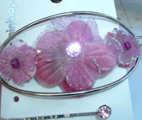 A beautiful ponytail holder or bun clip with 3 pink silk flowers measuring 3" wide, 1.5" tall with 4.5" metal stick. And, 4 silver bobby pins with chaton cut, prong set, pink rhinestones. Never worn, condition is excellent, gorgeous in dark or blonde hair..