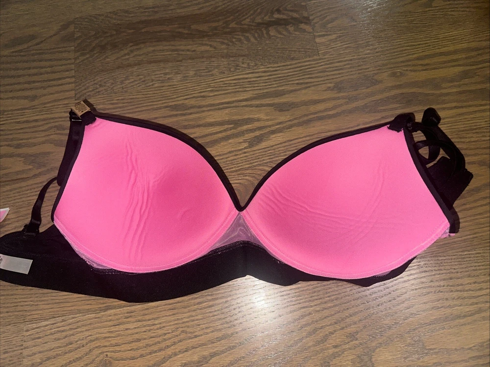 This PINK Victoria's Secret Black Script 32DD Wear Everywhere Wireless Push Up Bra is a must-have for any woman's intimate wardrobe. The bra features a solid pattern and a hook & eye closure, with bra straps that provide a comfortable fit all day long. The wireless push up bra is made of a polyester blended fabric and is part of the Victoria's Secret Pink Wear Everywhere product line. The adjustable straps and back closure ensure a perfect fit, while the padded cups provide a push-up effect. This bra is perfect for everyday wear and is a great addition to any wardrobe.