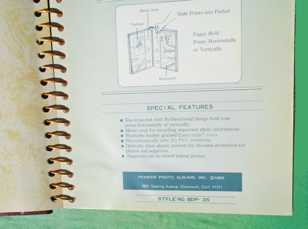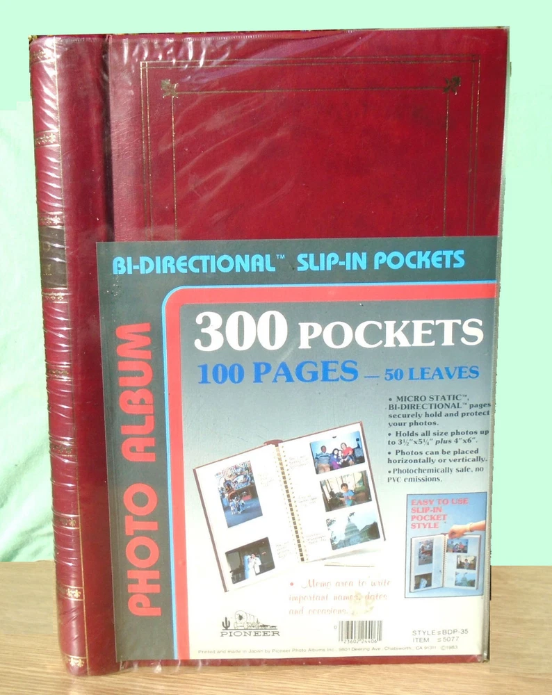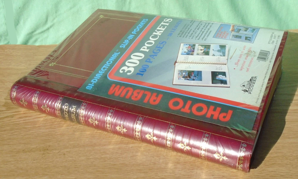 PIONEER PHOTO ALBUM You will receive one Pioneer Photo Album. Style #BDP-35. Item #5077. This Pioneer Magnetic Coil-Binding Album contains 50 sheets to hold 300 photos, three on each side of a sheet. Features a burgandy leatherette cover protected with plastic, designed to display and protect photos up to 4" x 6". The self-adhering overlay holds your photos securely in either horizontal or vertical format. Album measures 9¾"x14"x1½". • Book ships with 50 sheets to hold 300 photos • Usable page area 7¾" x 13¾" • Contains 50 sheets, plus coil binding • Hold many size photos including 2.5"x3.5" wallet up to 4"x6" • Patented Bi-Directional pockets hold horizontal or vertical photos, plus panoramics • Burgandy leatherette cover with gold stamping and a rounded spine • Photo safe: acid and PVC emission free • Memo area for recording important photo information • Negatives can be stored behind photos • Weighs 2 pounds 13 ounces The burgundy Pioneer BDP-35 Photo Album is designed to display and protect 300, 4x6" horizontal photos as well as panoramic images. Each of the clear side-loading 50 bi-directional 7¾" x 13¾" pages has a shaded background to hold either 3 horizontal or 2 vertical shots per side. The book-style binding enables the open pages to lay flat for quick loading and optimal viewing. A memo area next to each photo allows you to notate important information. The washable leatherette album has gold accents and is acid-free for archival, long-term storage of your photos. International Buyers are welcome. I accept This will ship in a cardboard box. Consider these options from which ebay takes 13.25% of the payment plus 30¢, then paypal takes 2.9% of the payment plus 49¢, then the post office takes for Priority $17.10 for a 3-pound 8-ounce package; $19.00 for Ground Select. UNITED STATES: Priority Mail is $17.50, Estimated delivery time 2-4 days Ground Select Mail is $20.00, Estimated delivery time 2-10 days ALL OTHER COUNTRIES: Click on the Shipping & Payment tab above for your country.