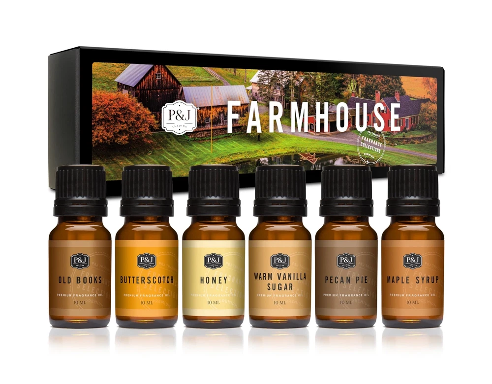 Our Farmhouse Set of 6 Fragrance Oils includes 1ea 10ml bottle of: Old Books, Fresh Baked Bread, Honey, Warm Vanilla Sugar, Pecan Pie, Maple Syrup - These Fragrance Oils are recommended for use in home and car diffusion, or diluted in your candle, soap, bath, body or hair care formulations. This product is intended for cosmetic and home fragrance use only. DO NOT ingest. DO NOT use in lip balm/care formulations. Discontinue use if irritation occurs. Keep away from children and pets. Oil Uses: Designed for but not limited to candle scents for candle making (especially works well with soy wax candle making), diffuser oil scents, freshie scents, oils for laundry, soap making supplies, slime scents, oils for skin, perfume oil, bath and body formulations, bath bombs, and many more essential DIYs. Made Easy: Amber shade bottles with easy dispensing euro dropper caps. Whether you are candle making, creating car freshies, or looking for the next summer essentials. Each fragrance oil scent is ready for any craft. Premium Grade: P&J fragrances oils are highly concentrated with a strong scent. With more than 30 years in the industry, these enhanced formulations were developed by our IFRA certified master perfumers. Our oils are safe and ideal for every home. Cruelty-Free: With over 150 different oils ranging from 10ml, 30ml, and 100ml bottles, we are proud each aroma is cruelty-free and phthalate-free. As well as sourced and manufactured in the USA. Flash Points >200 Farmhouse Set Includes: This collection features 6 - 10ml premium fragrance oils delivered to you in a beautiful gift box. A meaningful gift for both men and women whether you are attending a birthday, wedding celebration, or house-warming party.
