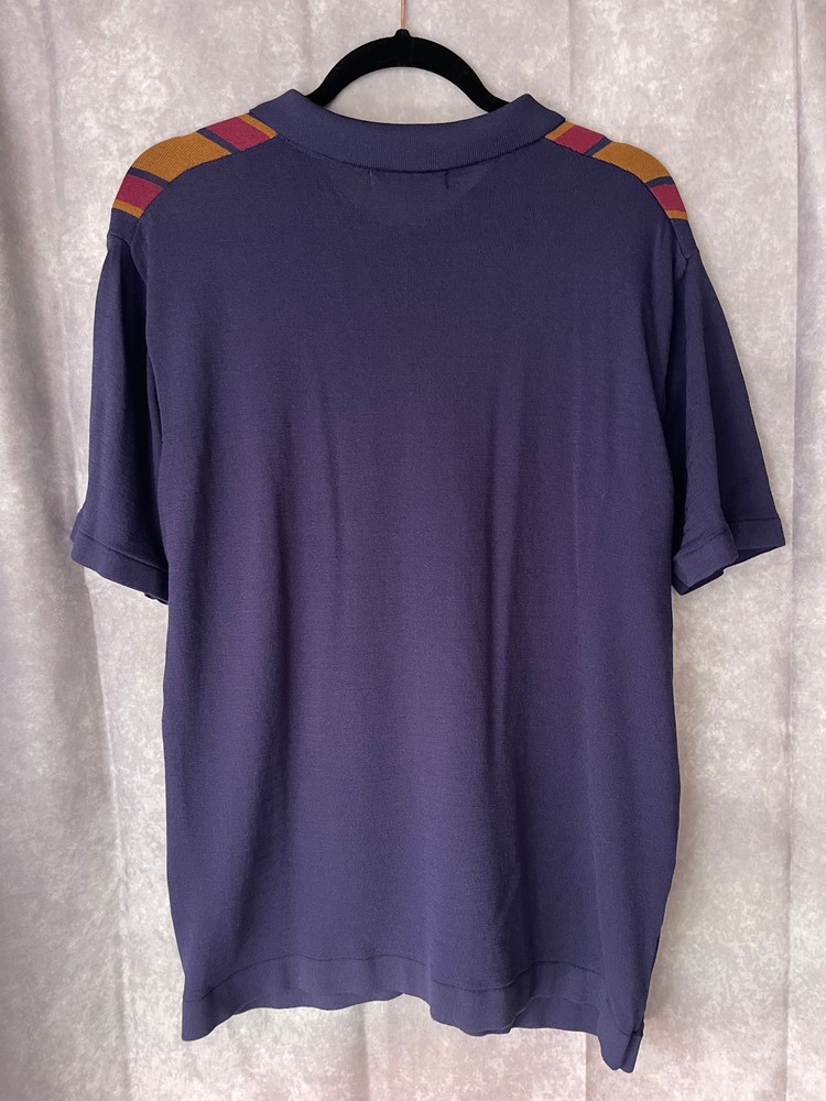 The PJ Paul Jones XL Vintage Knit Button Polo Shirt is a stylish and comfortable addition to any man's wardrobe. Made of 63% viscose, this short-sleeve polo features a collared neckline with a button closure, making it ideal for casual occasions. The spread collar and regular fit give it a classic and timeless look, perfect for the summer and spring seasons. Easy to care for with its machine washable fabric, this blue polo shirt from the brand Paul Jones is ideal for a round of golf or a casual day out. Top to bottom 27 1/2” Pit to pit 20 1/2” Shoulder to Shoulder 18” Sleeve length 9 1/2”
