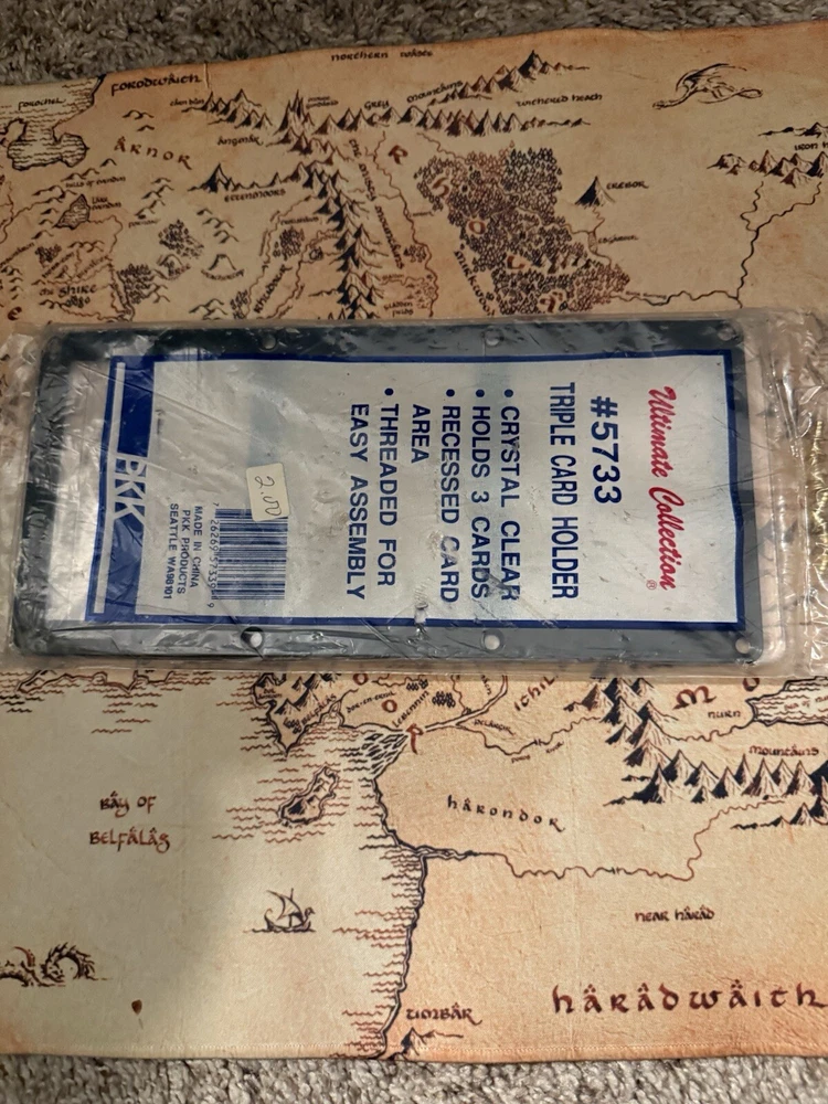The PKK Three Card Display is a screw-down card holder made of clear plastic with a black border. It can hold 3 standard-sized cards and comes with screws for secure display. This item is designed to showcase trading cards and keep them protected.