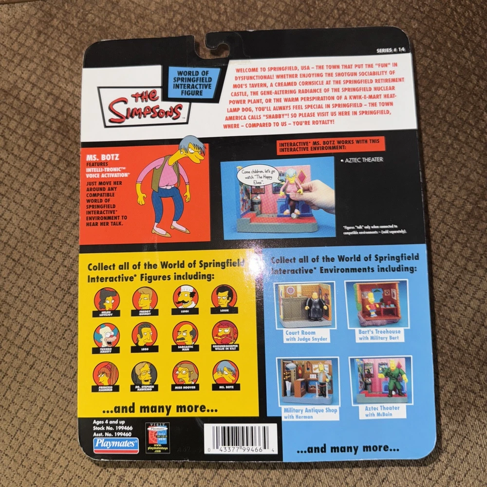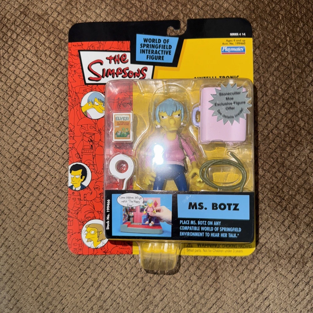 This action figure is a must-have for any fan of The Simpsons. The character, Ms. Botz, is part of the 14th series of the popular toy line, The World Of Springfield. Made of durable plastic, this unit is in its original packaging and is a great addition to any collection. The figure is in scale, 1:4, and features vibrant colors that make it stand out. This original, licensed reproduction is a vintage item and was manufactured in China in 2003. Perfect for collectors or as a gift, this Playmates Toys action figure is sure to bring joy to anyone who loves The Simpsons.