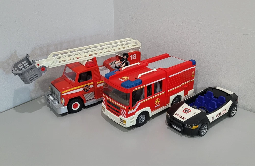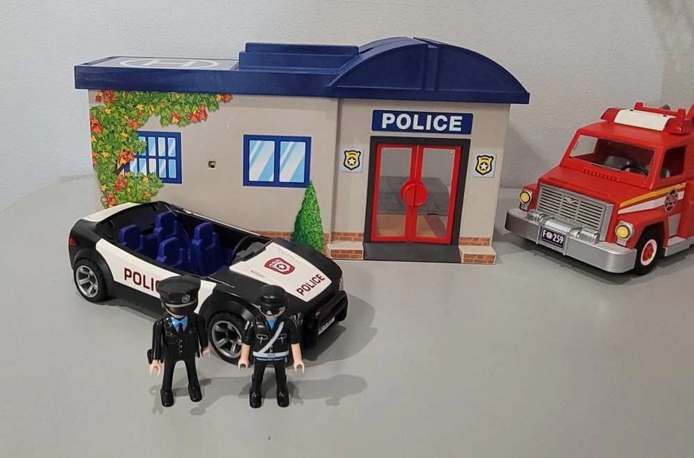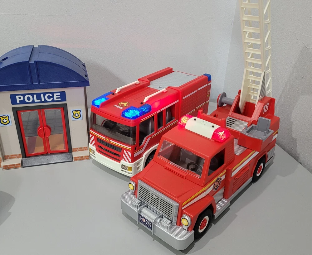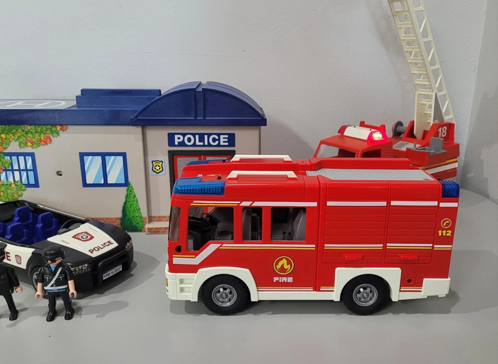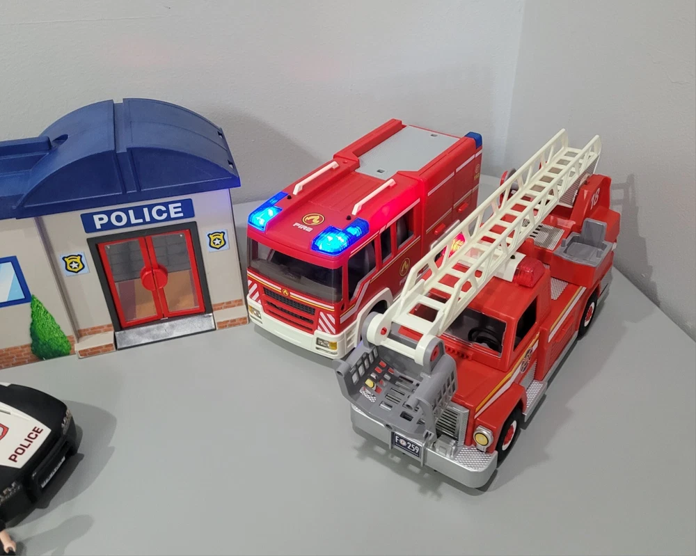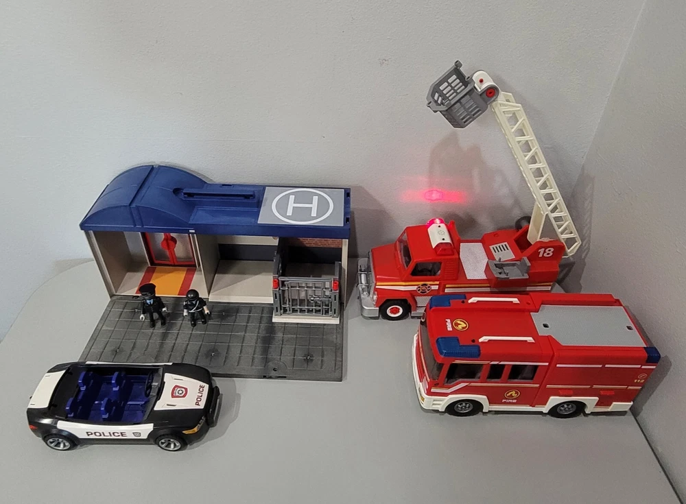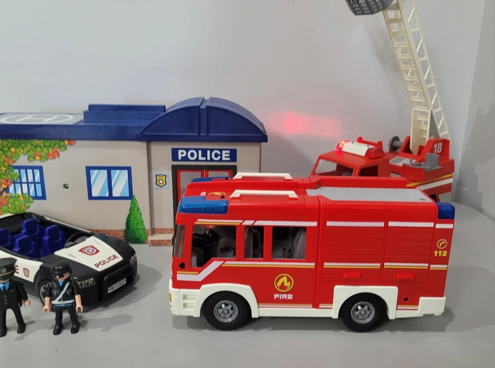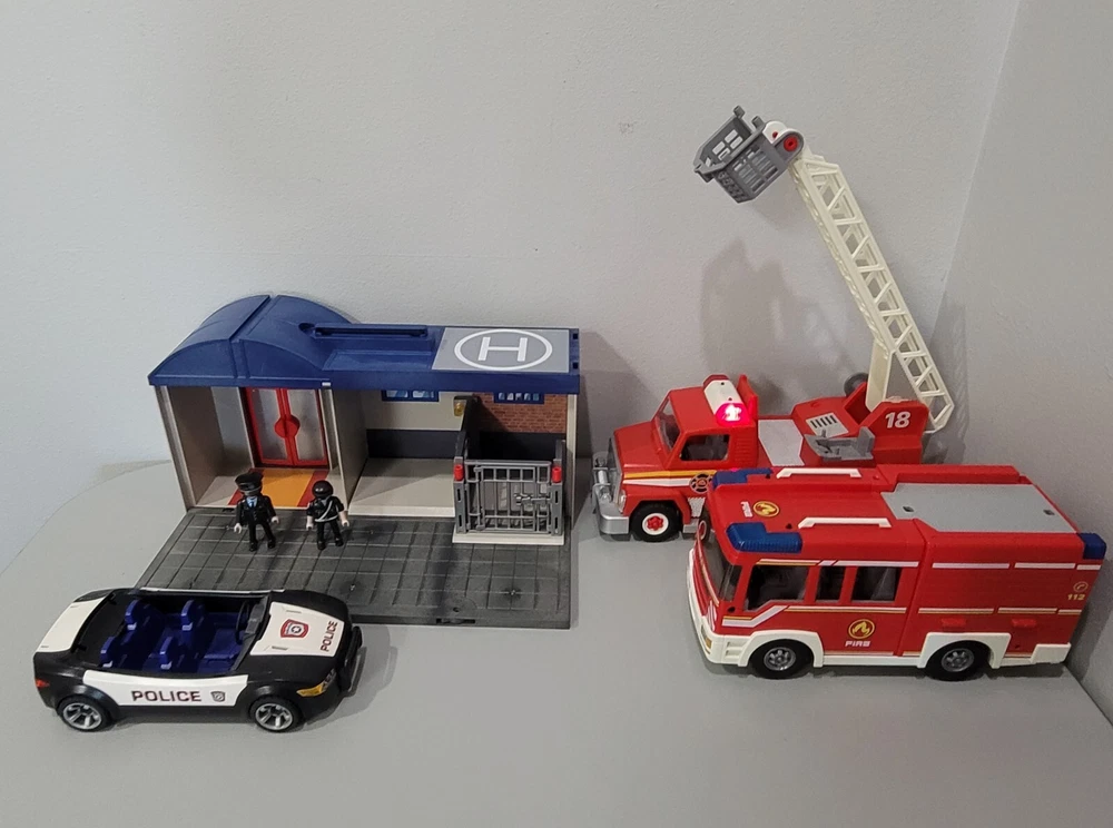 PLAYMOBIL City Action Police Station + FIRE ENGINE LADDER & EMERGENCY PUMPER LOT ✅️ ALL PRE-OWNED COLLECTIBLES COME CLEANED AND SANITIZED, THEN REPACKAGED IN POLYBAG FOR ADDED PROTECTION ✅️ Pieces come cleaned and sanitized - repackaged in polybags and ready to enjoy. Pieces are loose and set does not include any original packaging or accessories besides what is shown. Police Minifigures - 1992 / 1997 Police Station + Jail Pieces - 2011 Police Car (missing lights/ windshield) - 2014 Fire Emergency Ladder - 2012 Fire Engine Emergency Pumper - 2009 Lights and sirens on both Fire Trucks work as they should - battery terminals are clean and fresh premium-grade batteries will be installed prior to shipping. Set ships from WI in sturdy packaging - set ships free within USA using USPS or equivalent service. International shipping is available, standard delivery rates apply. Please reach out with any questions, and thanks for looking! Lot #PLAYMOBIL-EMS-LOT
