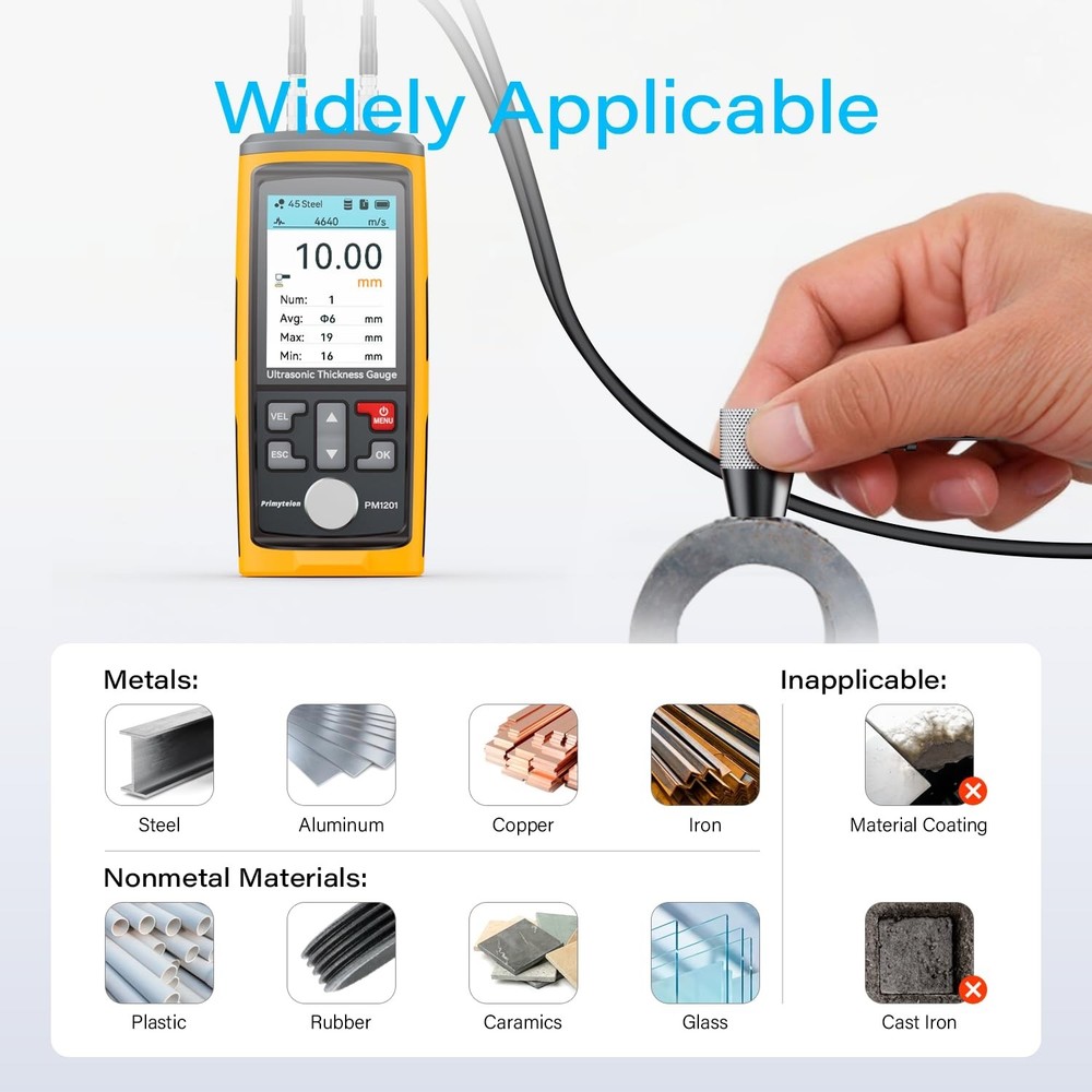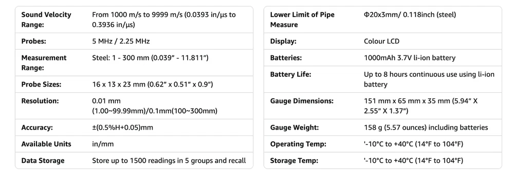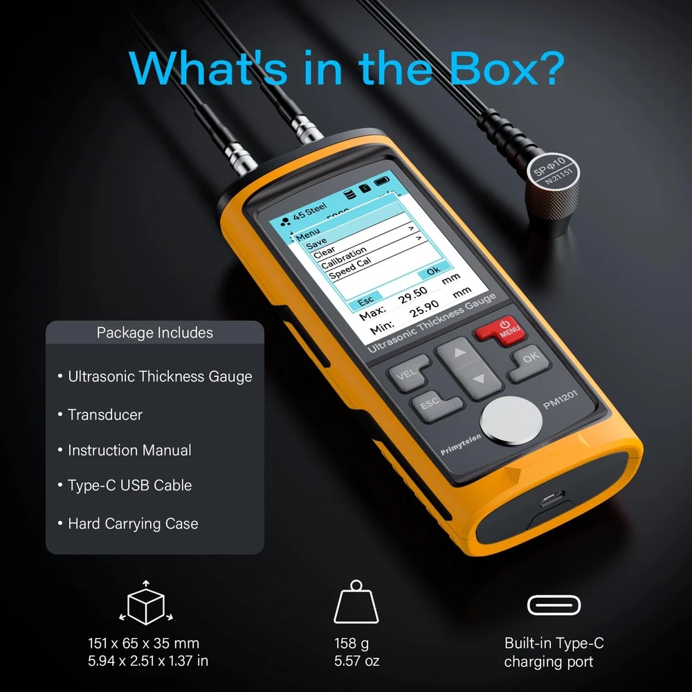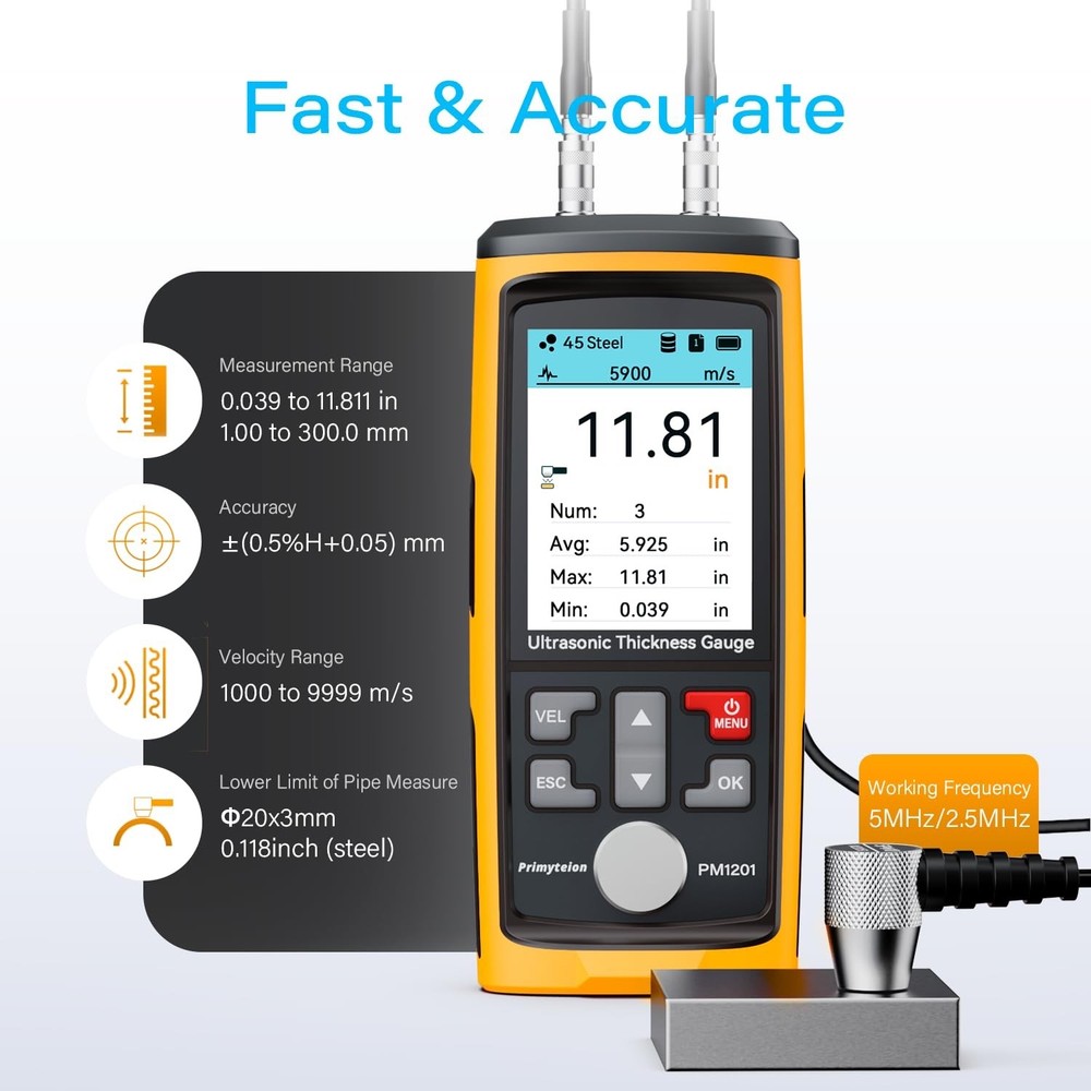Entirely Non-Destructive: You can measure material thicknesses from 0.039 to 11.811 inches (steel) in 0.5 seconds, with a resolution of up to 0.0003 inches, and an accuracy of ± (0.5% H+0.001 inches). Two units switchable (mm/in). Adjustable speed of sound: Adjustable from 1000-9999 m/s, with 12 material presets and customizable settings to ensure accurate measurements. Multifunctional: This ultrasonic thickness gauge features a color LCD backlight, enabling it to be used in all light conditions. , Min/Max/average mode, customized sound velocity presets, data storage, high & low limit alarms, low battery indicator, auto power off, automatic probe recognition features and support the connection of computer software for data recording and statistical analysis. Long Battery Life & Portability: This handheld ultrasonic thickness gauge weighs only 5.57 oz, making it easy to carry and operate. Equipped with a built-in 1000mAh rechargeable battery, it delivers up to 8 hours of continuous use. The ergonomic rubber housing ensures a comfortable grip while offering enhanced protection against impacts and abrasions. Buyer pays actual USPS shipping cost. IF YOU DO NOT PAY WITHIN 24 HOURS OF THE AUCTION CLOSING, YOUR ORDER WILL BE CANCELED - NO EXCEPTIONS. Most items ship the next business day after the auction closes. PLEASE NOTE, I DO NOT ACCEPT RETURNS. US Seller - not a drop shipper. I pack and ship all items. All items are new in original packaging. If you wish to combine your order with a future auction, please submit payment for your item and contact me. After you have paid for the item, I will hold it as long as you wish and combine with future orders. I will reduce the shipping cost when you are ready to have all of your orders shipped.