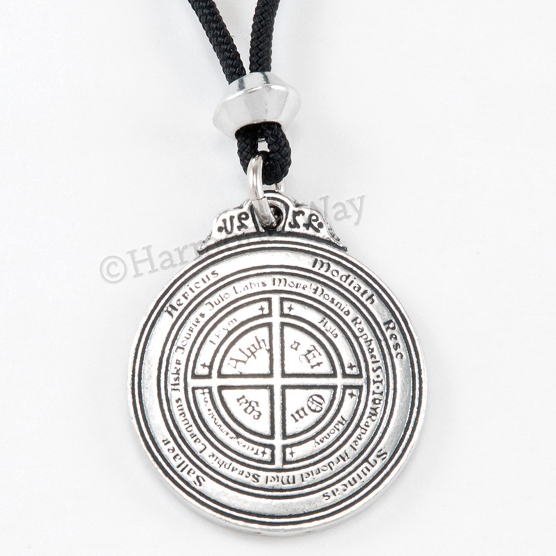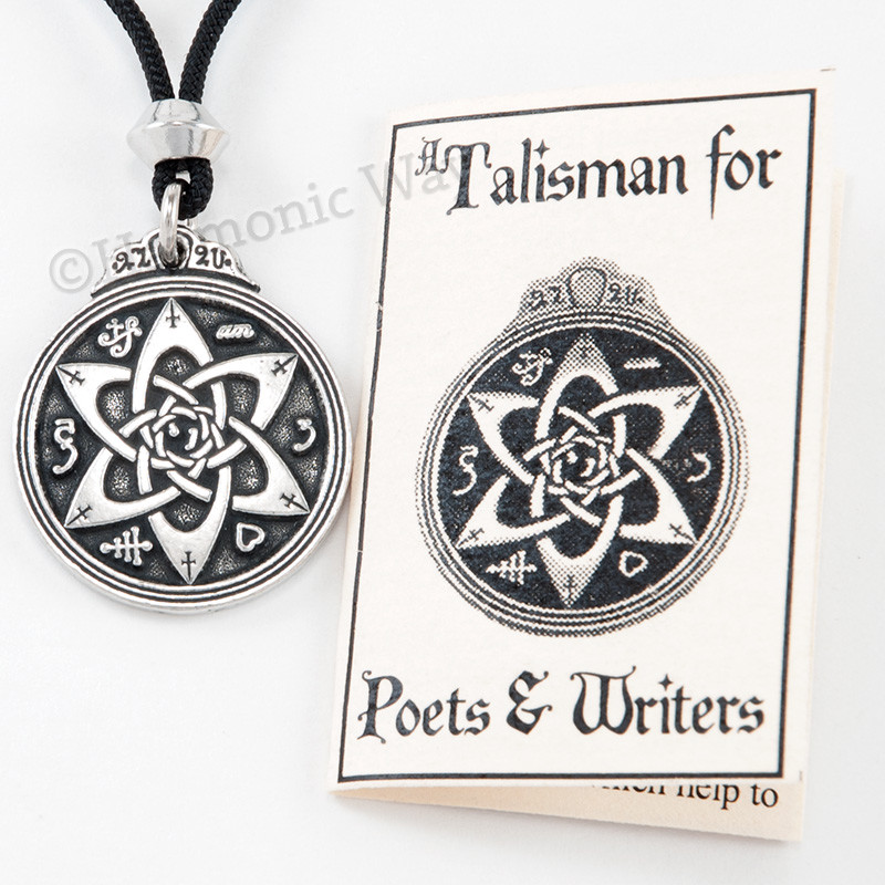 Talisman for Poets & Writers Pendant~ Our talismans are carefully chosen for their great powers and correctly prepared using the traditional methods of great age known to only a few skilled craftsman. Use them with goodness and wisdom as they are very powerful . Our talisman is updated from a design found in an ancient grimoire of magical symbols. The design consists of powerful Sigils of various Angels and Alchemical symbols around a rendering of a six-pointed star done in the Celtic style. These symbols are said to help one find the right word at the most opportune moment. Anyone wishing to embark on a career in radio, television, stage or screen will find this talisman a powerful and inspirational tool. May this pendant assist in all of your writing endeavors...poems, plays and books, even your personal journey! This piece is Superbly hand-crafted in the highest quality lead-free Pewter available. A unique finishing process is used resulting in one of the most beautiful lines of jewelry you can find! This pendant is brand new, detailed on both sides and comes with a 36" black cord with accent bead. 1 1/4" h x 1 1/8" w approx.