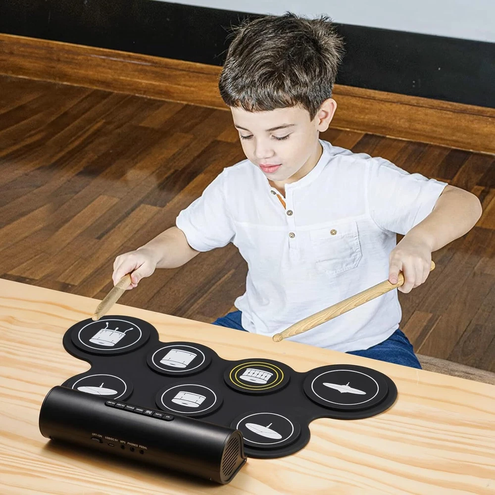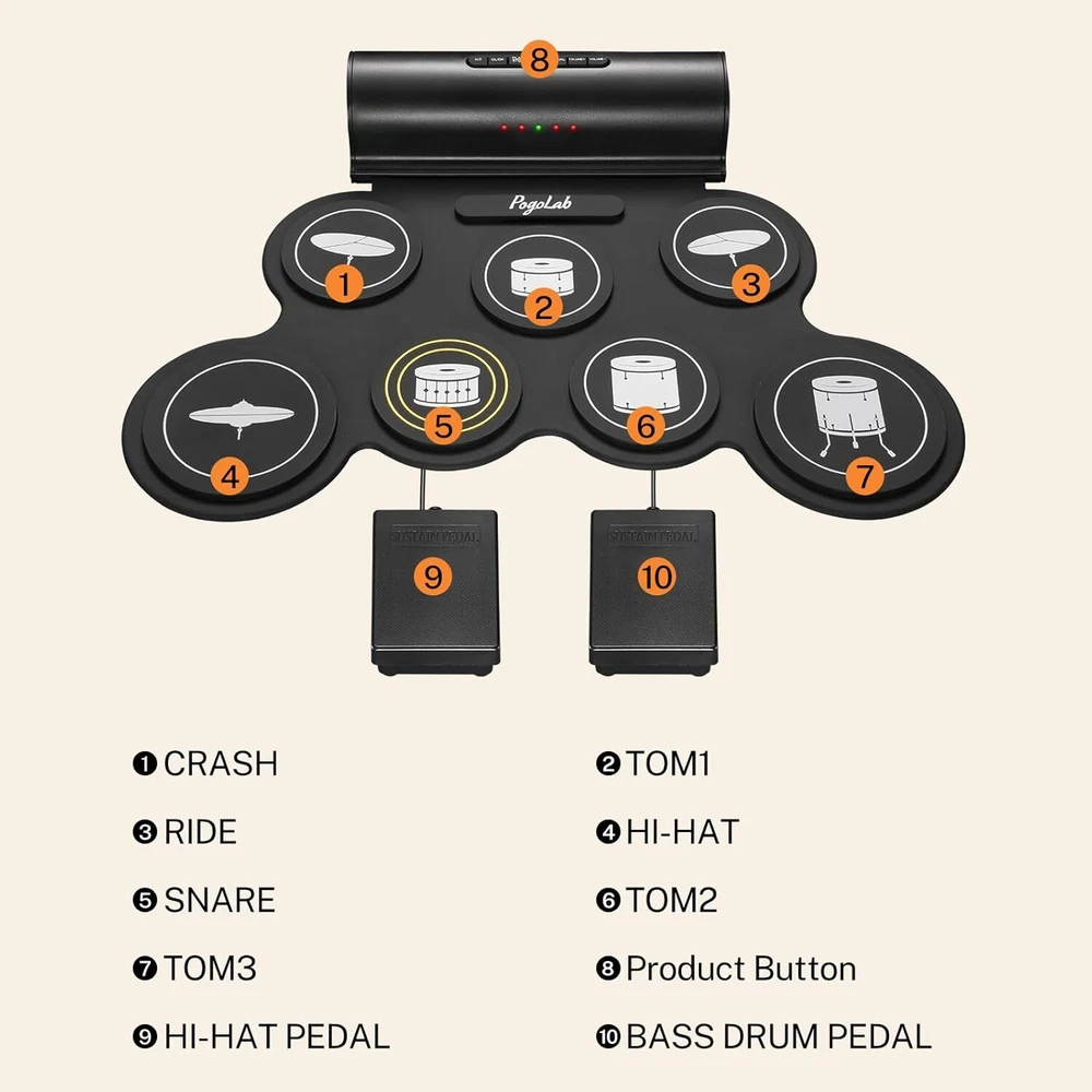 POGOLAB Roll up Electronic Drum Kit, 7 Digital Drum Practice Pad Mat with Dual Brand POGOLAB Material Silicone Model name POGOLAB Item dimensions L x W x H 44 x 28 x 6 centimetres Connector type Usb Features 🥁【Electronic Drum Set for Fun】: Kids Drum Kit has 1 SNARE, 3 TOMS, 1 CRASH, 1 RIDE, 1 HI-HAT; high-quality sound sample taken from real drum source, more realistic strikes and delicate sounds, ideal Christmas birthday gift of practical drum pad for beginners. 🥁【2W Dual Stereo Speakers】: Electronic drum pads has built-in high quality speakers that bring super bass effect. NO external speaker required, convenient to practice at home or outdoors. Support external stereo speaker to have more loudly sound. 🥁【Roll up Drum Machine】: Foldable and waterproof soft silicone digital percussion pad. Lightweight and great for limited space. Nice portability. Easy to clean and maintain. 🥁【Bluetooth Connectivity and Headphone Slot】: Connect the practice drum pad to phone via bluetooth and play your favorite songs on the speakers, say goodbye to boring practice! Besides, the drum pads have a headphone slot, you can make as much sound as they like without disturbing anyone else. 🥁【Rechargeable Battery & Long Playing Time】:The electronic drum kit is powered by computer, laptop or DC 5V USB charger. 8-10 hours drumming but only 2 hours quick charged. You can take it with you and play when camping, outdoor party, outing teaching, etc. 🥁【What You Get】:1 Year Manufacturer; 1×foldable electric drum; 2×drum mallets; 2×sustain pedals; 1×USB cable; 1×3.5mm to 3.5mm cable. Our Business 100% Customer Satisfaction We go above and beyond to ensure you receive the best level of service. Returns We want you to be happy with your purchase, however in the rare occasion that you are not, please let us know and we will contact you to arrange either a collection or a refund. Please CONTACT US before leaving any negative feedback and we will promptly sort out any issue with your order. 5976197