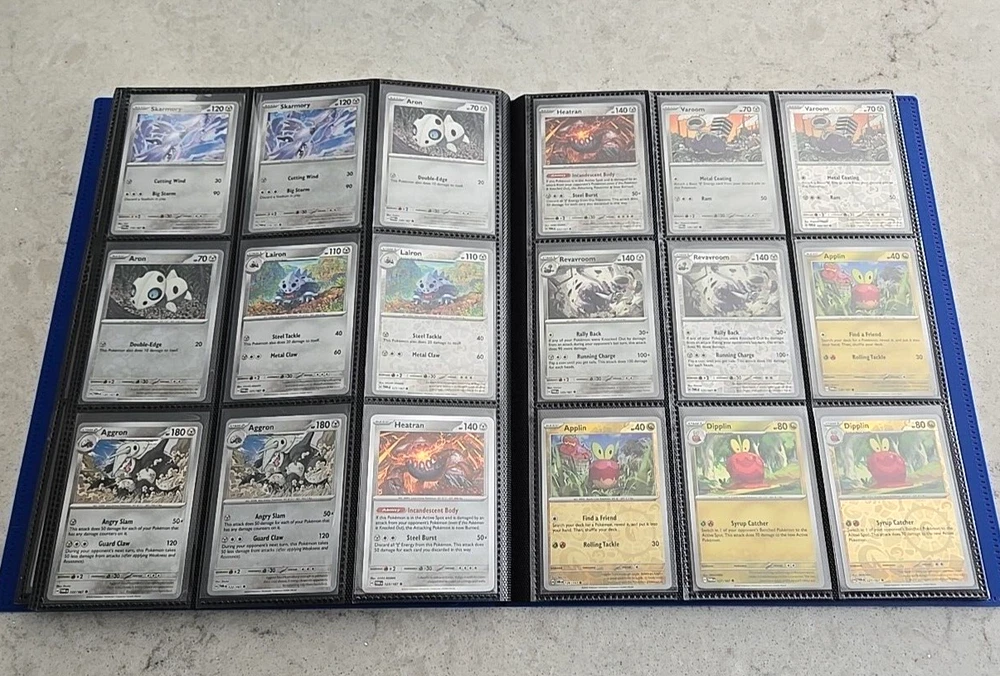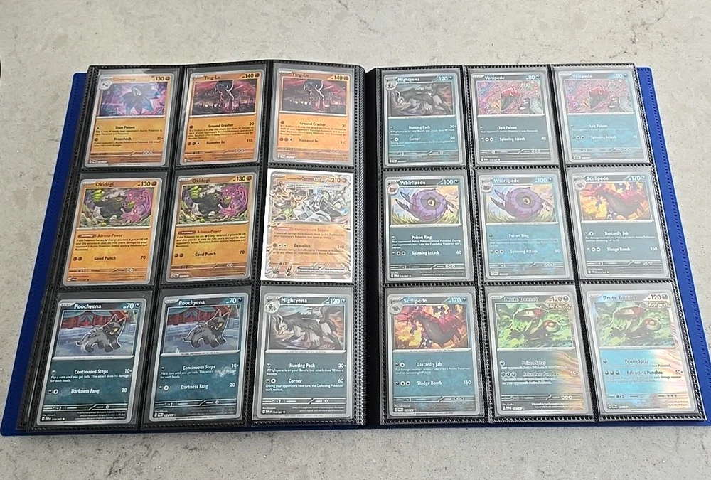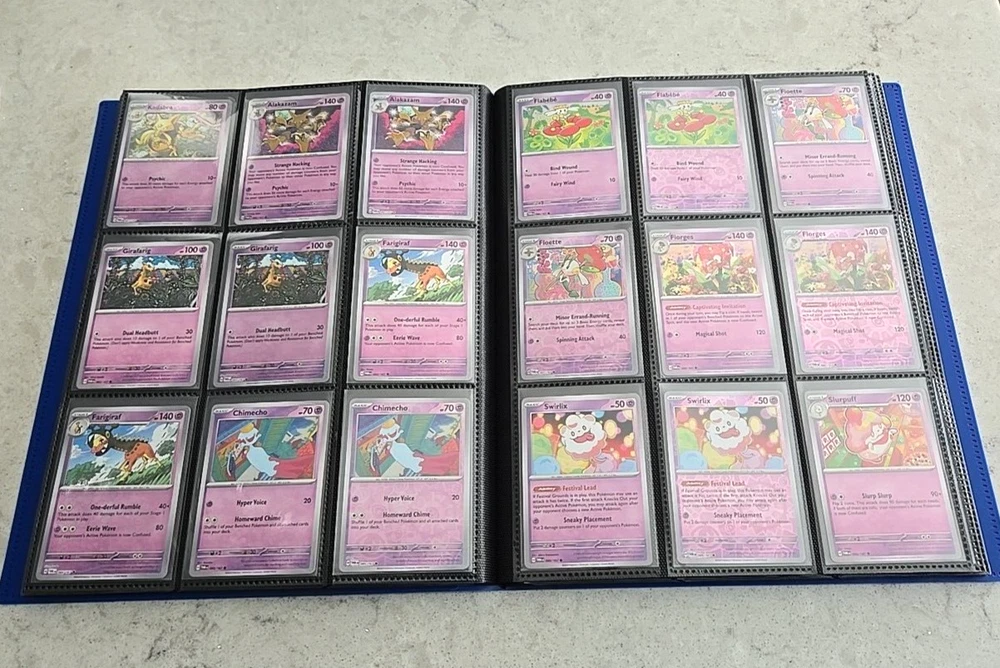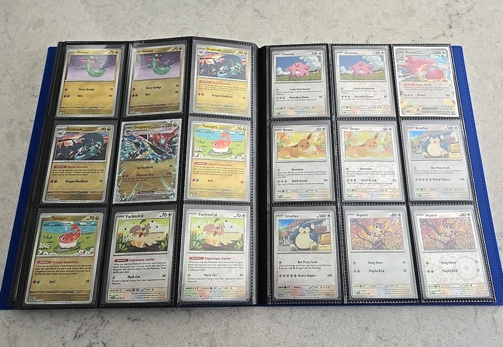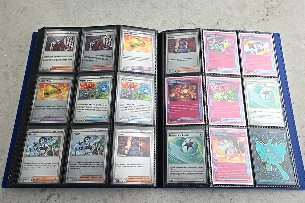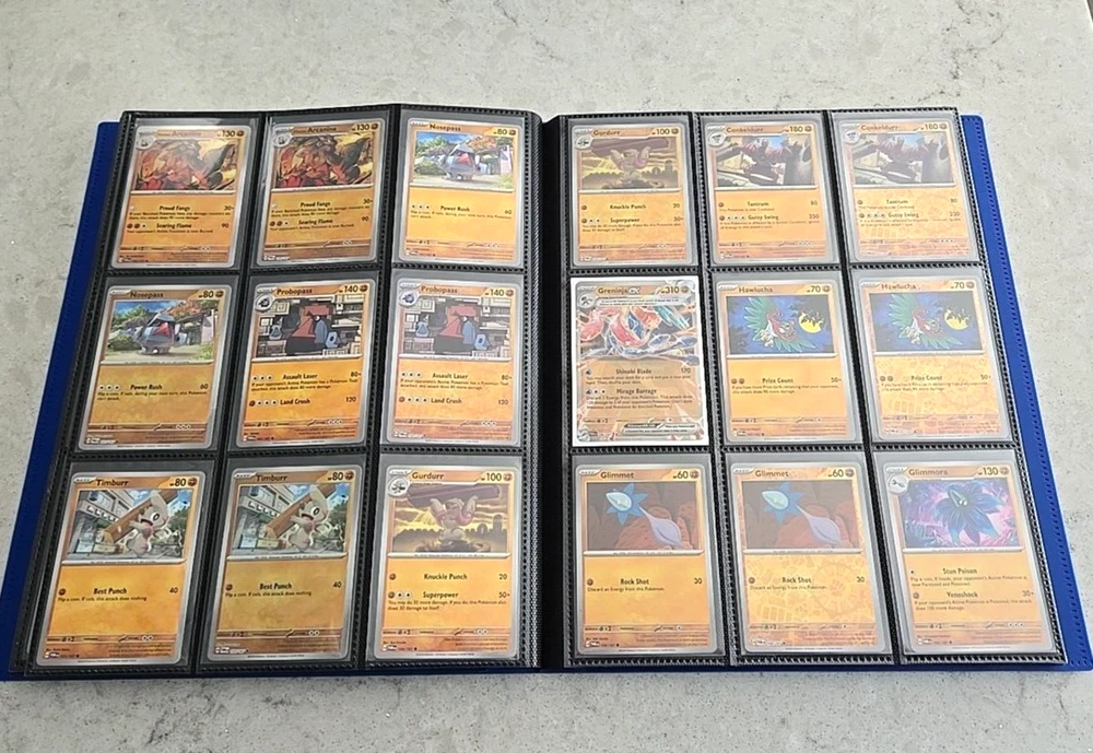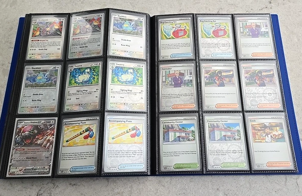 2024 POKÉMON TWILIGHT MASQUERADE BINDER COMPLETE BASE CARD SET This Base Set consists of all cards 001 thru 167 Plus 147 Reverse holo, 8 Basic Energy and 1 Online Live cards! 323 Total Cards One of the best Starter Collection Sets you will find..... Everything included is pictured which includes: - Binder is the BLUE 9-Pocket Gorilla Trading Card Album Folder - 360 Side Loading Pocket brand - Set is organized in order with only one card per binder pocket. - All Common/Uncommon/Rare/Rare Holo/Reverse Holo/Energy cards were individually sleeved with Ultra Pro Card Sleeves before placed in binder pages. - All V, VMAX & PROMO CARDS. are sleeved in a Pokemon ETB Premium Sleeve with Gold backing , then put in binder pages. - Cards have not been played with and are Near Mint or Better condition. This set includes: (147) Commons, Uncommons and Rares cards (147) Reverse holo cards (14) Double rare cards (6) ACE SPEC rare cards (8) Energy cards (1) Live Online 323 Total Cards Everything will be safely packaged and shipped via USPS Priority Mail. Please see photos for condition. The item pictured is the exact item you will receive. If you are condition sensitive please do not hesitate to contact for in depth pictures. If multiple quantities are available, you may not get the exact card shown but one of the same condition. All Pokemon cards are in NM or better condition. Each card will be placed in a top loader Ultra Pro soft Penny standard card sleeve and then placed inside a Superior Quality standard top loader. Then packaged securely to ensure it arrives in perfect condition i n an eBay standard envelope with Free Tracking. Here is our condition scale: POKEMON CARDS: Please see photos for condition. The item pictured is the exact item you will receive. If you are condition sensitive please do not hesitate to contact for in depth pictures. If multiple quantities are available, you may not get the exact card shown but one of the same condition. MINT (MT) - Cards in (MT) condition are in flawless condition. No signs of wear present. NEAR MINT (NM ) - Cards in (NM) condition are close to (M), but can have slight scratching, edge wear, and or chiping. LIGHTLY PLAYED (LP) - Cards in (LP) condition have visible evidence of wear. This could be in the form of minor indents, whitening, nicks, and or scuffs. Eye appeal will be satisfactory. MODERATLEY PLAYED (MP) - Cards in (MP) condition have more advanced signs of whitening, minor to major indents, nicks, light creasing, and or scuffs. Noticeable wear. HEAVY PLAYED (HP) - Cards in (HP) condition have major whitening, indents, nicks, and or scuffs. Creasing and damage is likely to be present on these cards. This condition also includes damaged cards. Disclaimer: You are receiving the item that is listed. Just because something doesn't meet your grading standards doesn't allow for a return. Shipping Options: First Class Mail - $4.49 Orders $19.99 (excluding. sales tax) and under will be sent with free tracking information in an eBay approved white envelope. Orders $20.00 (excluding. sales tax) and over will be sent with free tracking information in a bubble mailer. Priority Mail - $9.99 2-3 Day shipping Orders will be shipped in a flat rate envelope. Priority Express Mail - $29.99 1-2 Day shipping Orders will be shipped in a flat rate envelope. *All orders over $100 will be sent with free insurance. All orders over $250 will be sent with free insurance and signature confirmation.* ebay Store Policies 1) PAYMENT - Please send payment within 24 hours of the closing auction or item. We make every effort to ship items the very next day after payment has been received, If you need more time, please contact us. 2) SHIPPING - See above . We always take great pride in wrapping your items. 3) COMBINE SHIPPING - I s available, we will make every effort to keep shipping costs as low as possible in every situation, and will give you options for shipping, where applicable. 4) INVOICES - W e do print invoices with your shipment. 5) PURCHASES - If you're unhappy with your purchase, please contact us first so we can rectify the situation. We treat our customers with the up most respect. 6) QUESTIONS - Please ask first before bidding. We try to take the best pictures to represent and item. With coins, grading is an art and we do our best to grade correctly, so please bid accordingly. 7) PROMISE - Your satisfaction is guaranteed, and we offer a no questions asked return policy within 30 days of purchase. Please see our feedback, we are very easy to work with and contact us for any reason if you are not happy with any purchase. Buy with confidence! USA Seller, ship fast, safely, and over 3800+ positive Feedback on our eBay Page! ____________________________________ Thank you for shopping with Sacagawea Dollar Store! We greatly appreciate your feedback!