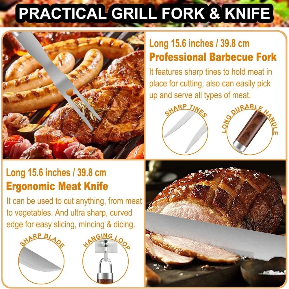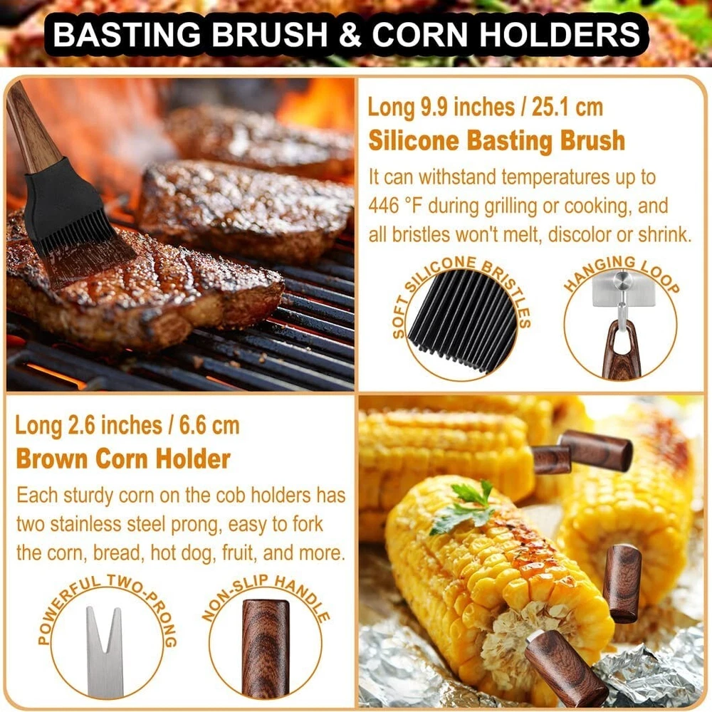 POLIGO 22PCS Camping Grill Utensil Set for Outdoor Grill Set Stainless Steel Grill Accessories in Case - Premium BBQ Tools Grilling Tools Set Ideal Birthday Christmas Grilling Gifts for Men Dad Women · Premium & Practical Grill Set - This complete and professional BBQ kit has almost everything you need for grilling, includes barbecue spatula, grill tongs, BBQ fork, meat knife, 4 skewers, 8 corn holders, salt & pepper shaker, silicone basting brush, grill cleaning brush, replaceable head of grill brush and aluminum storage case. · Durable & Exceptional Quality - The grilling accessories are made from extra thick and solid professional grade stainless steel, more durable and safer than other BBQ utensils as they will not bend, crack or rust after extended use. Coming with perfect heft, each essential of the grill kit can behave well in your grilling, which will take your grilling experience to a whole new level. · User-friendly Design & Easy Cleaning - The heat resistant long handles keep your hands safe from the heat. Hanging rings design enable easy storage during the off-use. And BBQ accessories are clean-up easy with warm soapy water, or throw them in the dishwasher so that they're ready for the next grill day. · Convenient Storage & Perfect Gift - Our BBQ utensils set comes with delicate carrying case, keep all the smoker grill accessories neatly organized and protected in the storage case when you storage or you go. Also, this BBQ grill set perfect to serve as a wonderful gift set for men and women. Even an ideal choice for Father's day, Birthdays, Christmas, housewarming, wedding or other occasion that deserves to be celebrated.