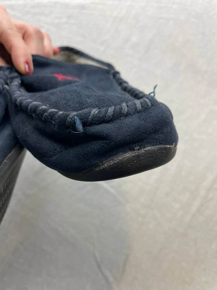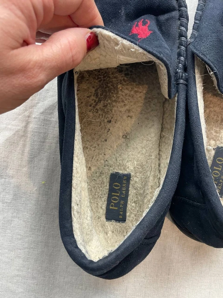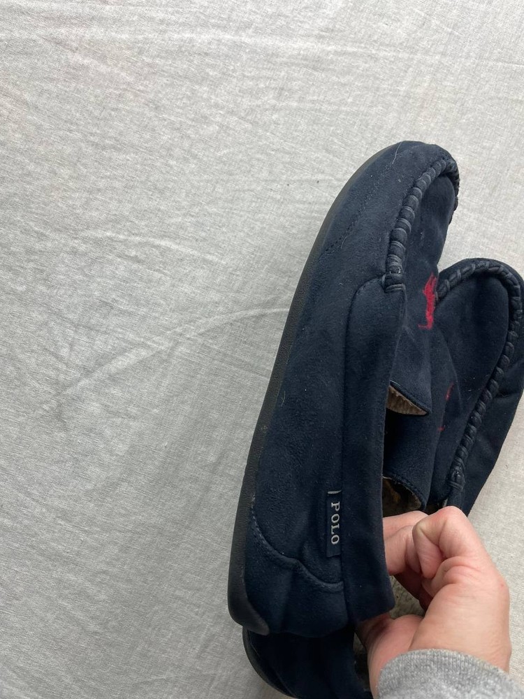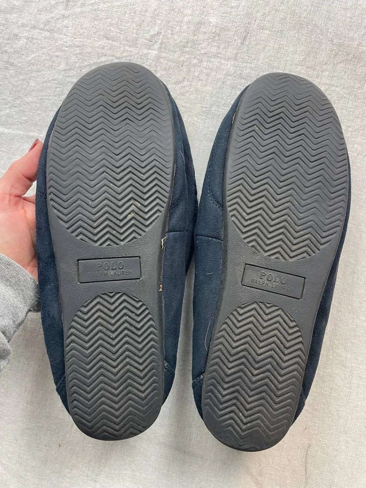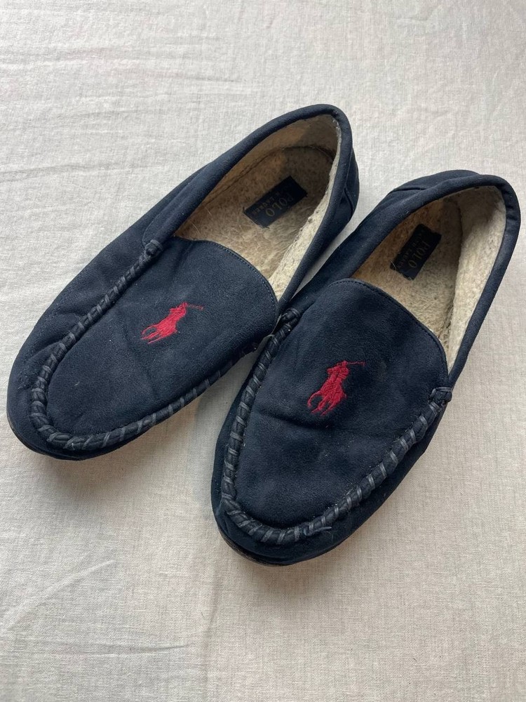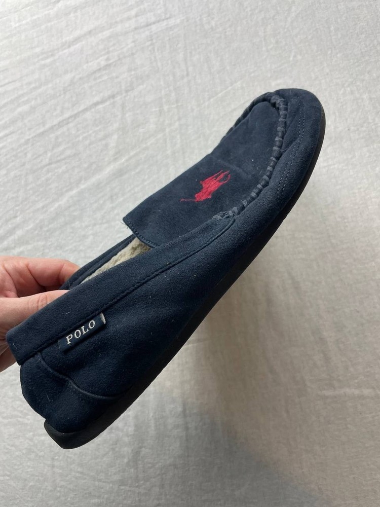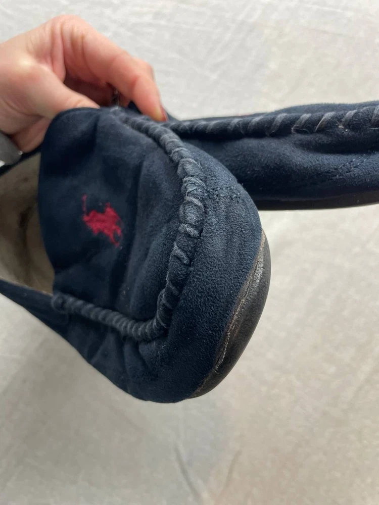 POLO RALPH LAUREN Mens Size 12 Moccasin Slippers Declan Red Pony Blue Suede Pre-owned, exact items on photos