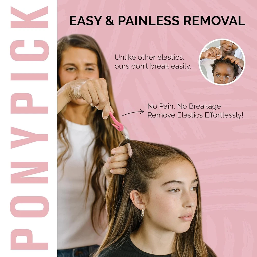 VIBRANT COLORS FOR EVERY OCCASION – Includes 1,000 durable elastics in red, pink, purple, and white, adding fun pops of color to any hairstyle. Perfect for holidays, themed parties, or everyday wear! DURABLE AND STRETCHY – Made with high-quality elastic material designed to hold even the thickest or textured hair securely without snapping or losing shape during wear. NO PAINFUL PULLING – Designed for gentle removal, these elastics won’t tug, snag, or break hair, making them a great choice for kids and adults alike. PERFECT FOR CREATIVE HAIRSTYLES – Whether you’re braiding, ponytailing, or styling intricate updos, these elastics provide the versatility you need for fun and unique looks. GREAT VALUE PACK – Get 1,000 elastics in equal parts red, pink, purple, and white at an affordable price, ensuring you always have the perfect accessory for every hairstyle. Product Description The video showcases the product in use. The video guides you through product setup. The video compares multiple products. The video shows the product being unpacked. The Pony Pick Collection Add to Cart Add to Cart Add to Cart Add to Cart Add to Cart Add to Cart Add to Cart In the Box 3 Pony Picks & 50 Elastics 3 Pony Pick Pets & 50 Elastics Pomade 1000 Elastics 500 Elastics 1 Mini Bush Spray,Brush,Comb,Picks,&Bands For All Hair Types ✔ ✔ ✔ ✔ ✔ ✔ ✔ Easy to Use ✔ ✔ ✔ ✔ ✔ ✔ ✔ Safe for Children ✔ ✔ ✔ ✔ ✔ ✔ ✔ Patented Pony Pick ✔ ✔ ✔ ✔ ✘ ✘ ✔ What is the Pony Pick? The Pony Pick is an elastic hair band cutter designed for quick and easy removal of rubber band hair elastics without causing any damage or pain. It's suitable for all hair types and aims to reduce the time typically spent on removing hair bands. How does the Pony Pick work? Place the tip of the Pony Pick under one loop of the elastic band, lift the pick up and away from the hair to cut the band, then slide the pick to remove the elastic. It's crafted for a quick, efficient, and pain-free removal without pulling hair. Is the Pony Pick safe for children? Absolutely. Its special hook design and hidden blade prevent any injuries, making it safe for children. It's a fantastic tool to avoid the typical tugging and pulling that can cause discomfort or damage when removing elastics. Can the Pony Pick be used on pets? Yes, the gentle design of this hair bands remover cutter ensures that even your pet won't feel a thing during the elastic removal, making it a versatile accessory for both humans and pets.