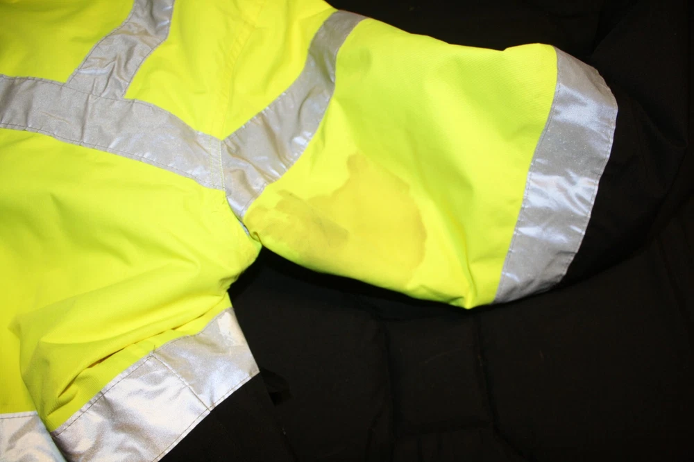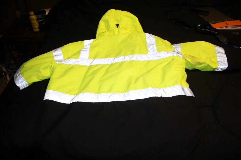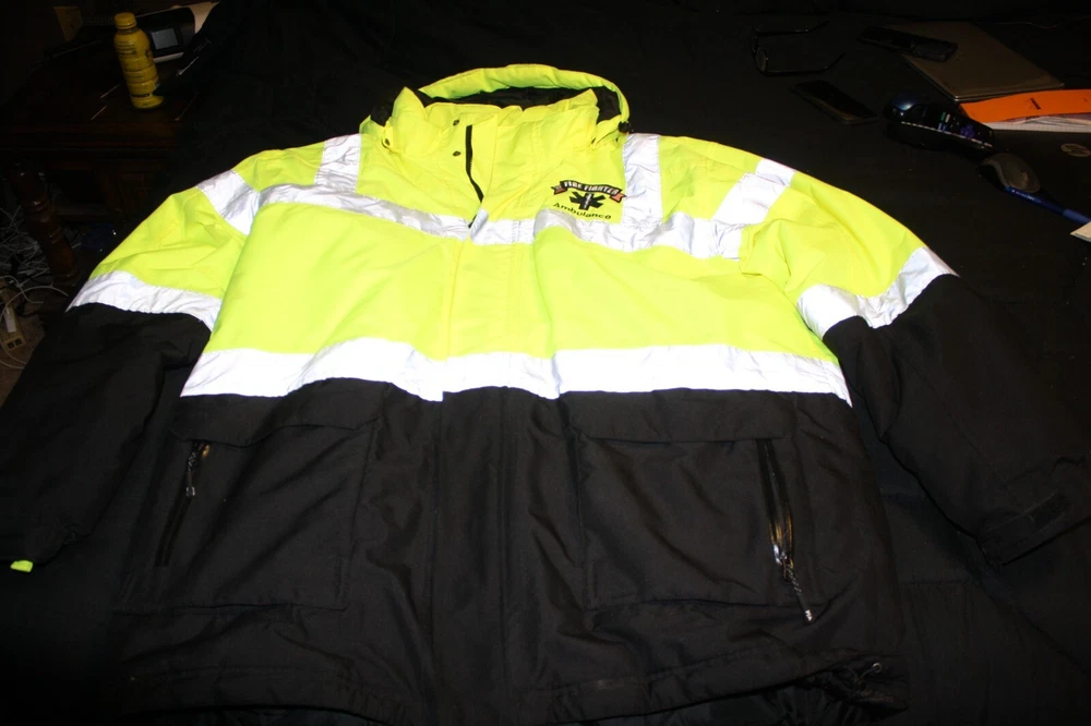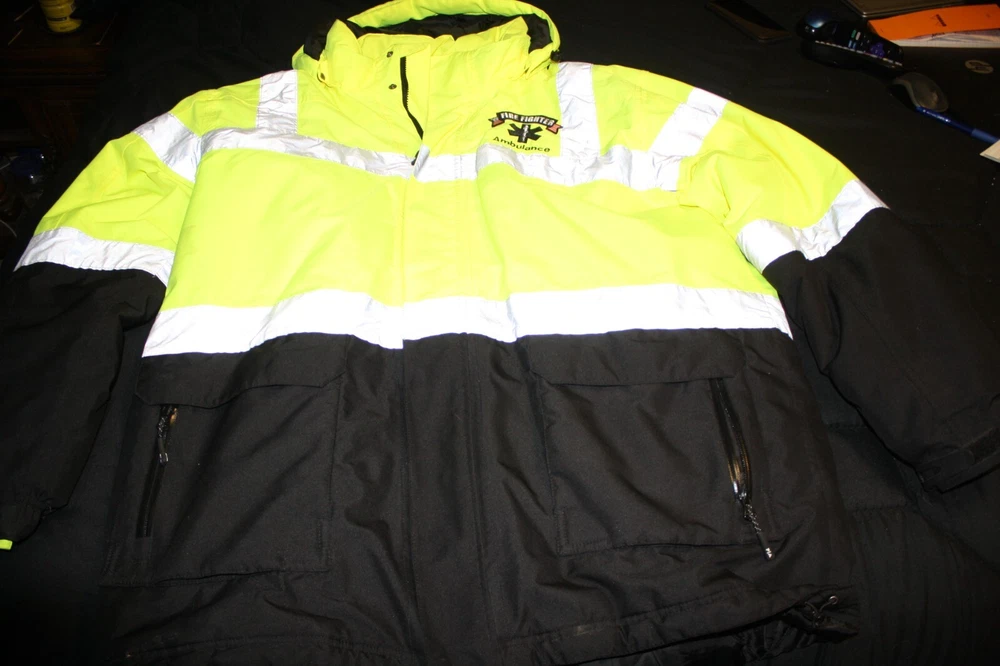 Stay warm and visible with the Port Authority Safety Coat, designed for men who value durability and comfort in their workwear. This heavyweight, insulated parka comes in a striking safety yellow with black accents, providing both style and safety on the job. The polyester outer shell, lining, and insulation ensure that you stay protected from the chill, making it an essential for winter workwear. Featuring a regular fit size XL, this coat provides ample room for movement while maintaining a snug silhouette. The coat also boasts a reliable zip closure, keeping out the cold and securing your belongings. With its adherence to ANSI 107 standards, this parka is not just practical, but also a compliance necessity for those in fire or emergency services. Stain on right arm see picture.
