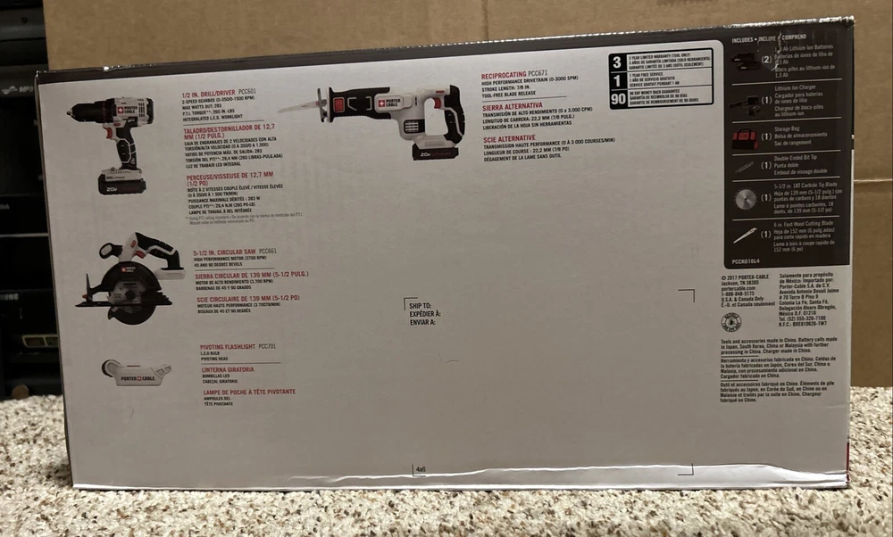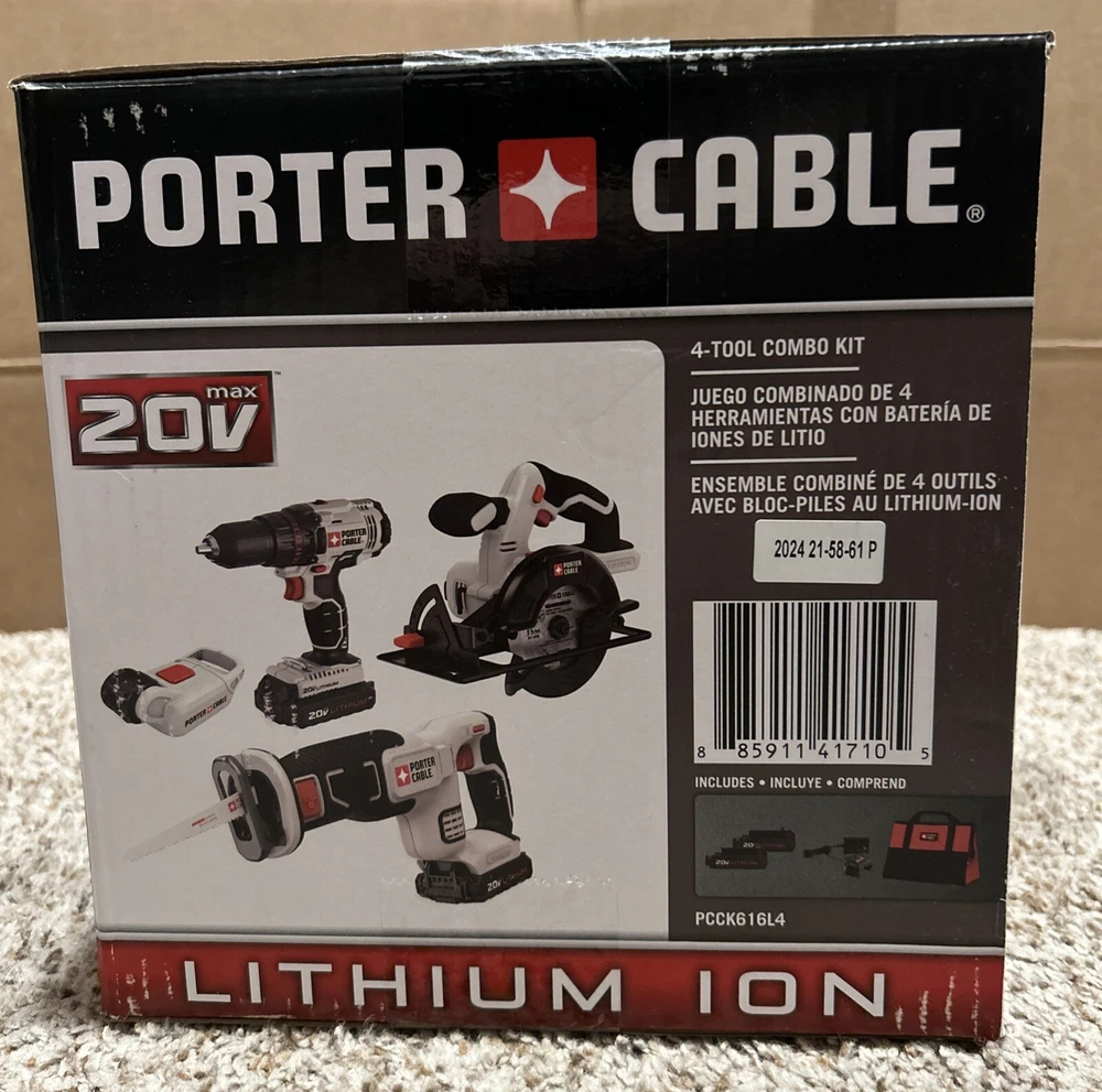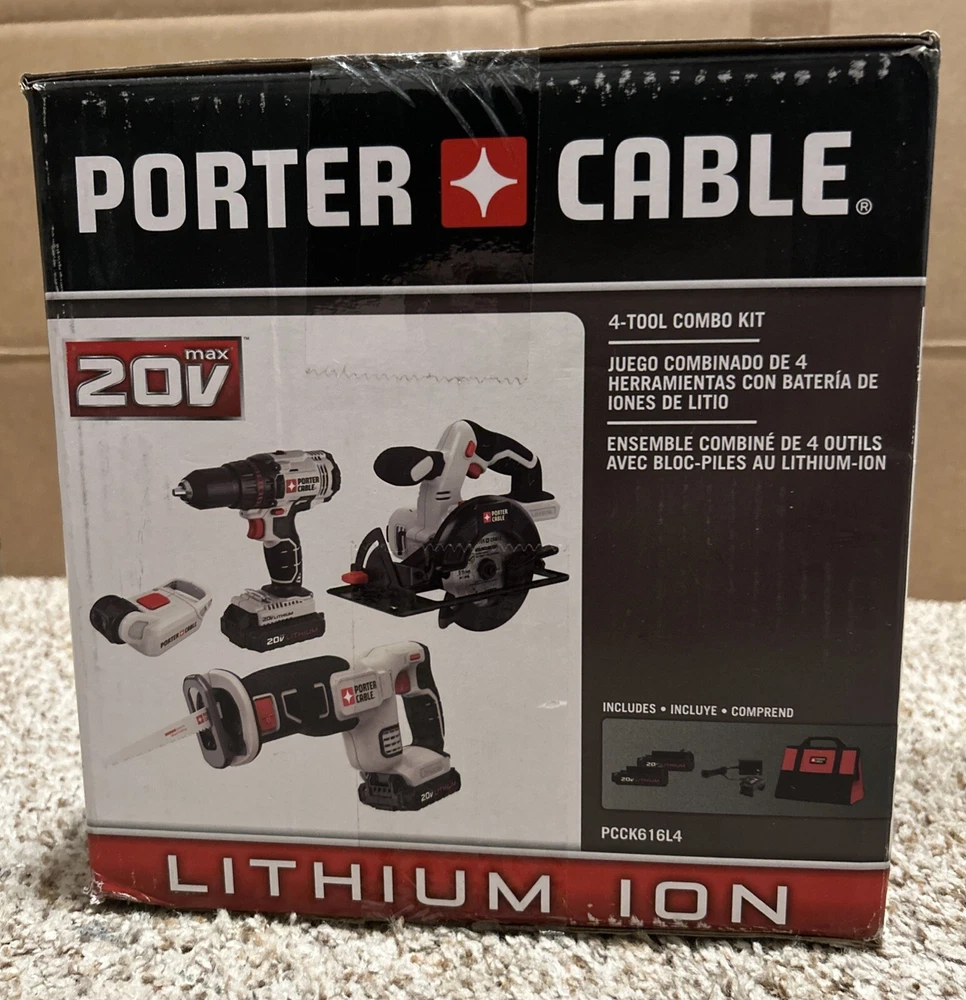 The PORTER-CABLE 20V MAX Combo Kit includes 4 power tools - a drill/driver, circular saw, reciprocating saw, and LED flashlight. It comes with 2 lithium-ion batteries and a charger for continuous use. The tools operate on a 20V voltage and are powered by brushed motors for efficient performance. This versatile kit by PORTER-CABLE is ideal for various home and workshop projects, offering convenience and reliability with its cordless design and included batteries.