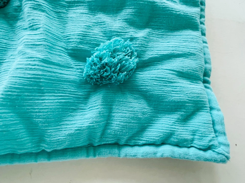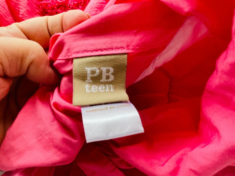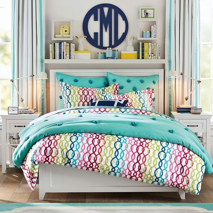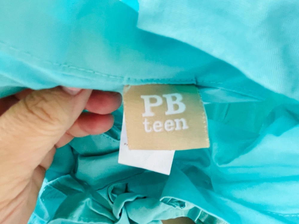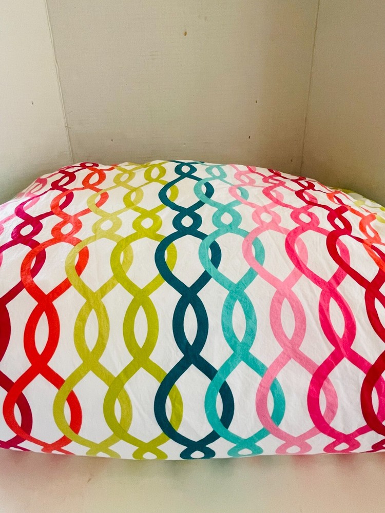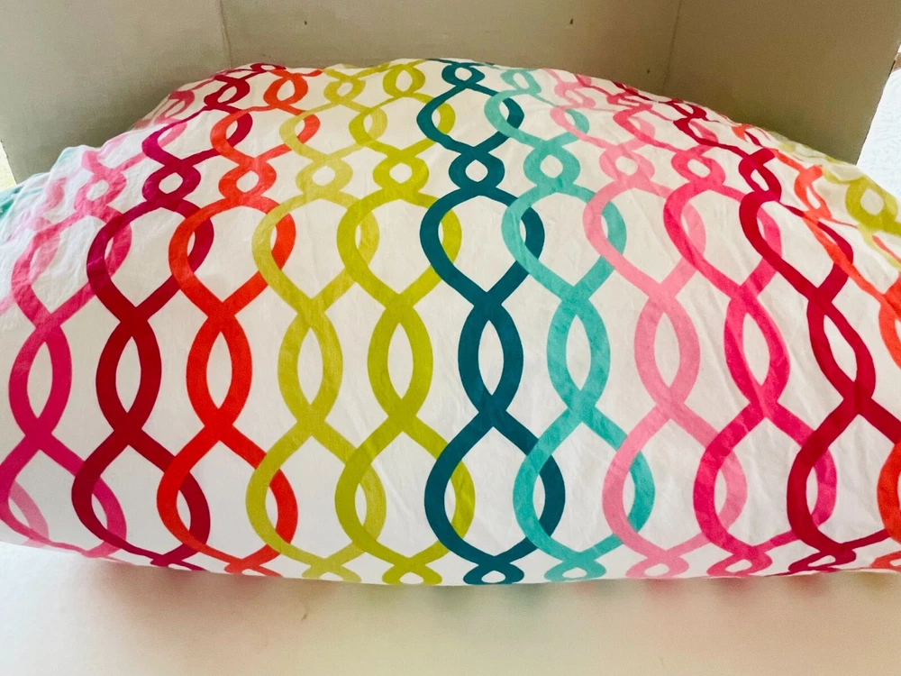 POTTERY BARN PB TEEN Palm Beach Multicolor Twin Duvet & Comforter & Shams Set Geometric Colorful Twin Duvet 100% Cotton Button Closure Twin Comforter for Duvet is included 2 Pom Pom Pink Shams 1 Pom Pom Green Sham Tie Closure 62% Cotton 38% Polyester Standard Size- 20 x 26 inches Very Good Condition