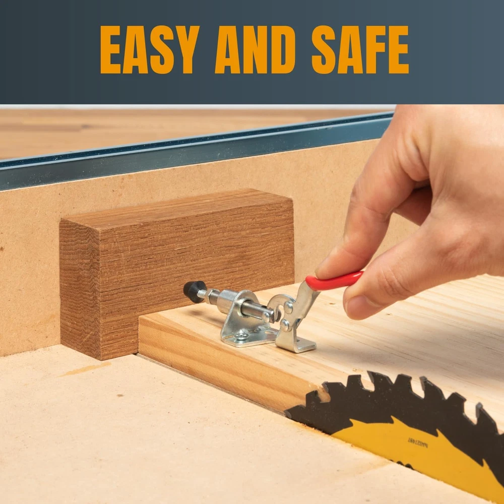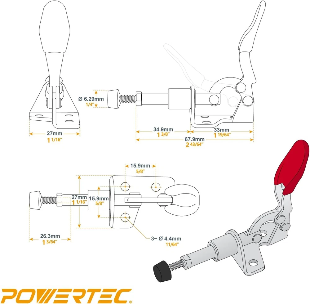 INCLUDES: (6) Push pull quick release toggle clamp (Type-301A) FUNCTION: Push/pull action can quick and easy adjustability means customizing clamp to stock thickness and placement is hassle free. Large, plastic handle maximizes user comfort, safety and control PREMIUM DESIGN: Constructed of zinc-plated, cold-rolled carbon steel for optimal durability and wear-resistance, and the unique design features a high-utility cam/lever system to insure the ultimate in fastening security and stability. HOLDING CAPACITY: 100 lbs SPECS: Clamping Base Dimension: 1-5/16" to 1-1/16"; Mounting slot measures: 5/32" DIA; Clamping range extends from 1-3/16" to 2-1/4"; Bolt length (including rubber feet): 1"; Clamp height capacity when fastened: 1-7/8"; Total Clamp length (including handle) during use: 3" to 3-9/16" The POWERTEC 20323 Push/Pull Quick-Release Toggle Clamps , 100 lbs Capacity, 301A , 4PK , deliver a rock-solid grip on your stock when your project requires a push/pull holding-action that locks your workpiece, flush and tight, against a positive stop. Their unique design features a high-utility cam/lever system to insure the ultimate in fastening security and stability. FEATURES Their quick and easy adjustability means customizing clamp to stock thickness and placement is hassle free. To utilize, just easily install base onto your jig/fixture, adjust the reach to suit your projects specific requirements, and pull handle back to insure optimal pushing force on your stock - it's that easy. The rubber clamping foot won't mar your stock surface, and the large, plastic handle supplies a comfortable and ergonomic grip. SPECS Clamping Base Dimension: 1-5/16" to 1-1/16" Mounting slot measures: 5/32" DIA Clamping range extends from 1-3/16" to 2-1/4" Bolt length (including rubber feet): 1" Clamp height capacity when fastened: 1-7/8" Total Clamp length (including handle) during use: 3" to 3-9/16"